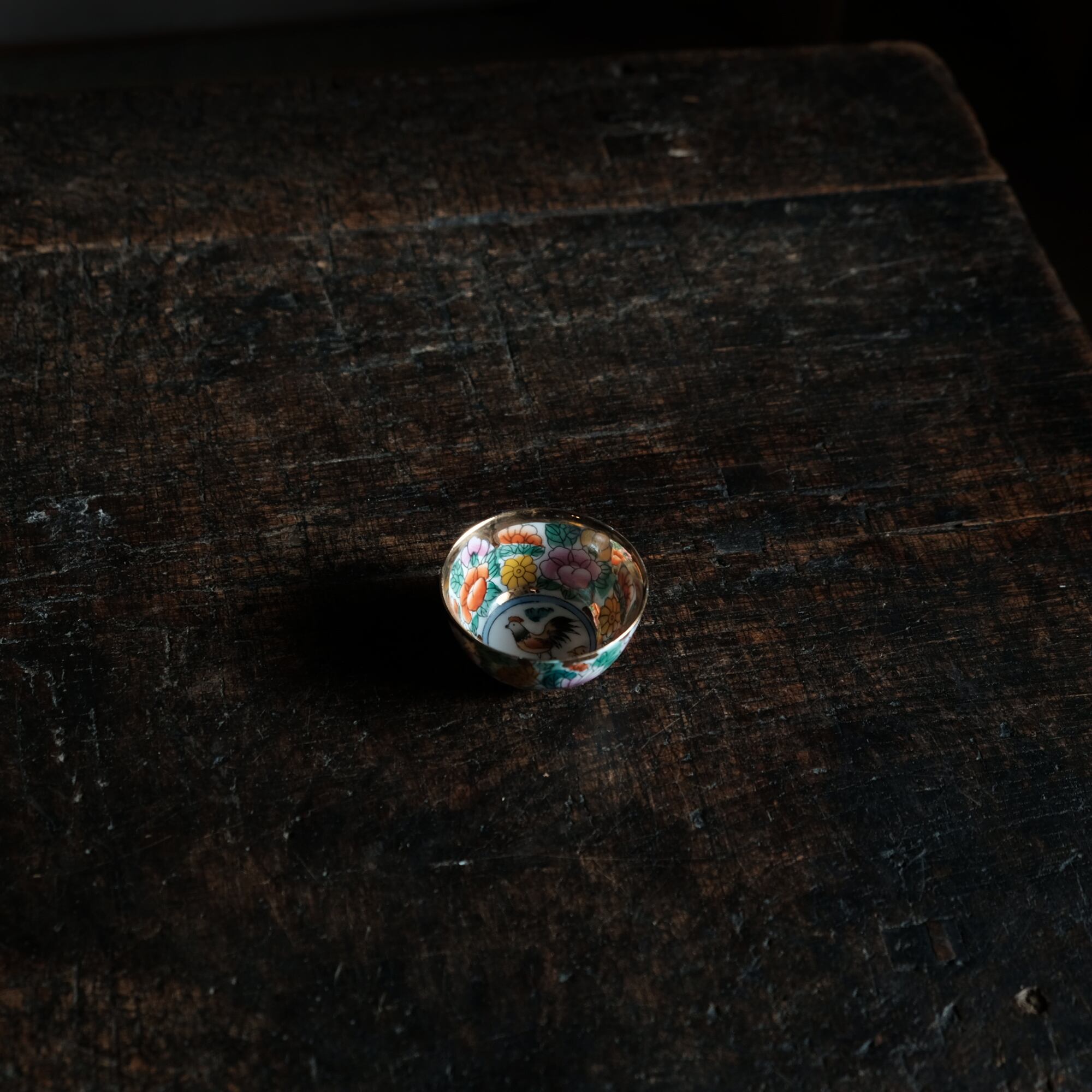 見込みに鶏(酉)◆草花と果実。中国景徳鎮 干支文色絵金彩小ぶり猪口 チャイナレトロ シノワズリ b5