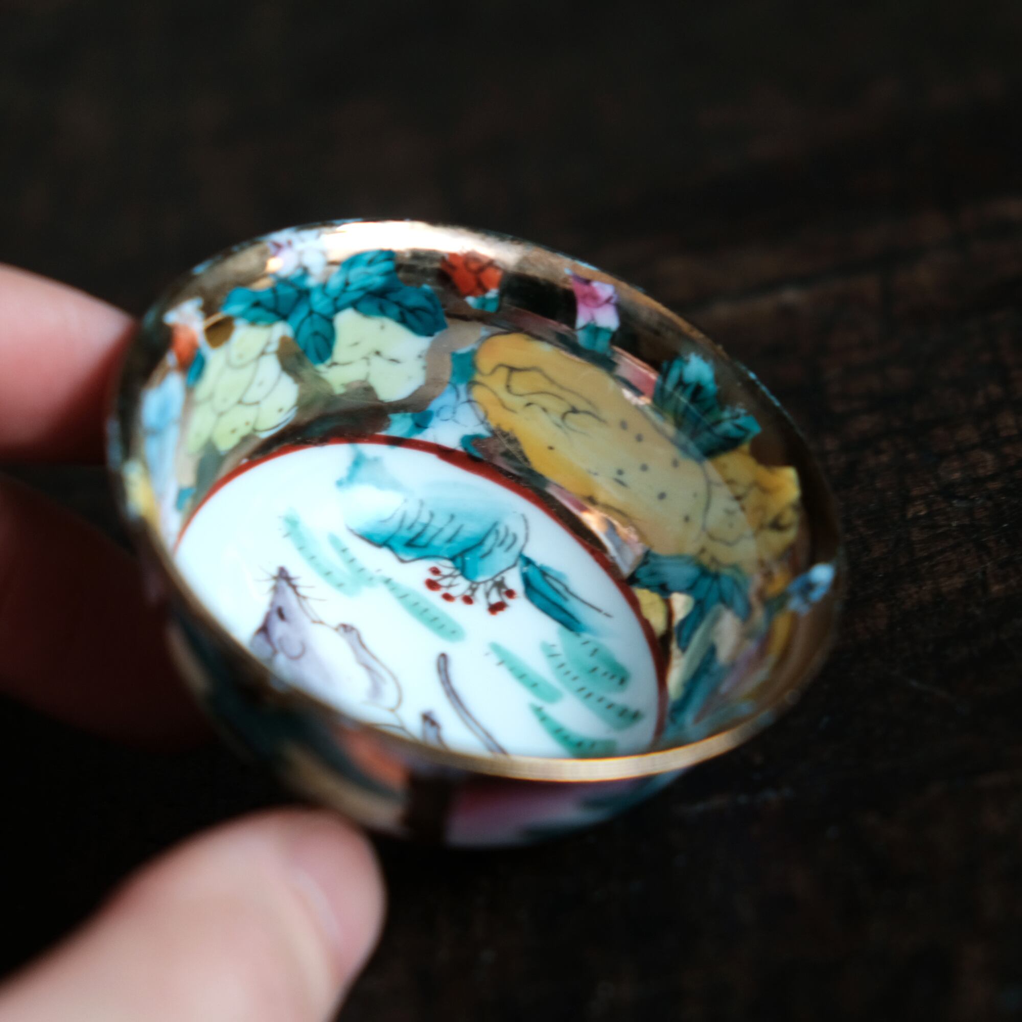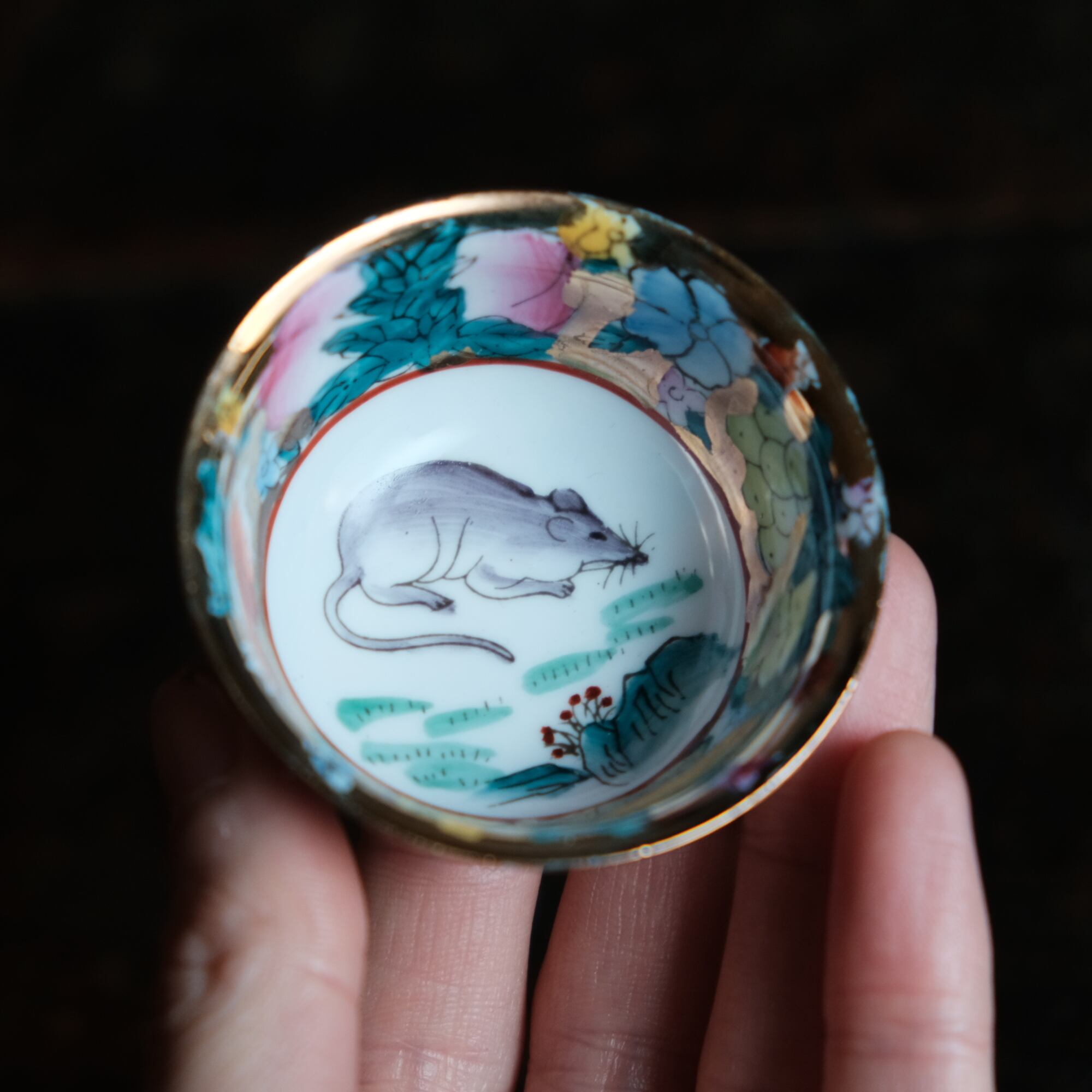 希少なサイズ感◆見込みに鼠(子)中国産 干支文色絵金彩猪口 花尽くし。シノワズリ チャイナレトロ