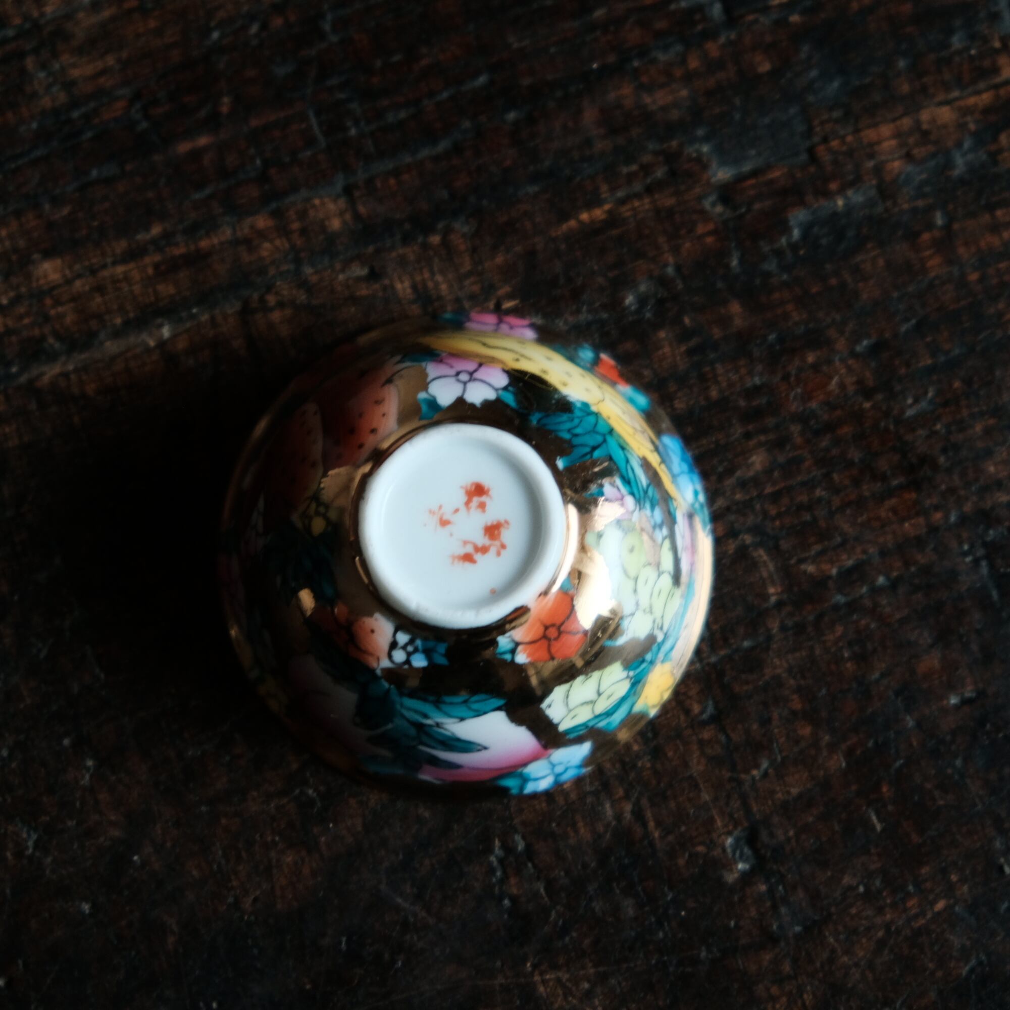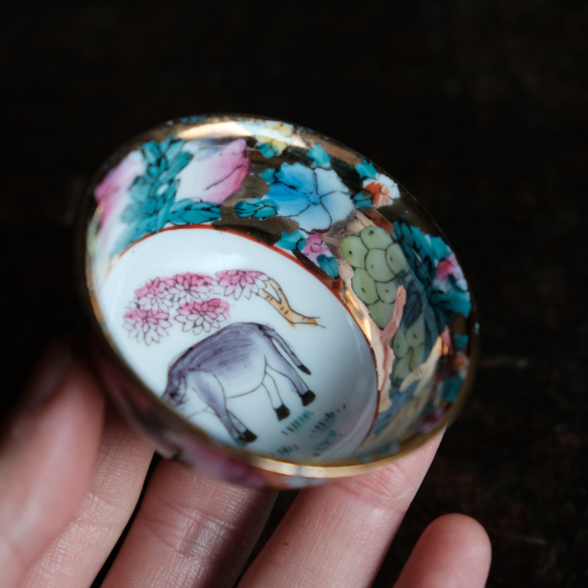 希少なサイズ感◆見込みに牛(丑)中国産 干支文色絵金彩猪口 花尽くし。シノワズリ チャイナレトロ