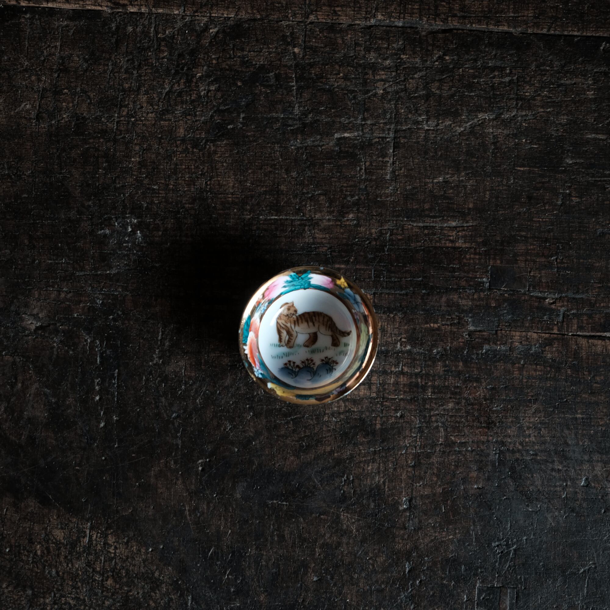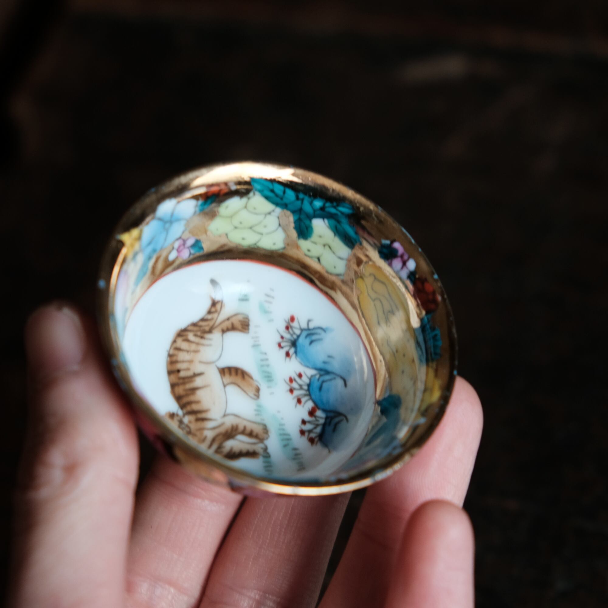 希少なサイズ感◆見込みに虎(寅)中国産 干支文色絵金彩猪口 花尽くし。シノワズリ チャイナレトロ