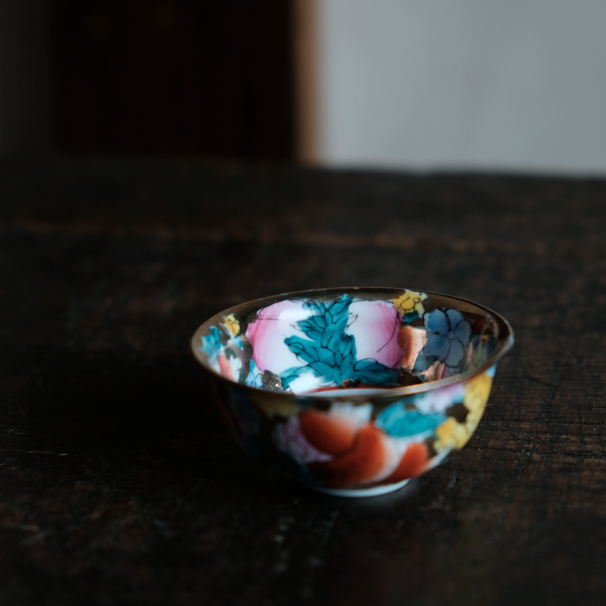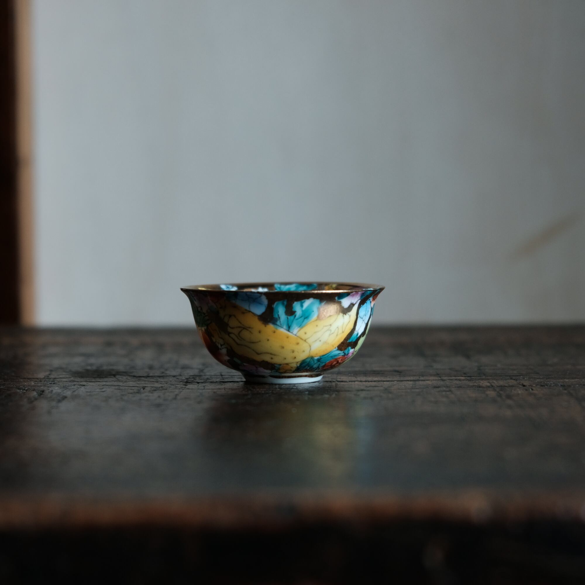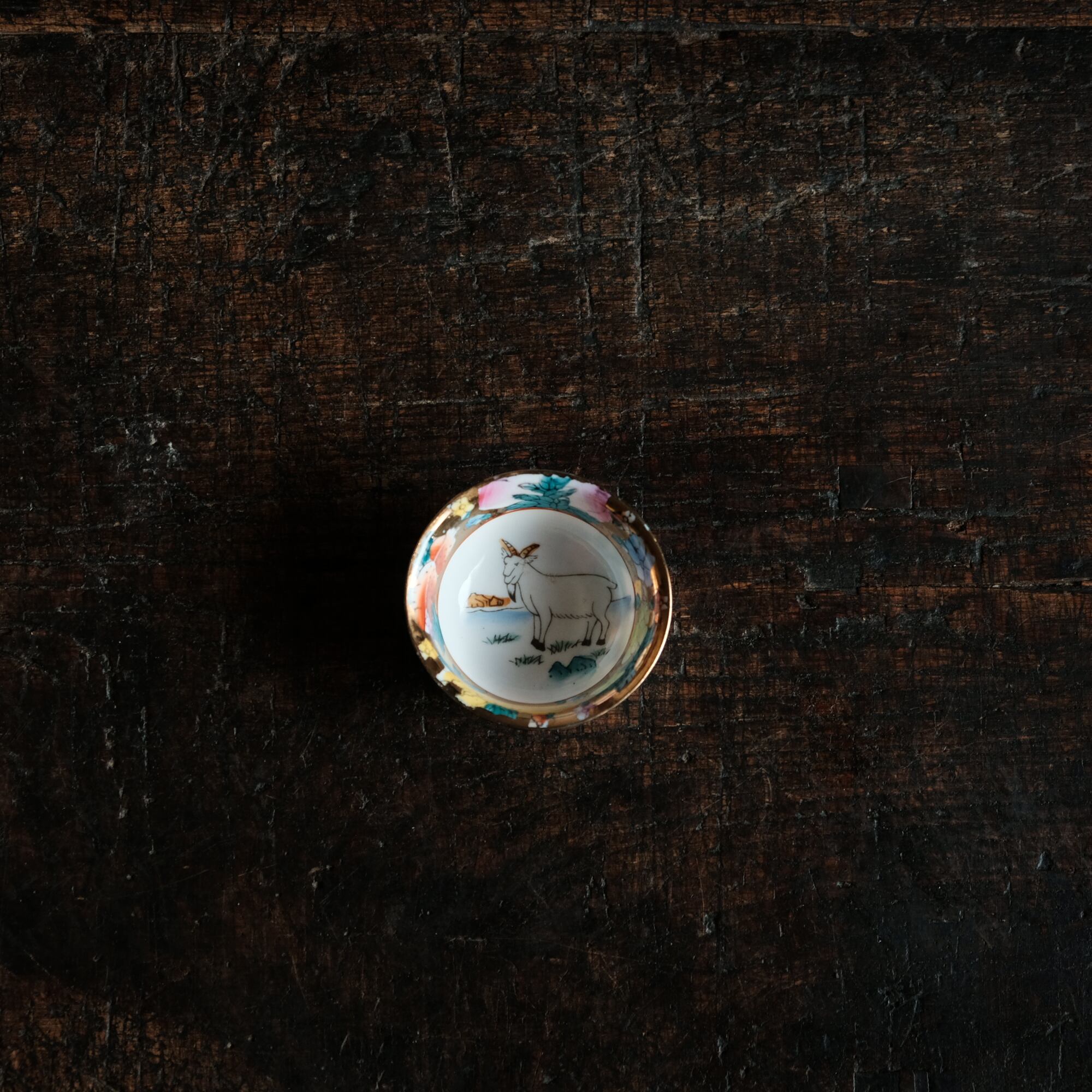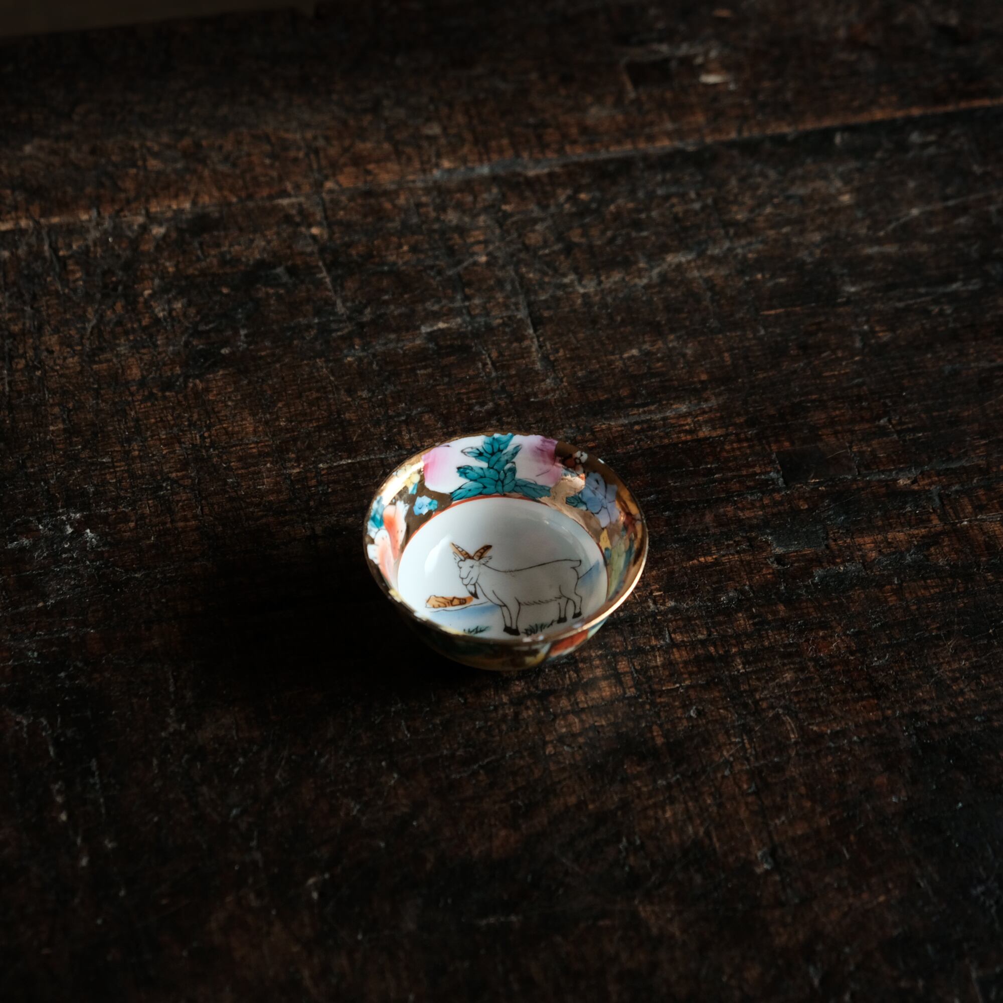 希少なサイズ感◆見込みに山羊(未)中国産 干支文色絵金彩猪口 花尽くし。シノワズリ チャイナレトロ