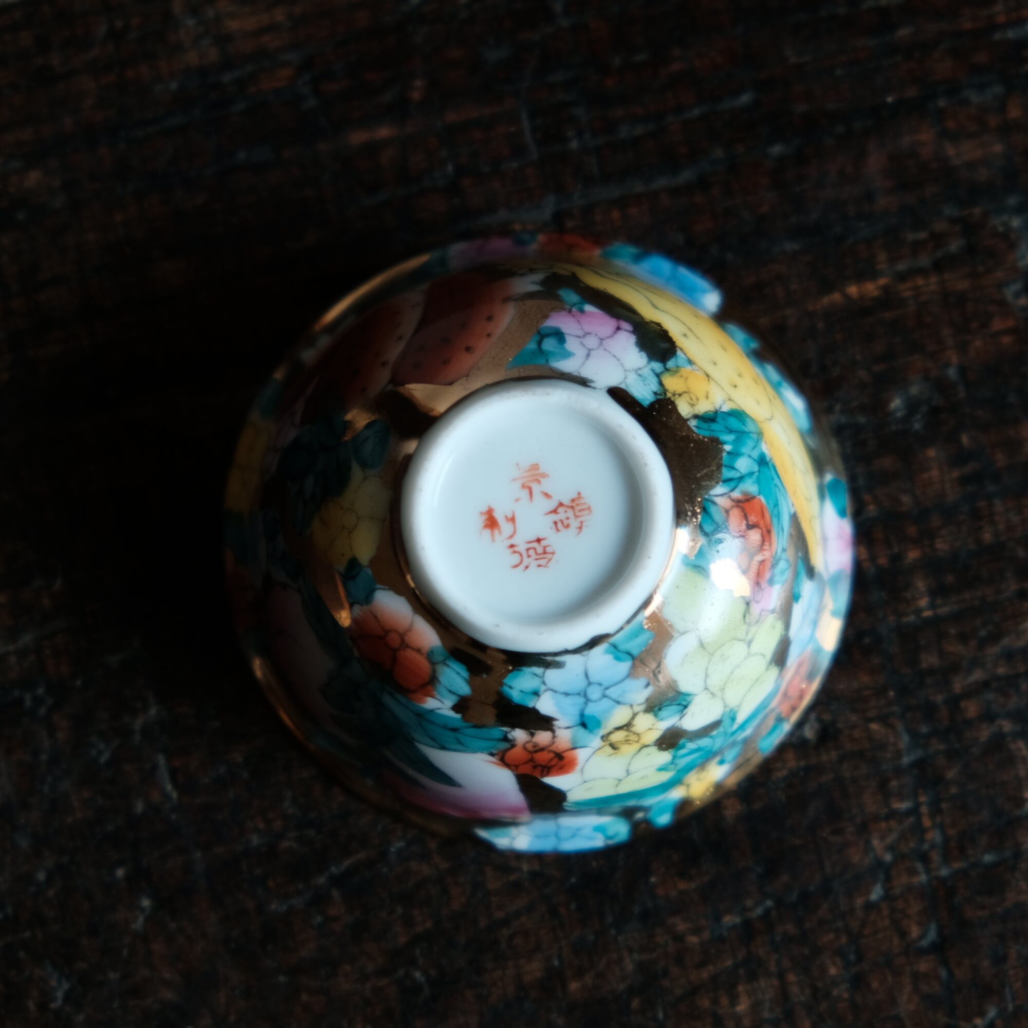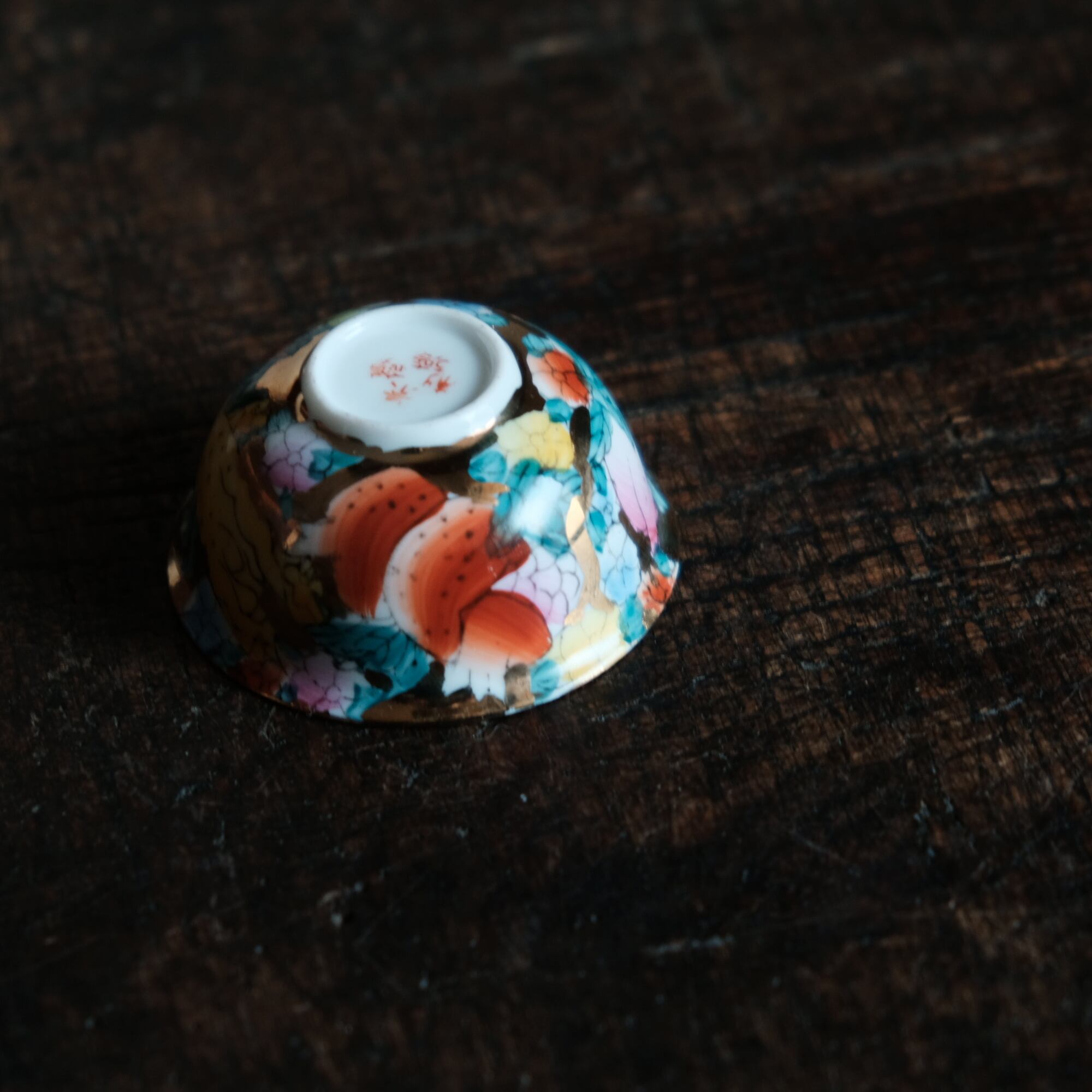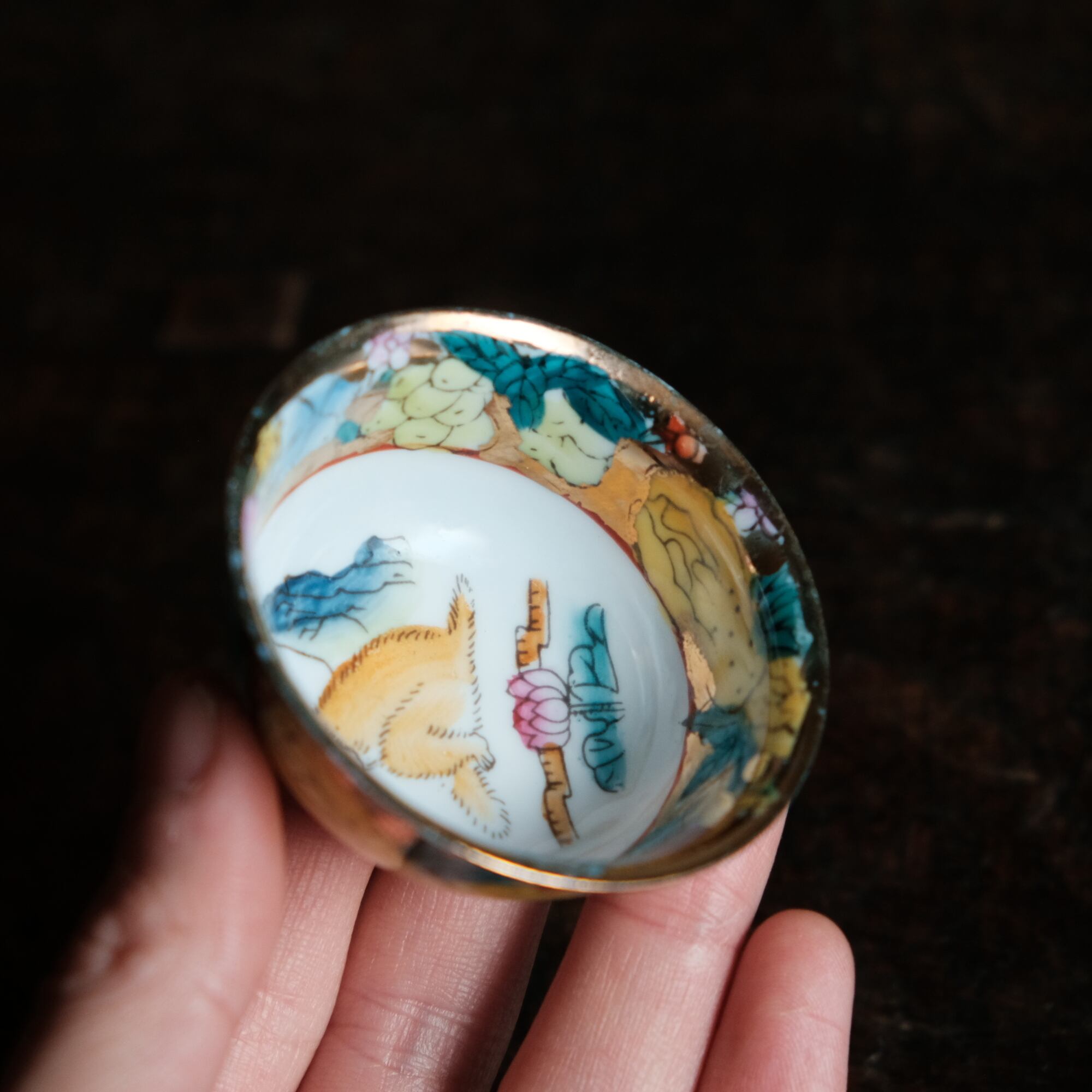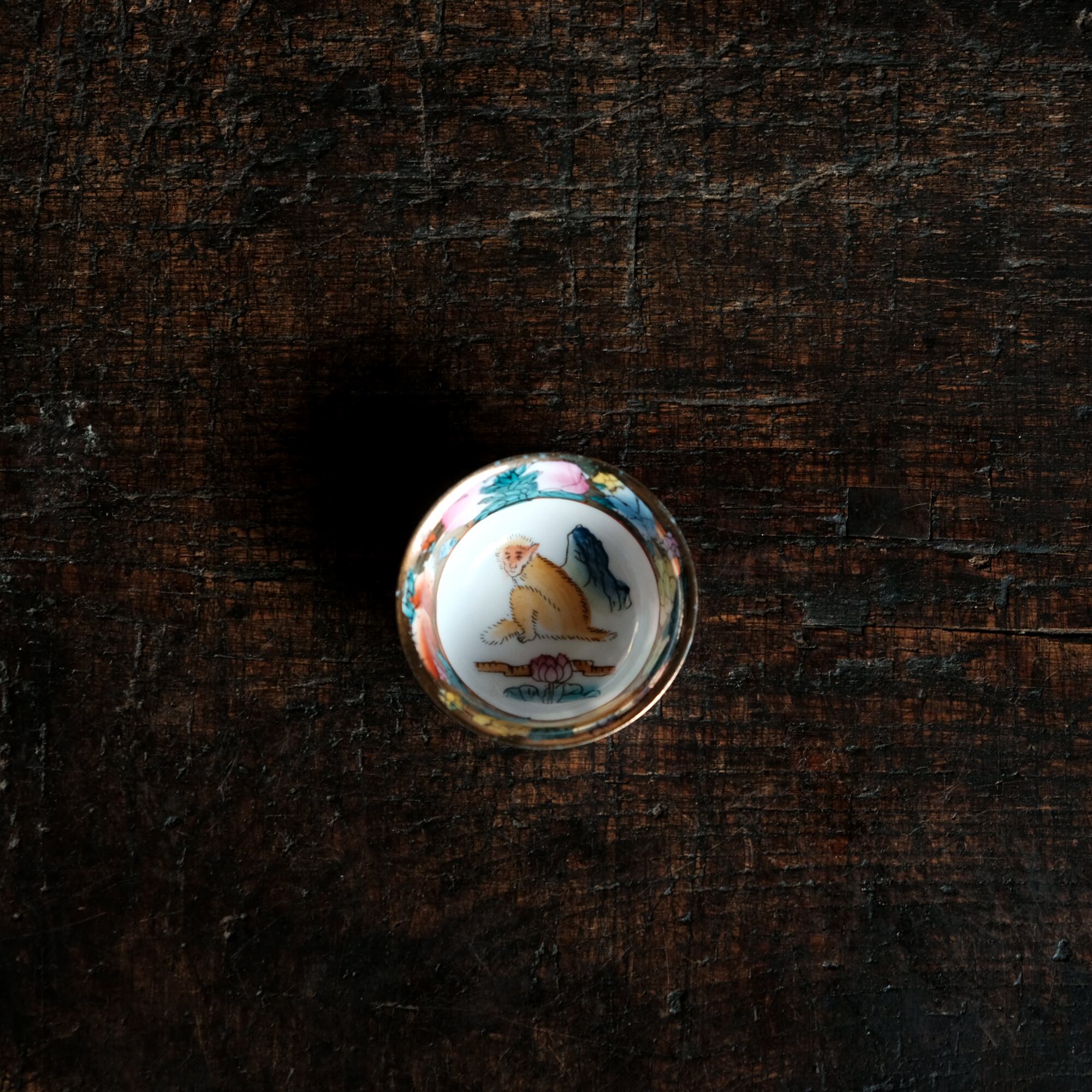 希少なサイズ感◆見込みに猿(申)中国産 干支文色絵金彩猪口 花尽くし。シノワズリ チャイナレトロ