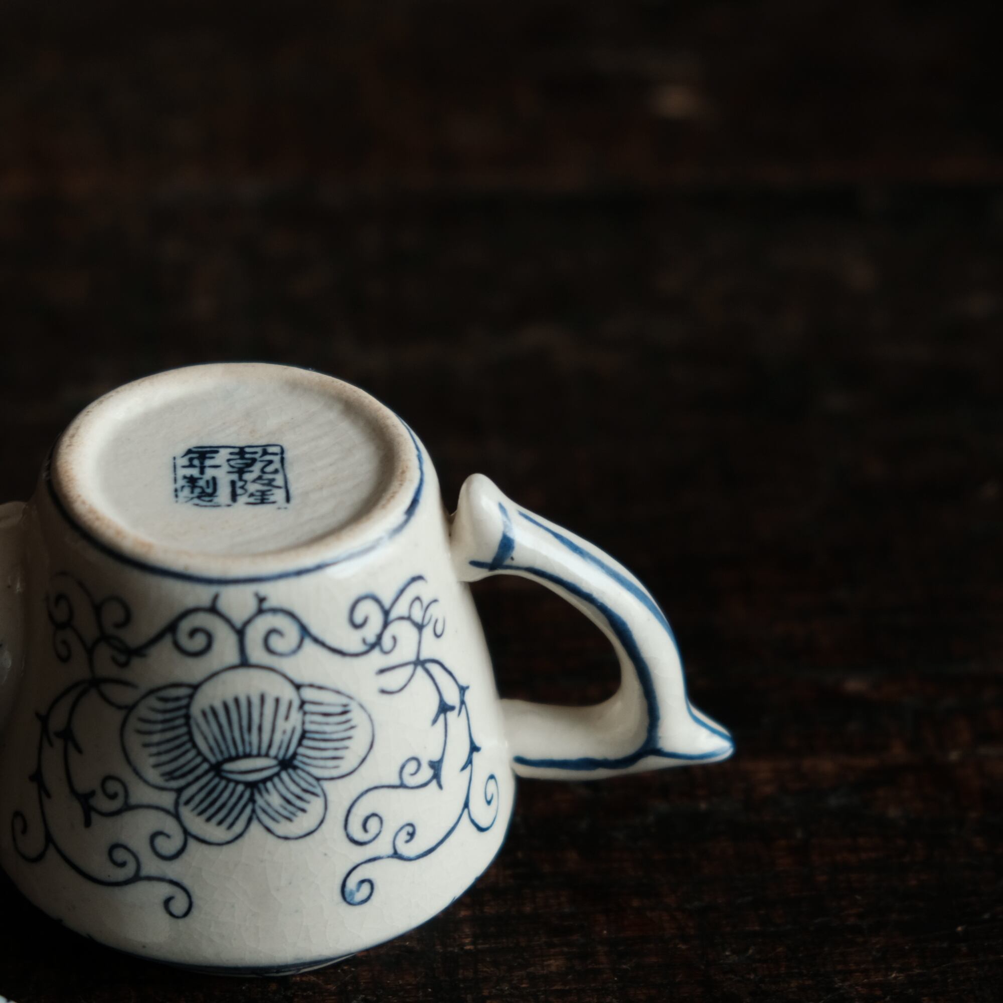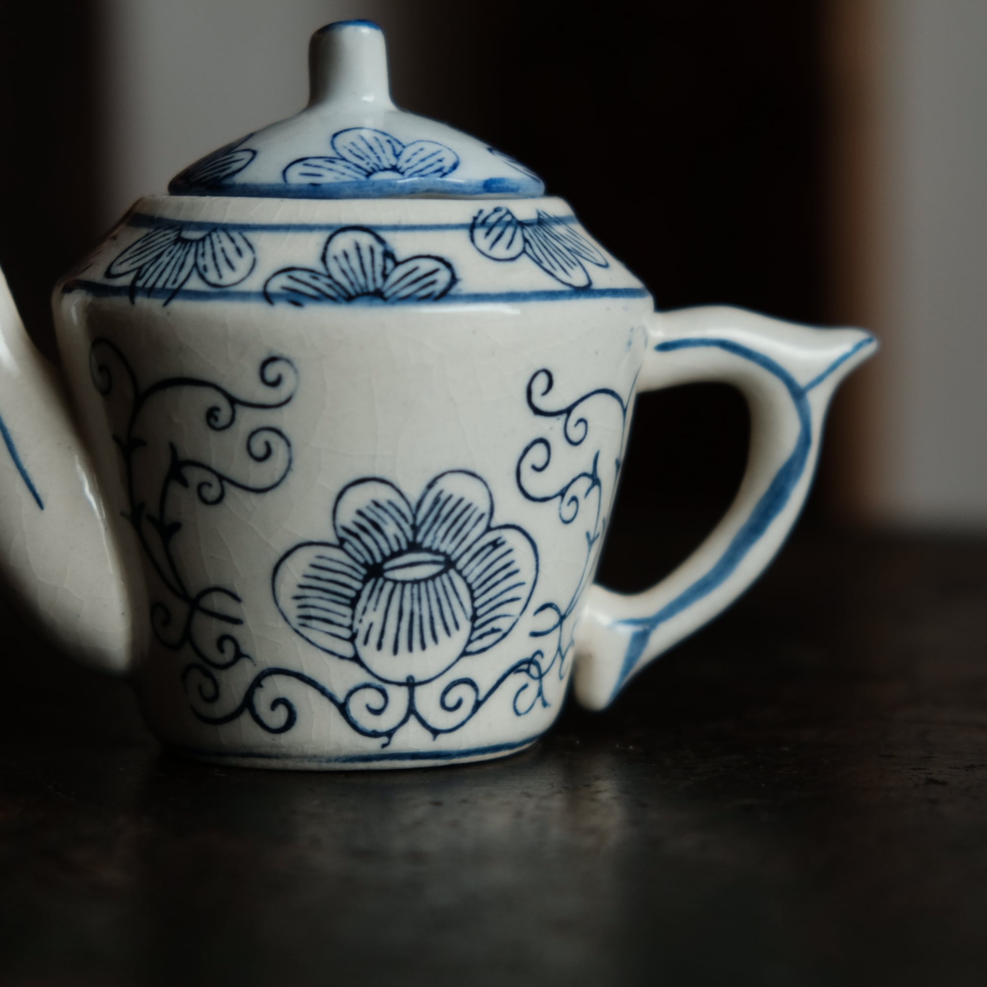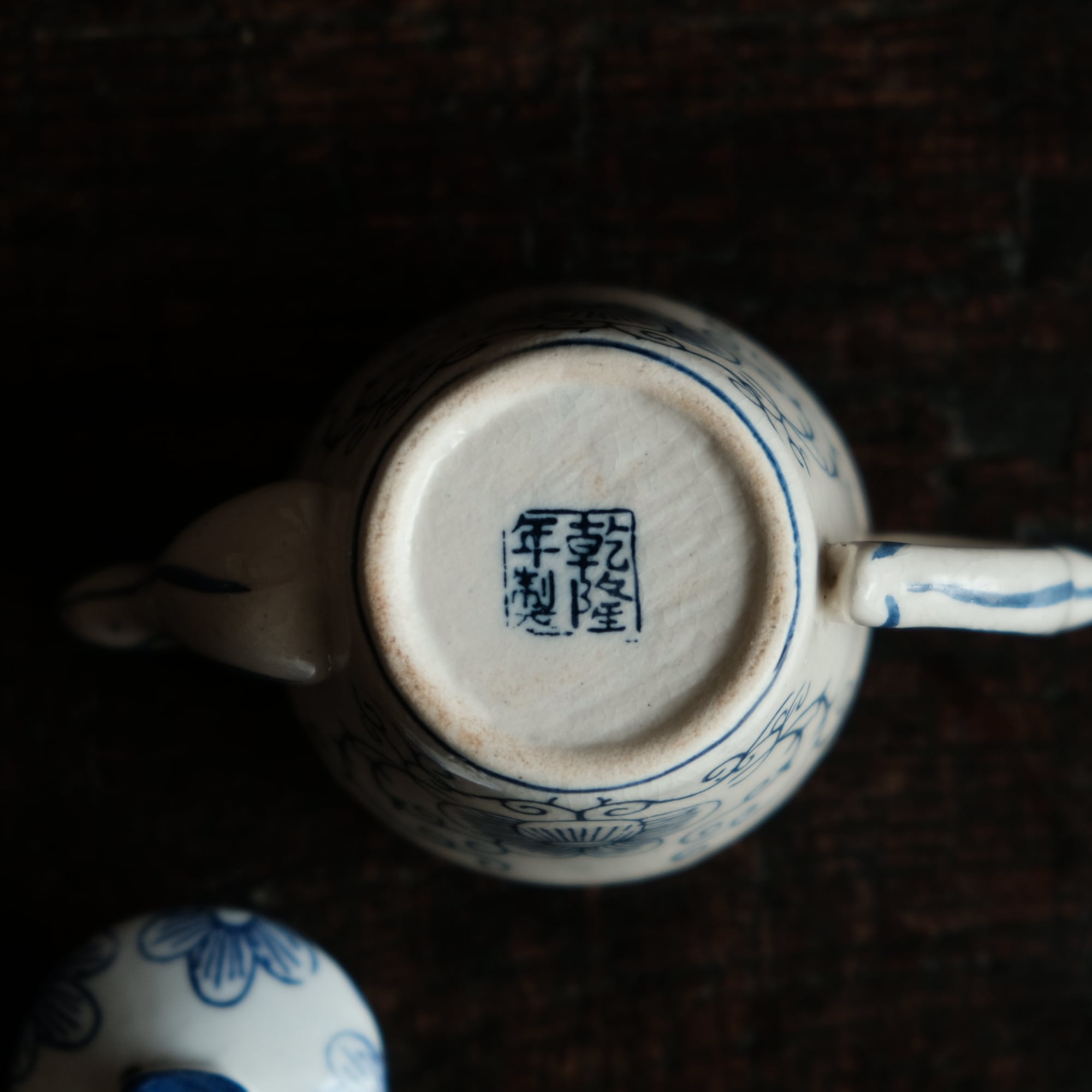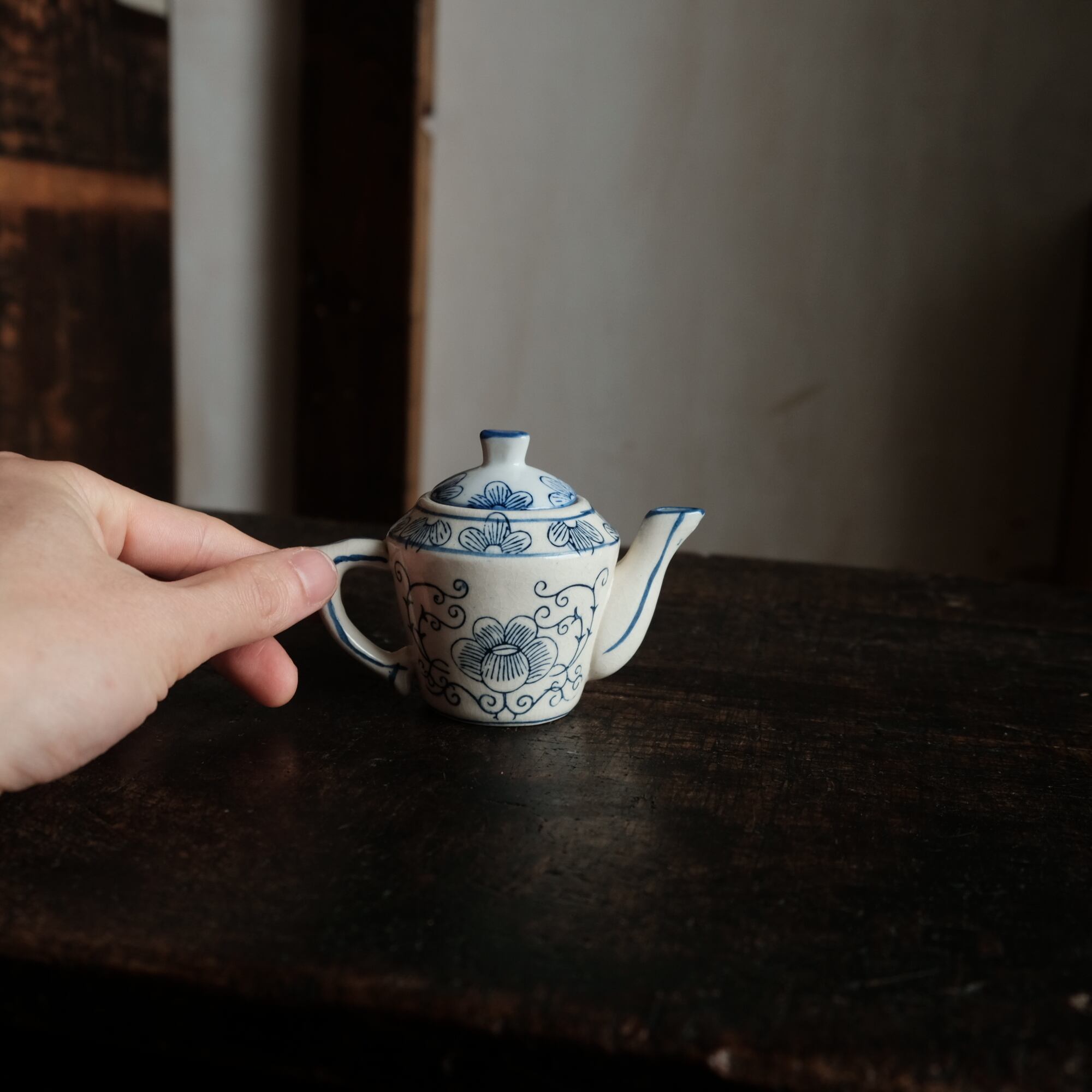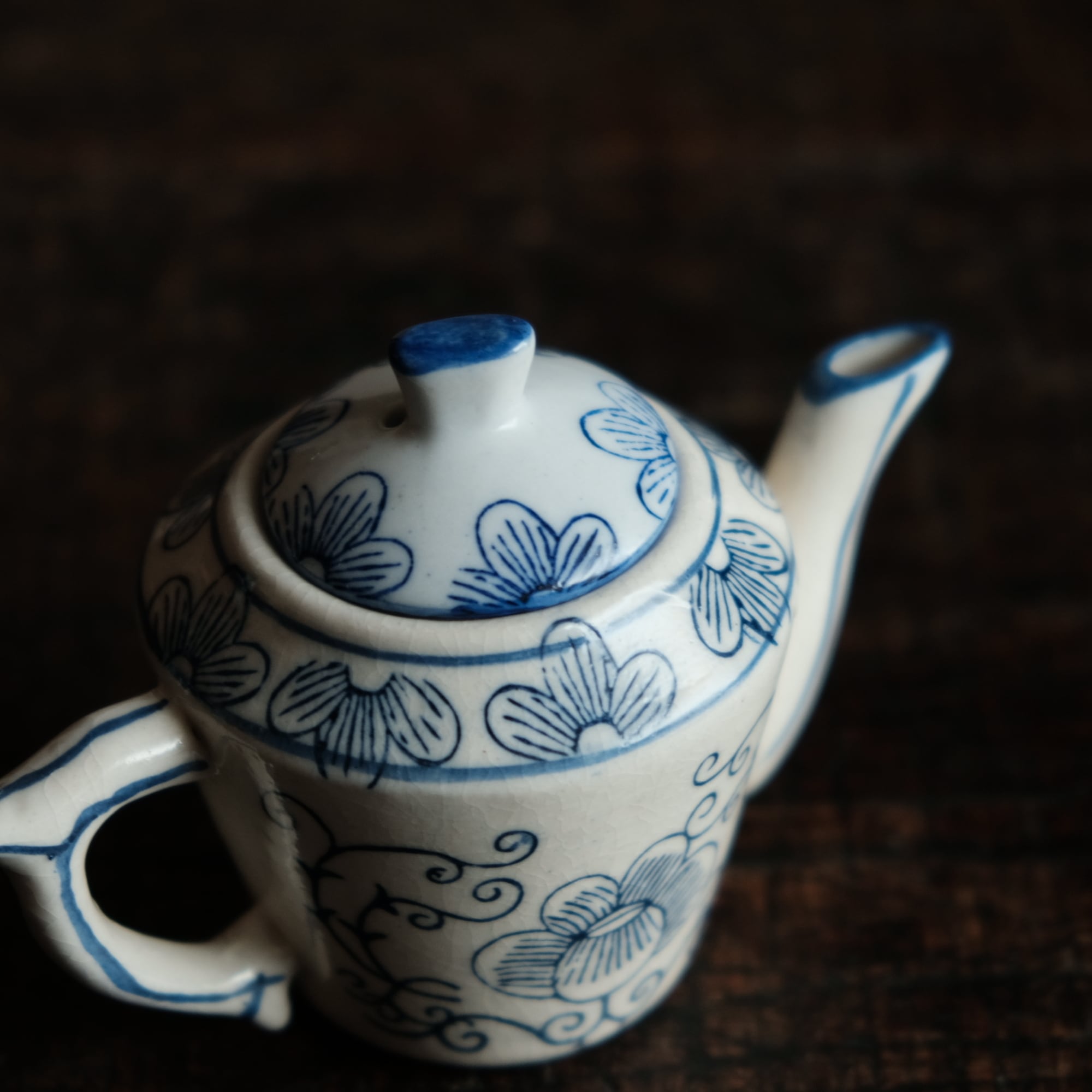 乾隆年製◆中国産 花唐草文染付小ぶり急須 煎茶茶器 中国茶 インテリアオブジェ シノワズリ 【アマテ】