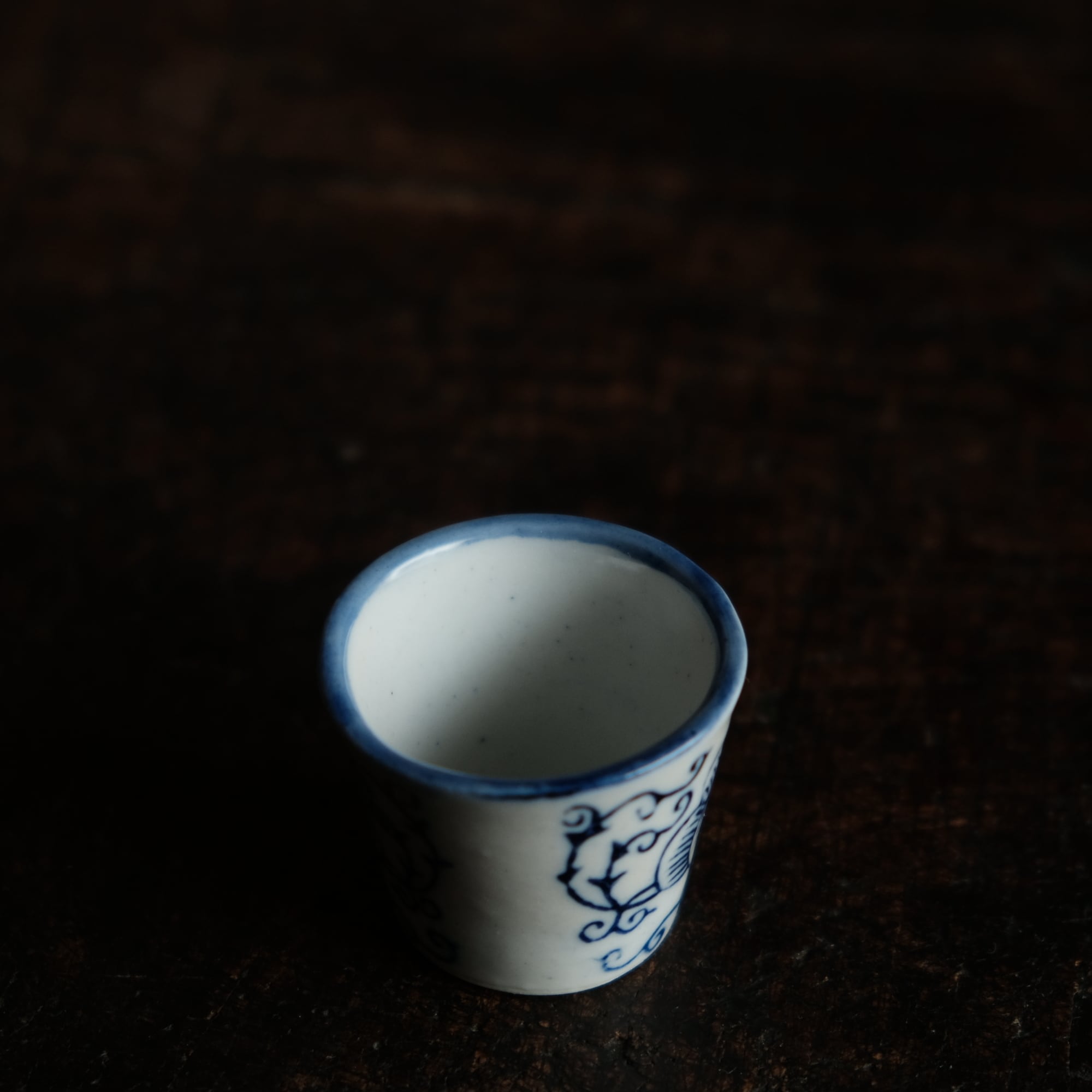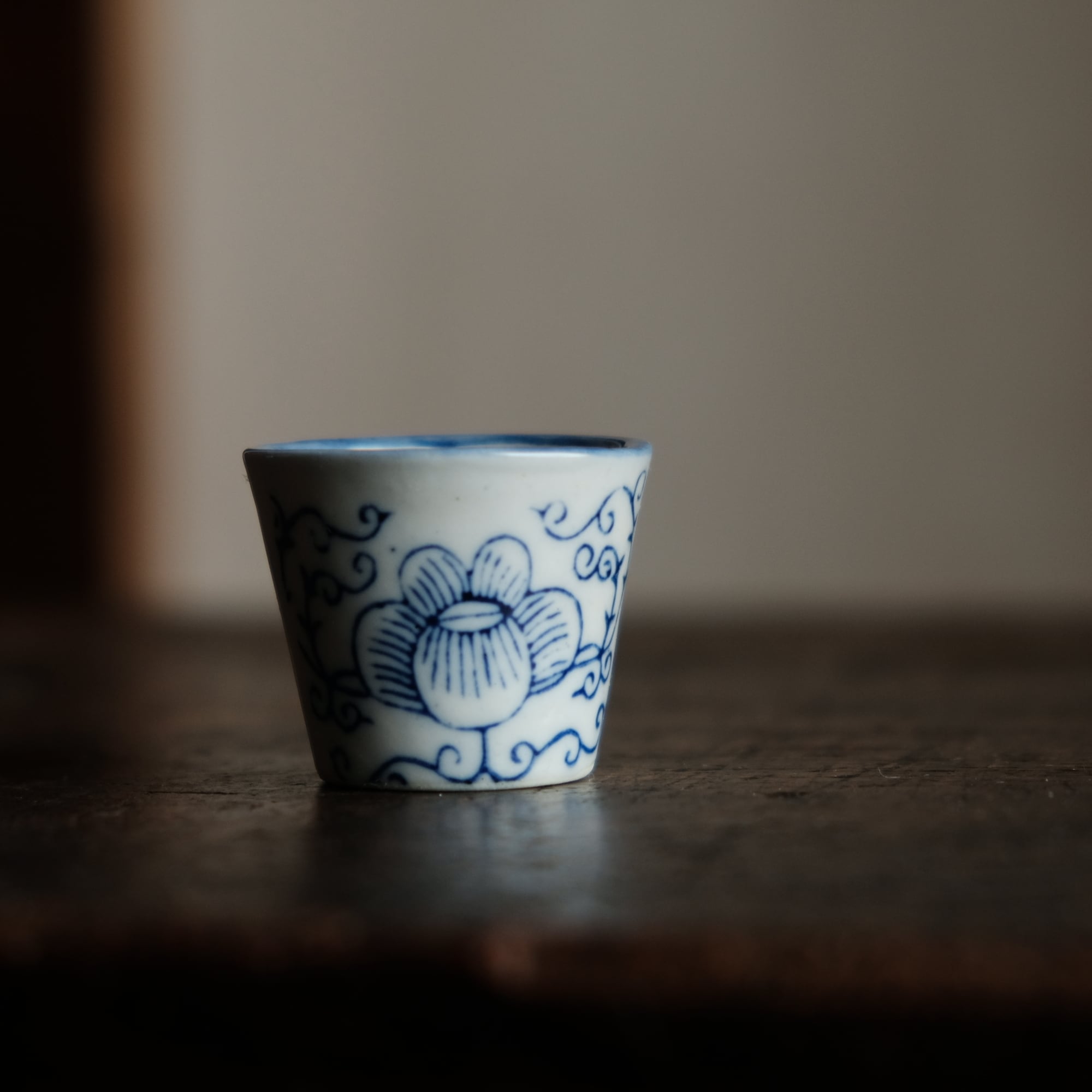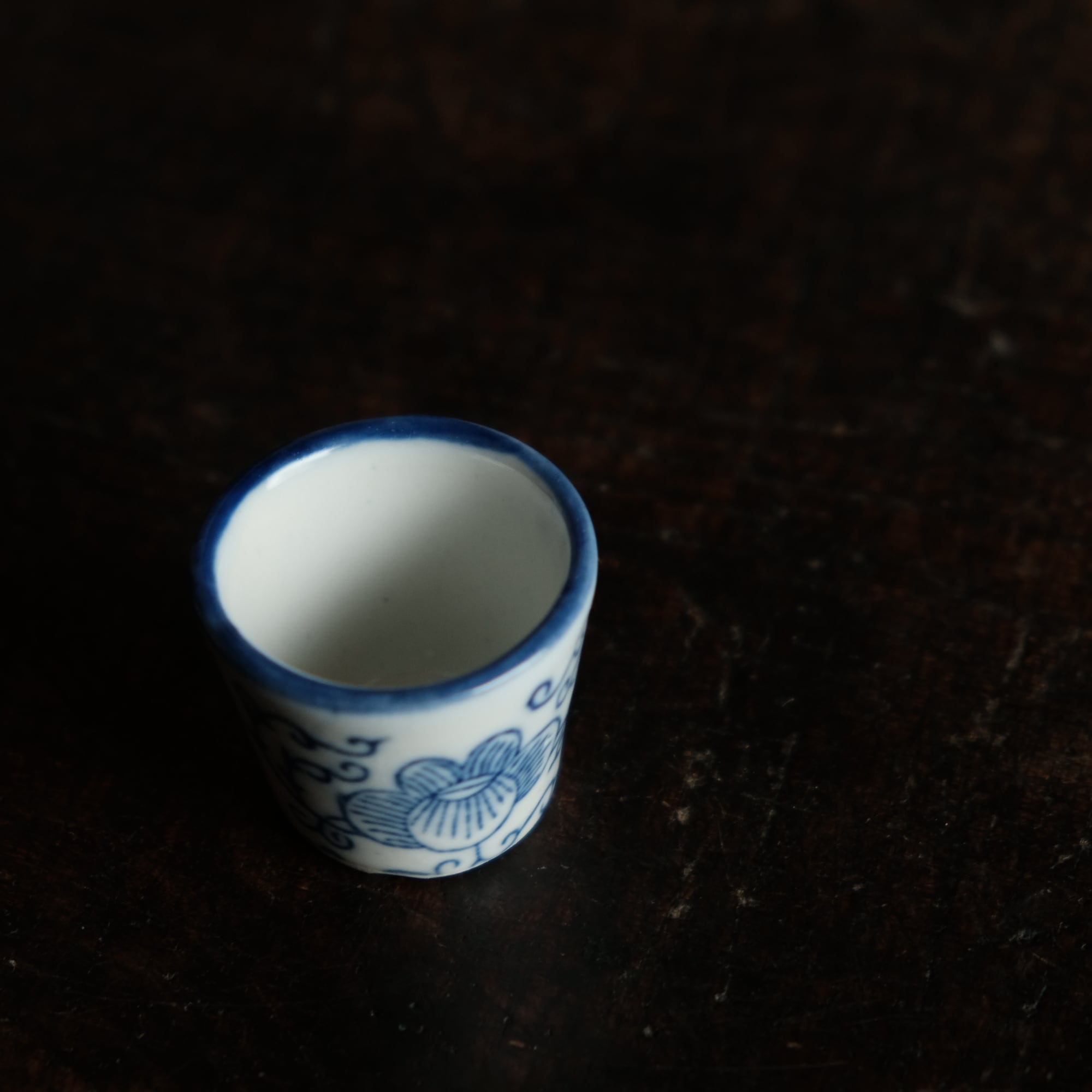 シノワズリな雰囲気◆中国産 花唐草文染付小ぶり猪口 茶杯 インテリアオブジェ チャイナレトロ 煎茶茶器