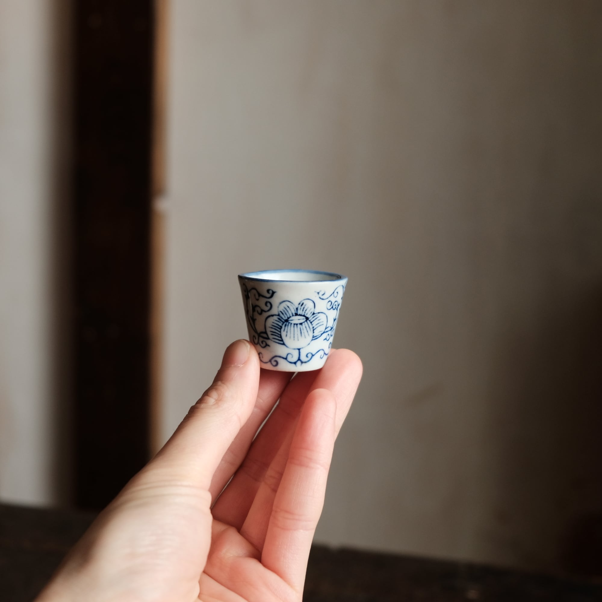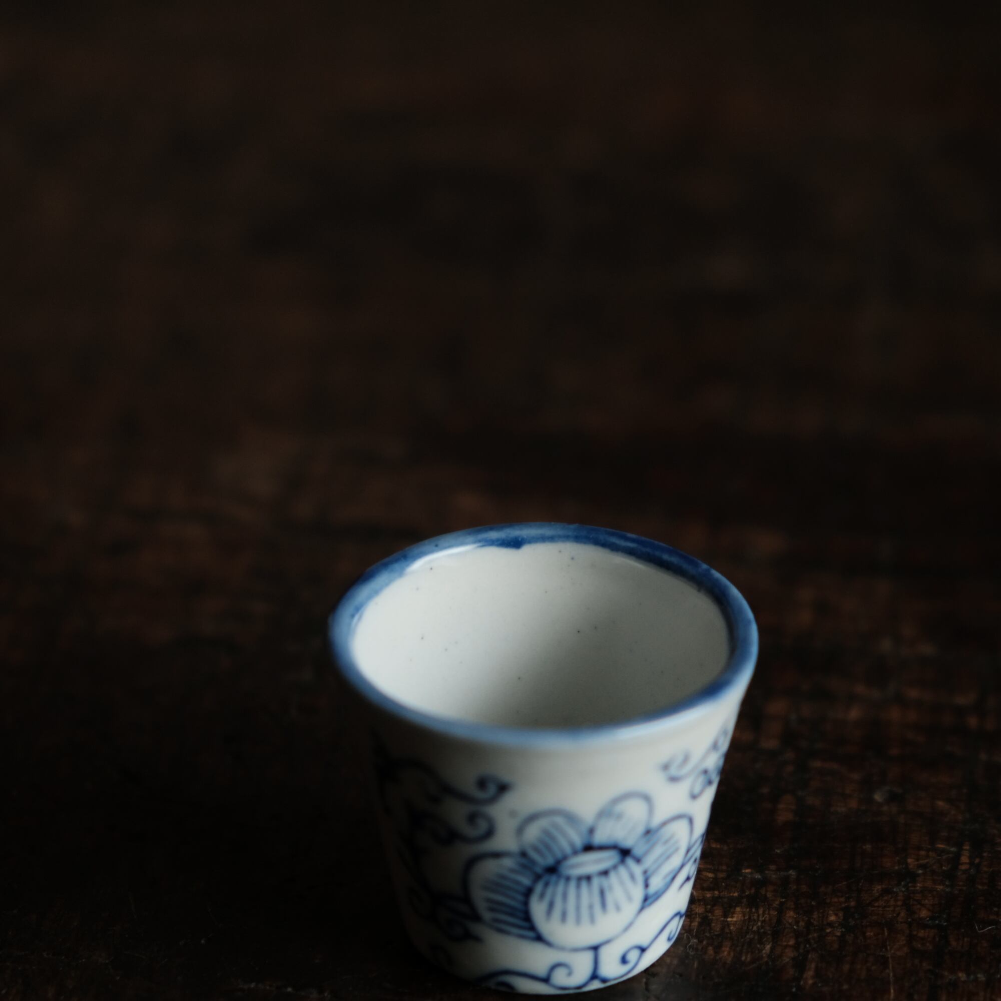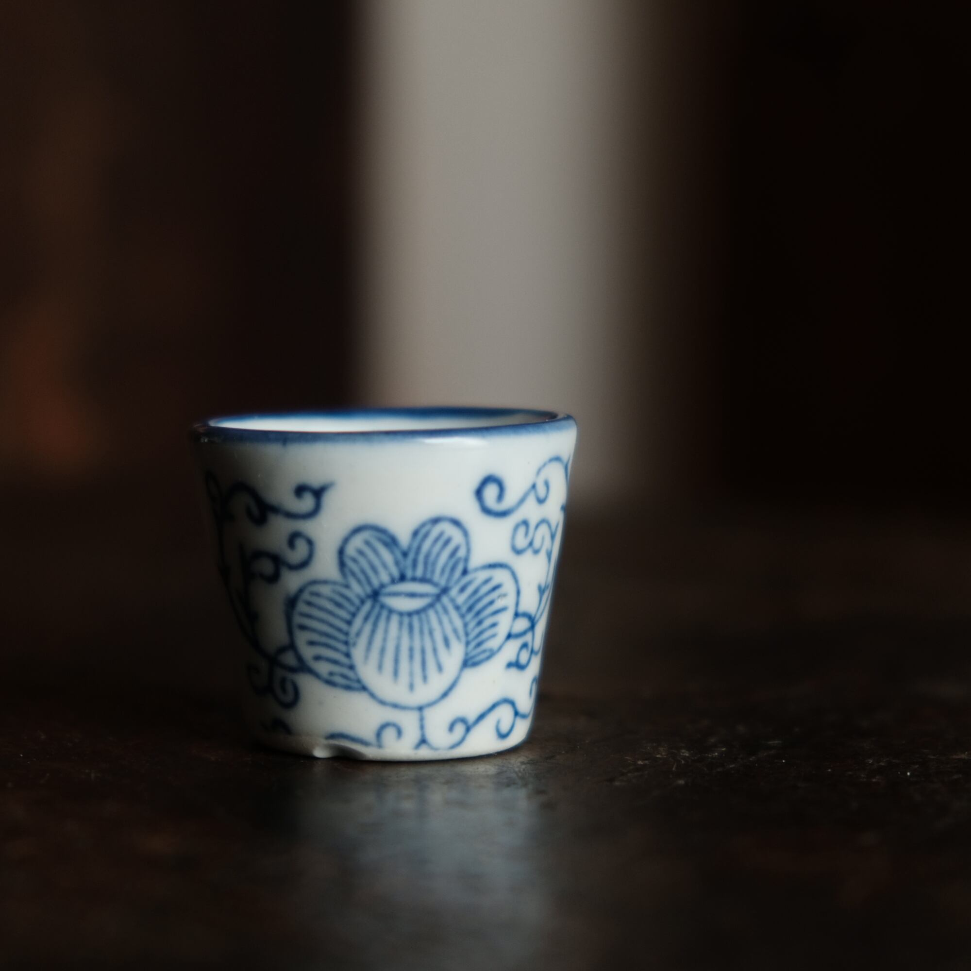 シノワズリな雰囲気◆中国産 花唐草文染付小ぶり猪口 茶杯 インテリアオブジェ チャイナレトロ 煎茶茶器