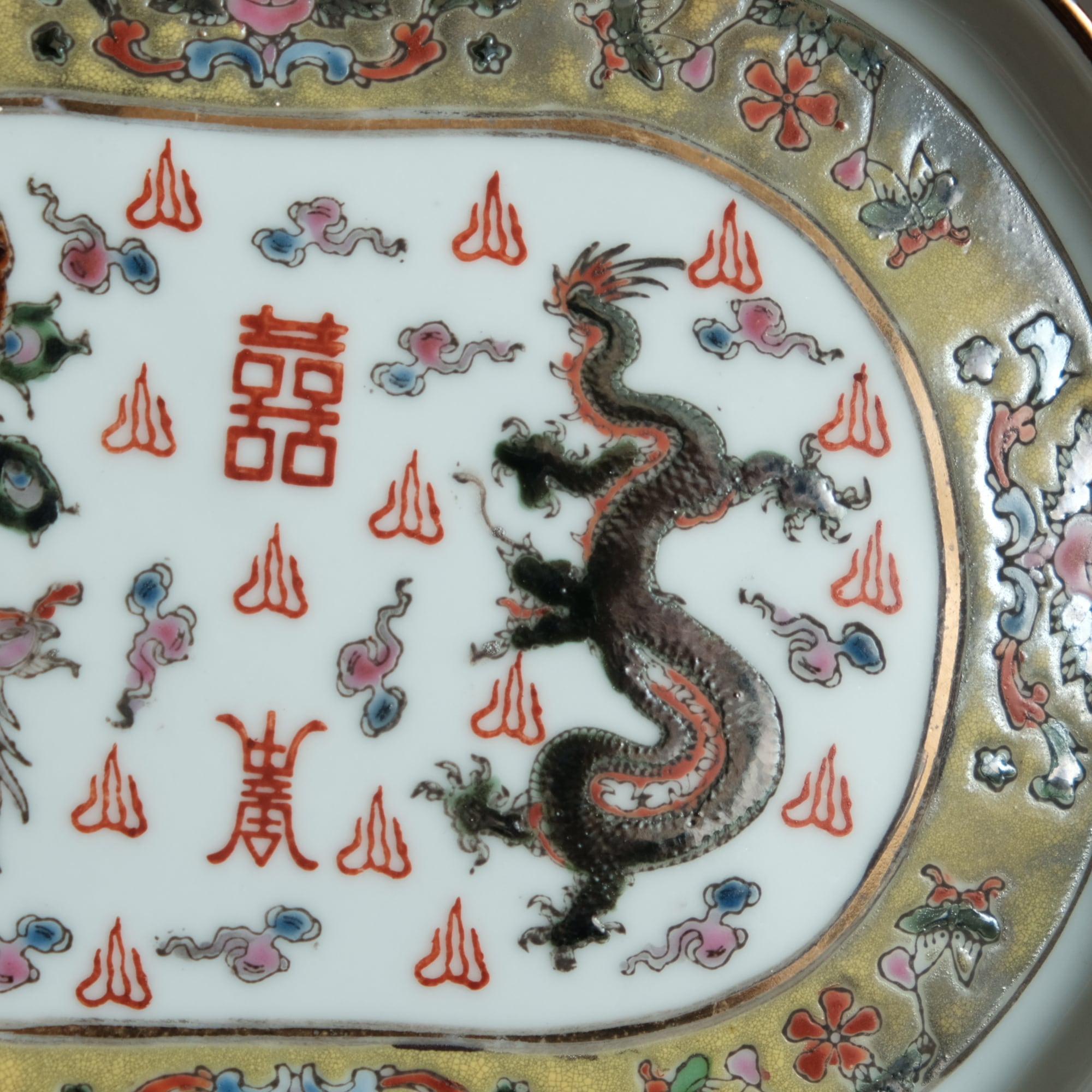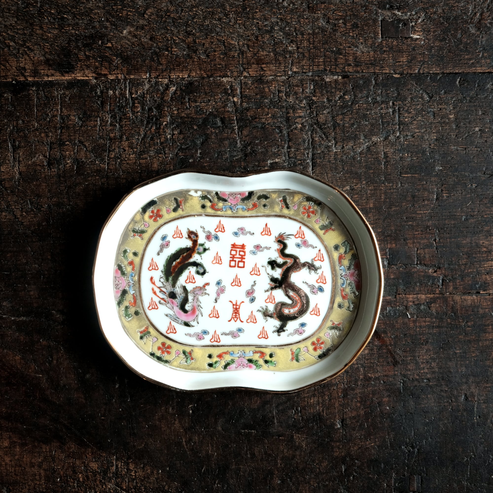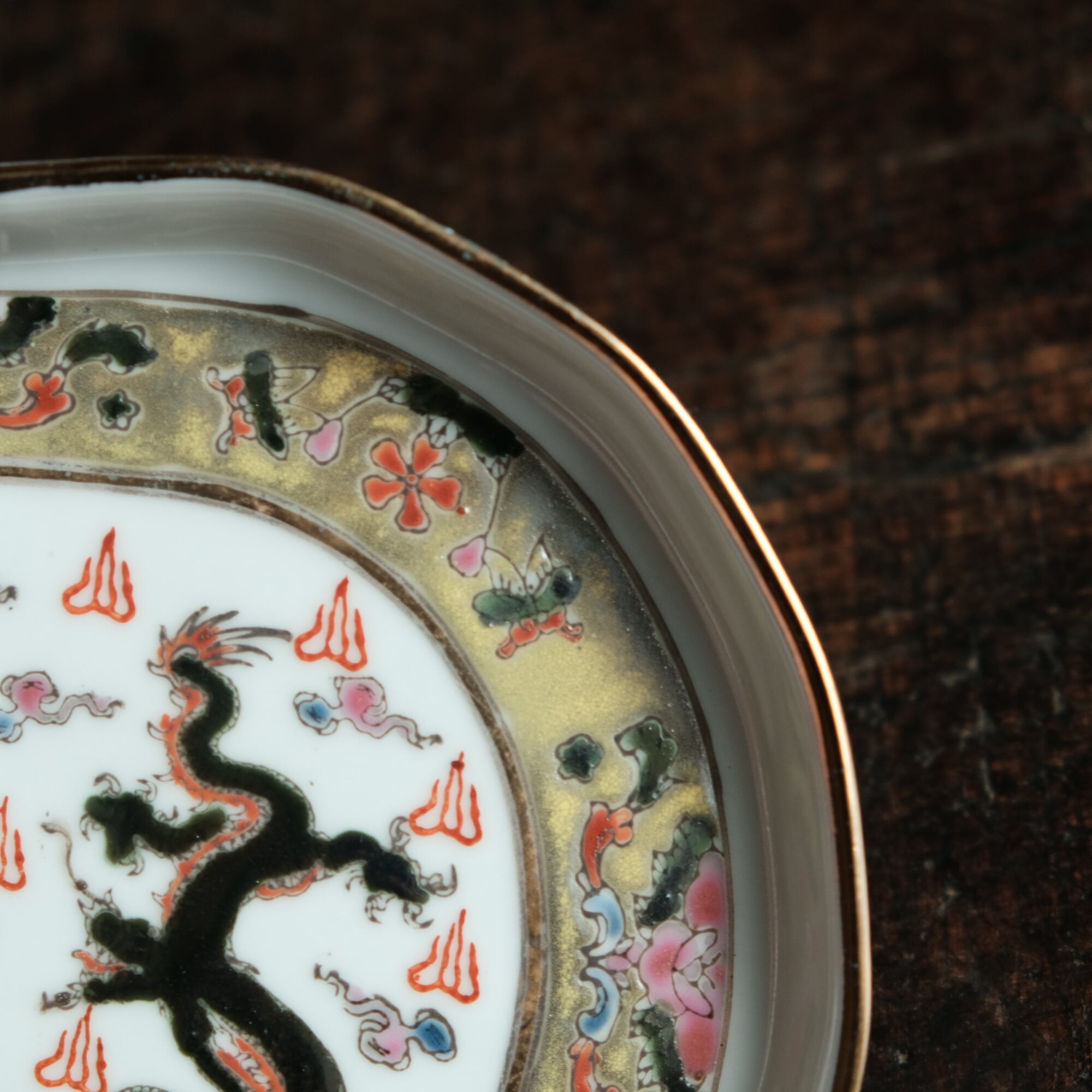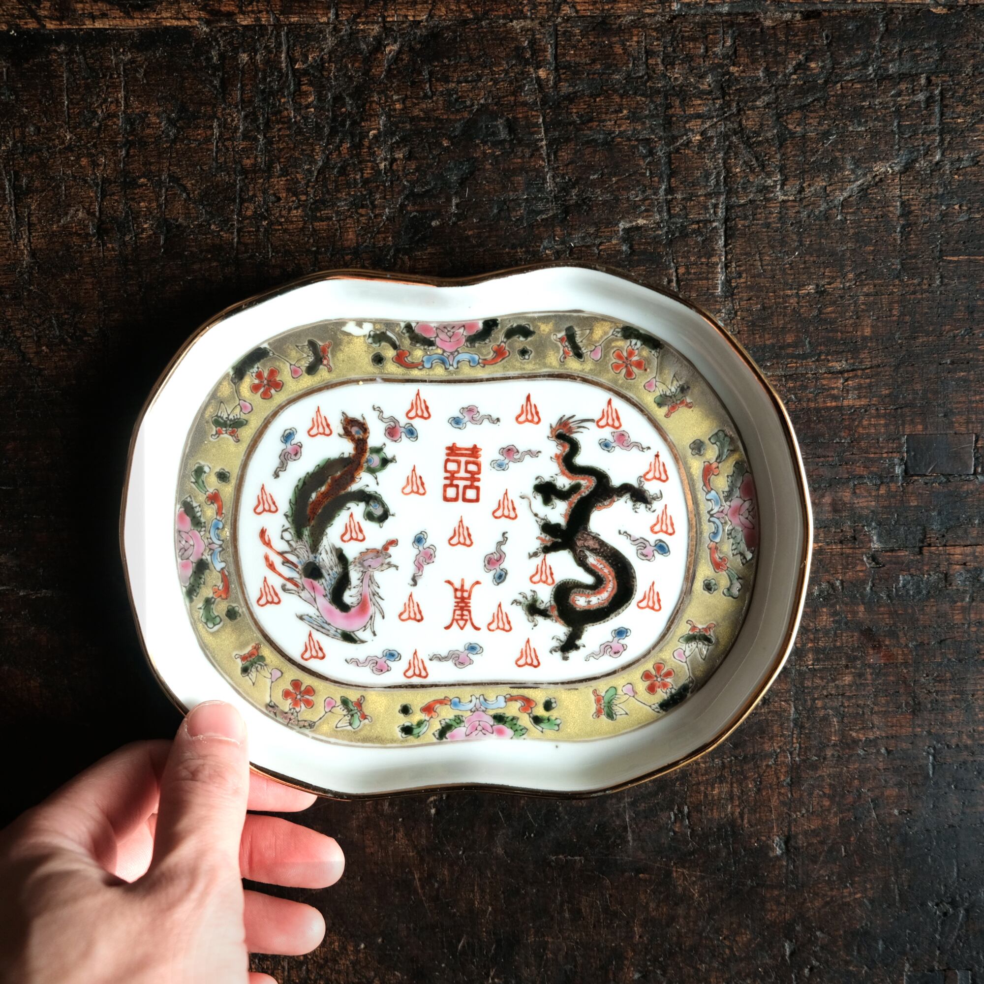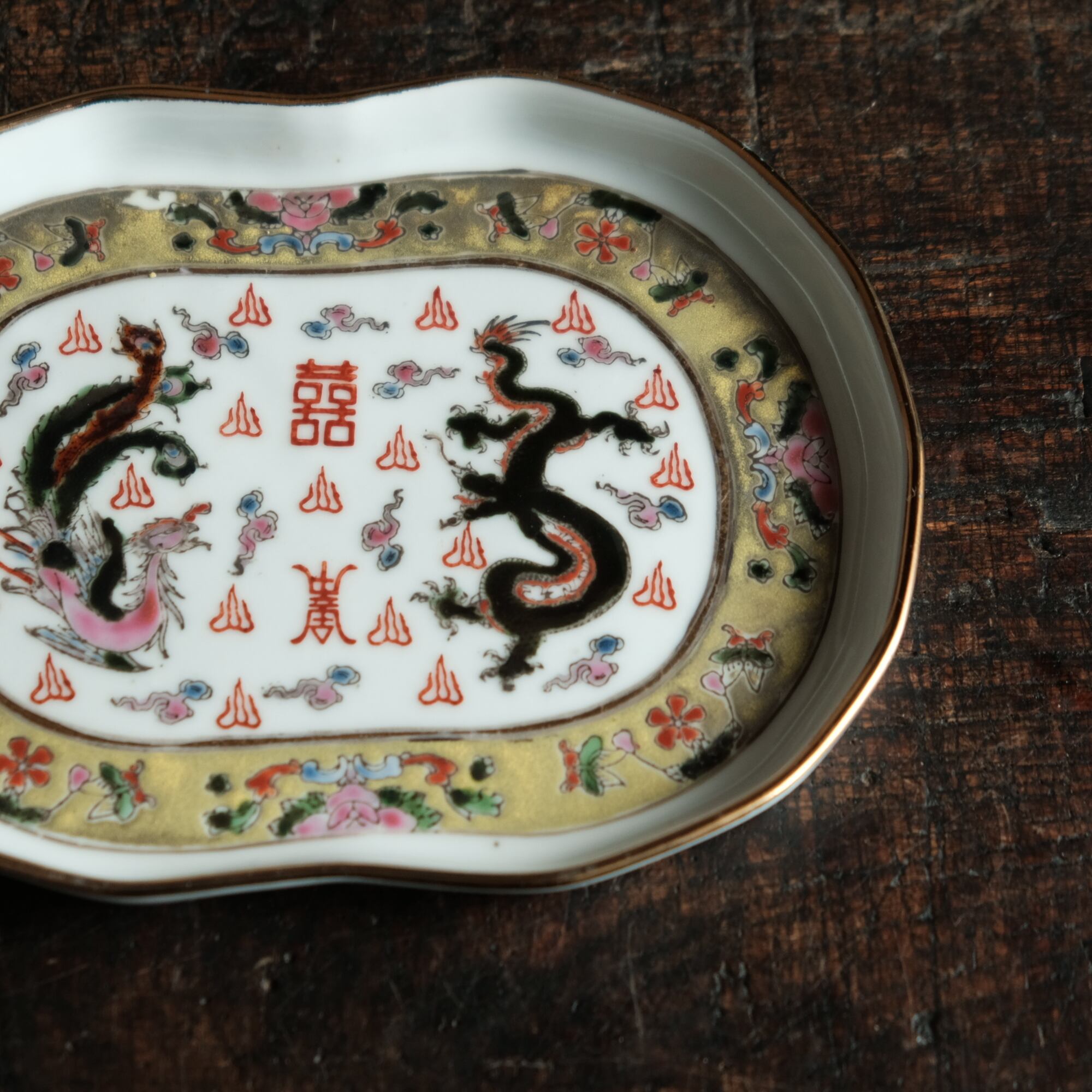 チャイナレトロで可愛い◆龍と鳳凰と蝶々。中国景徳鎮 赤絵金彩平皿プレート 煎茶茶器 雲 漢字