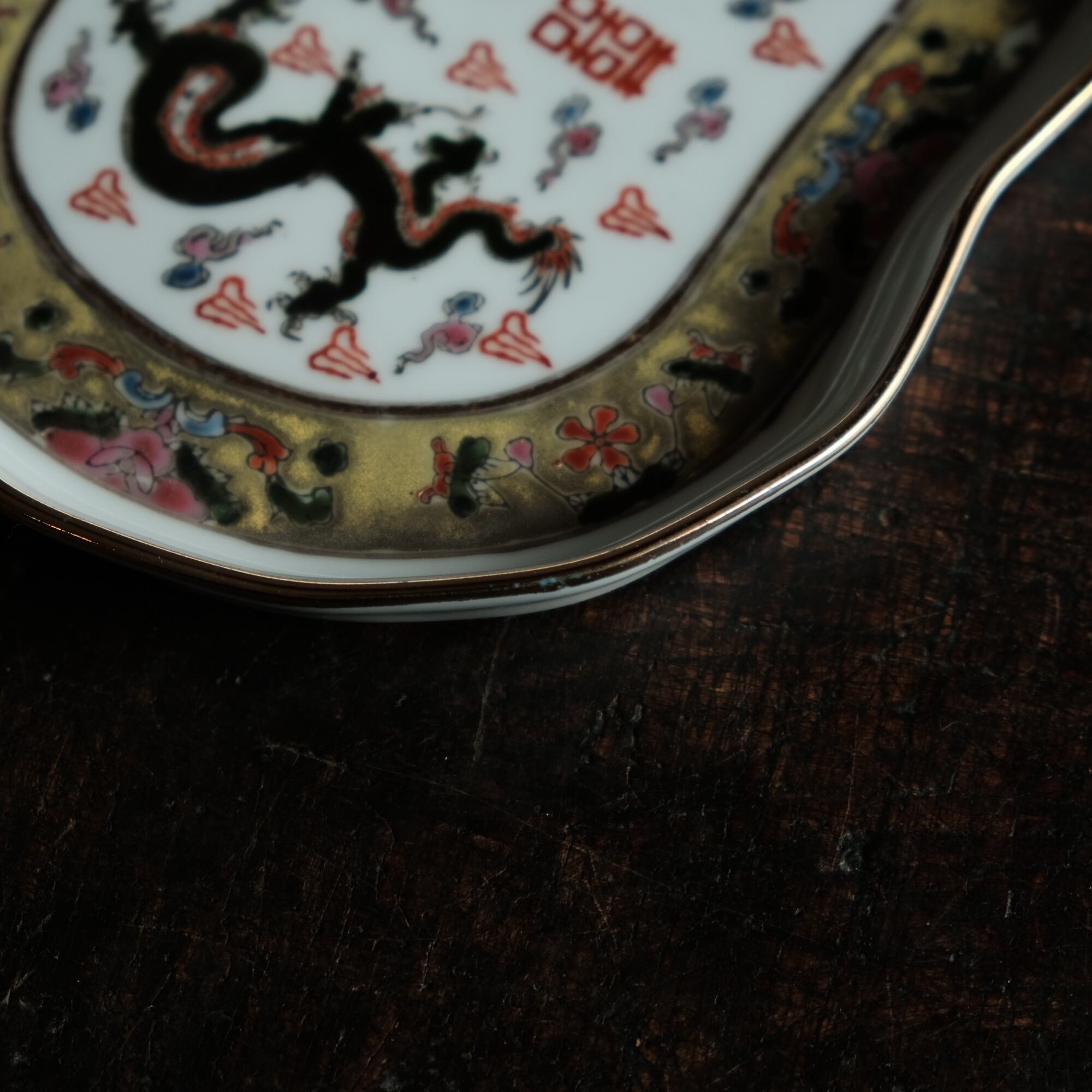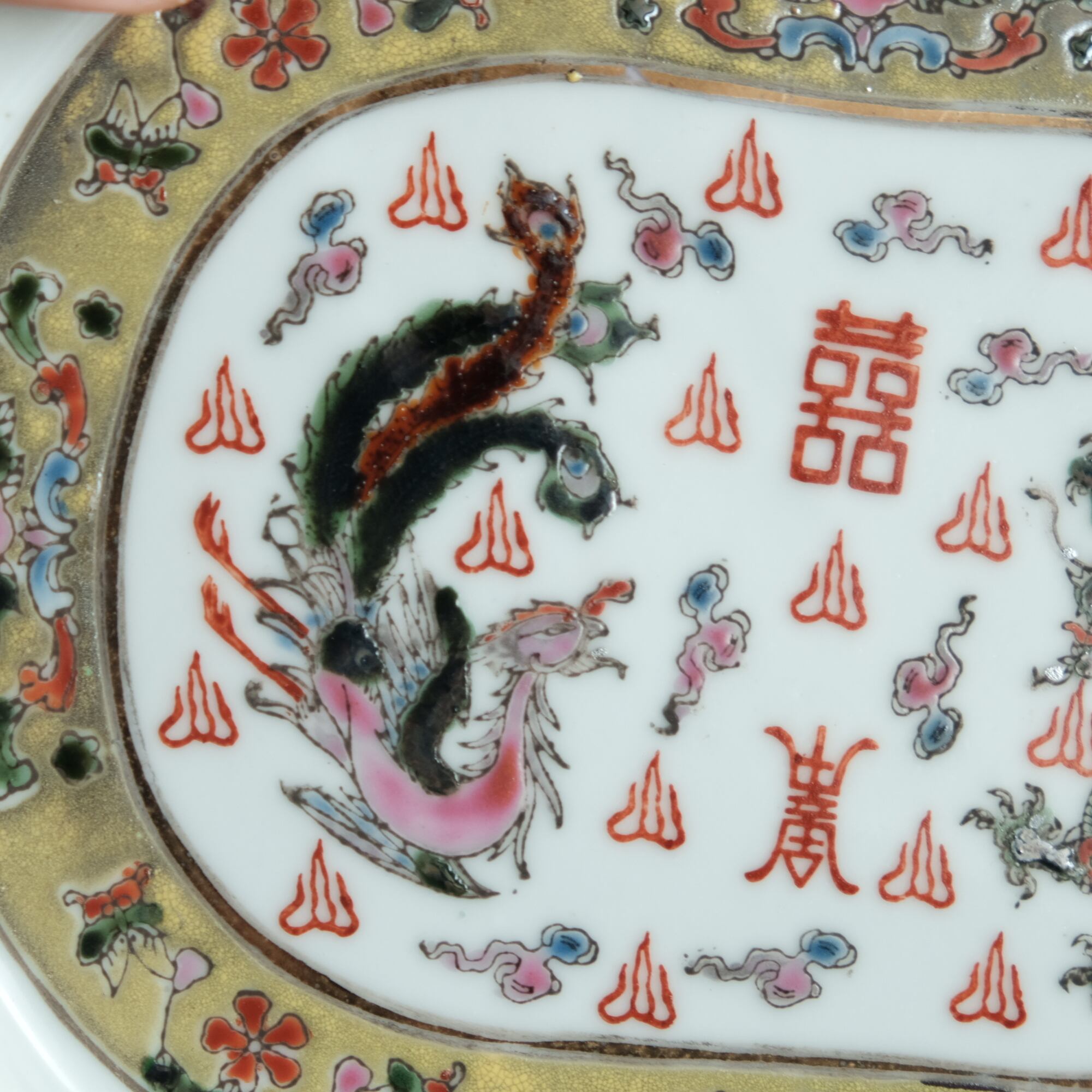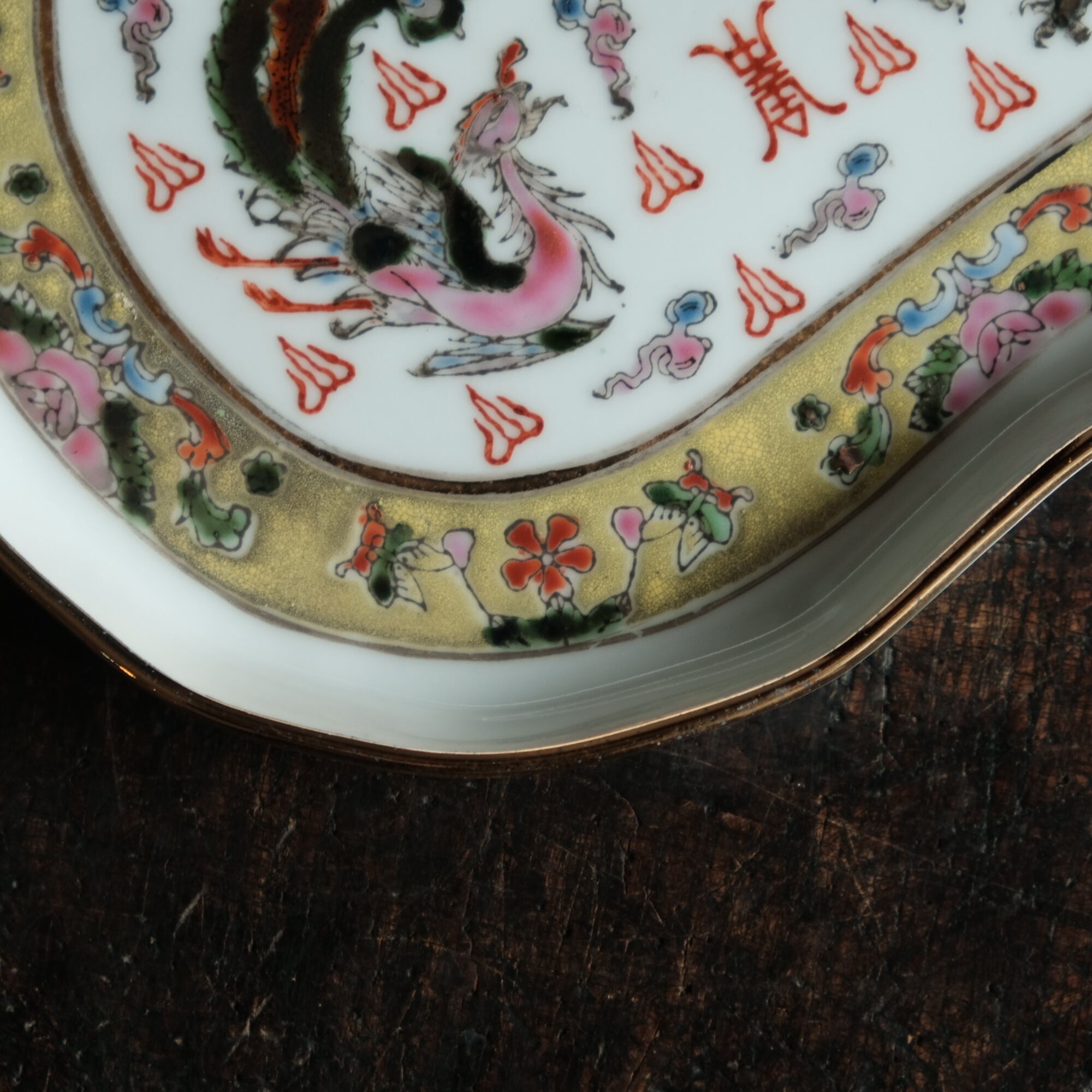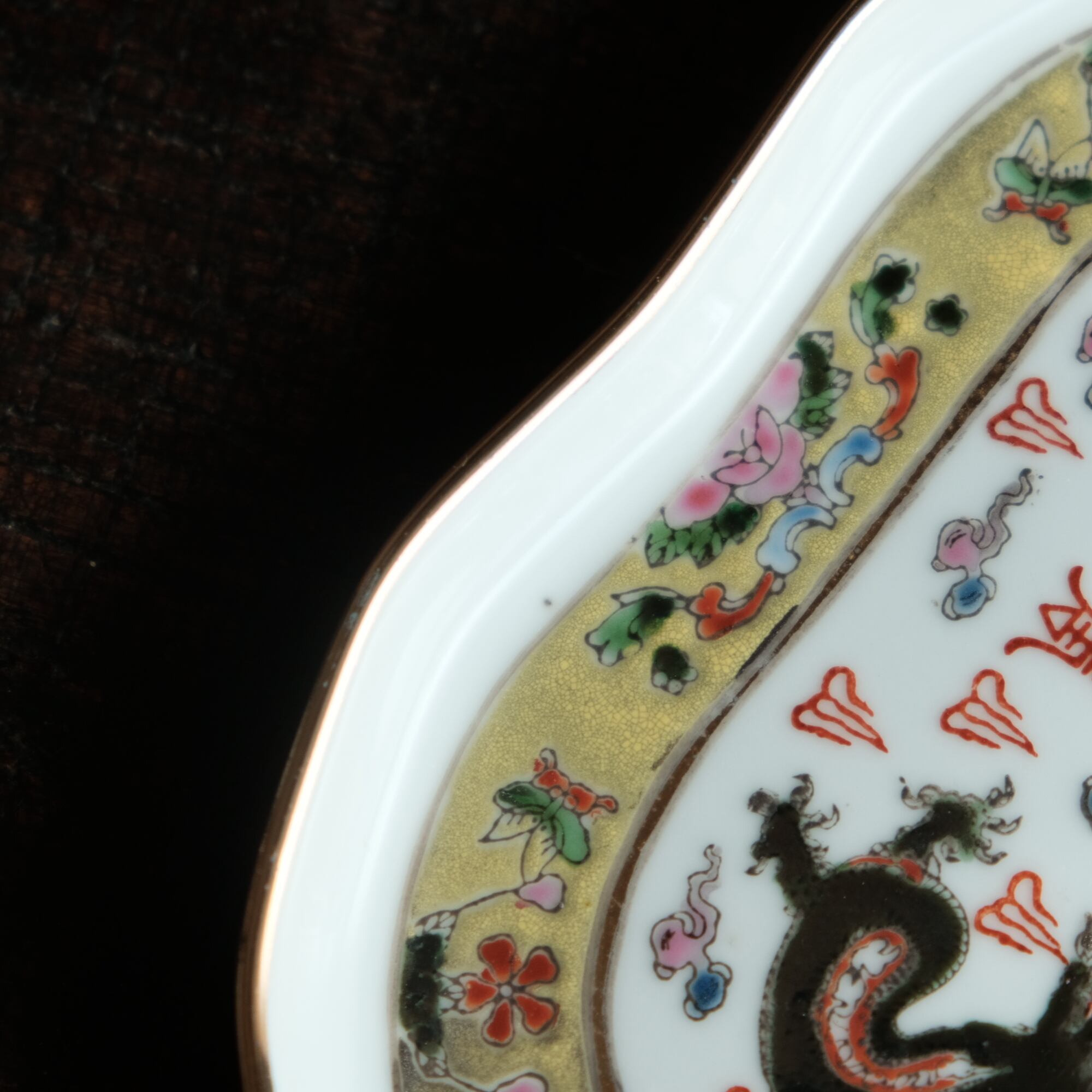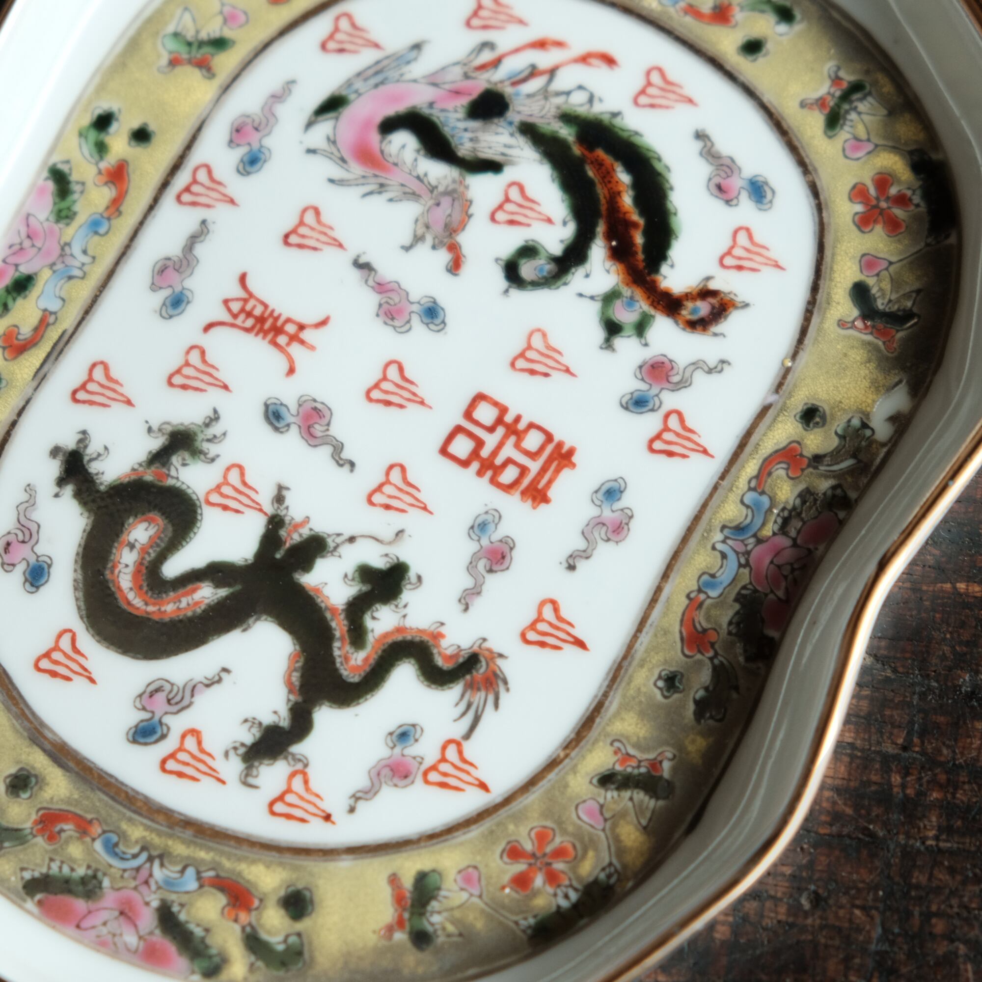 チャイナレトロで可愛い◆龍と鳳凰と蝶々。中国景徳鎮 赤絵金彩平皿プレート 煎茶茶器 雲 漢字