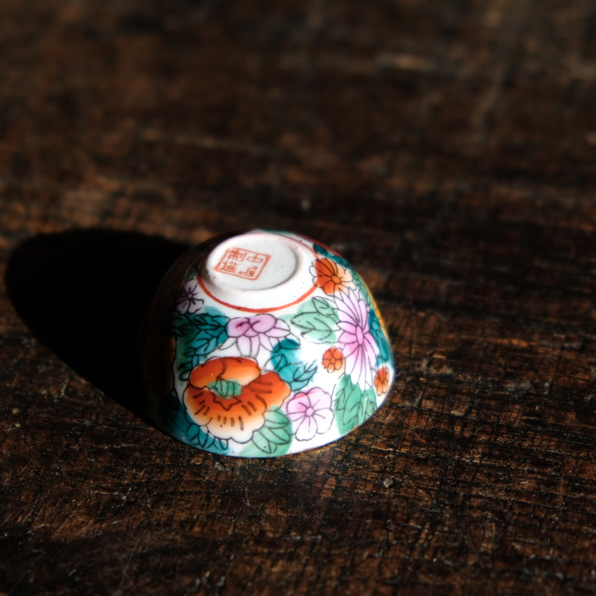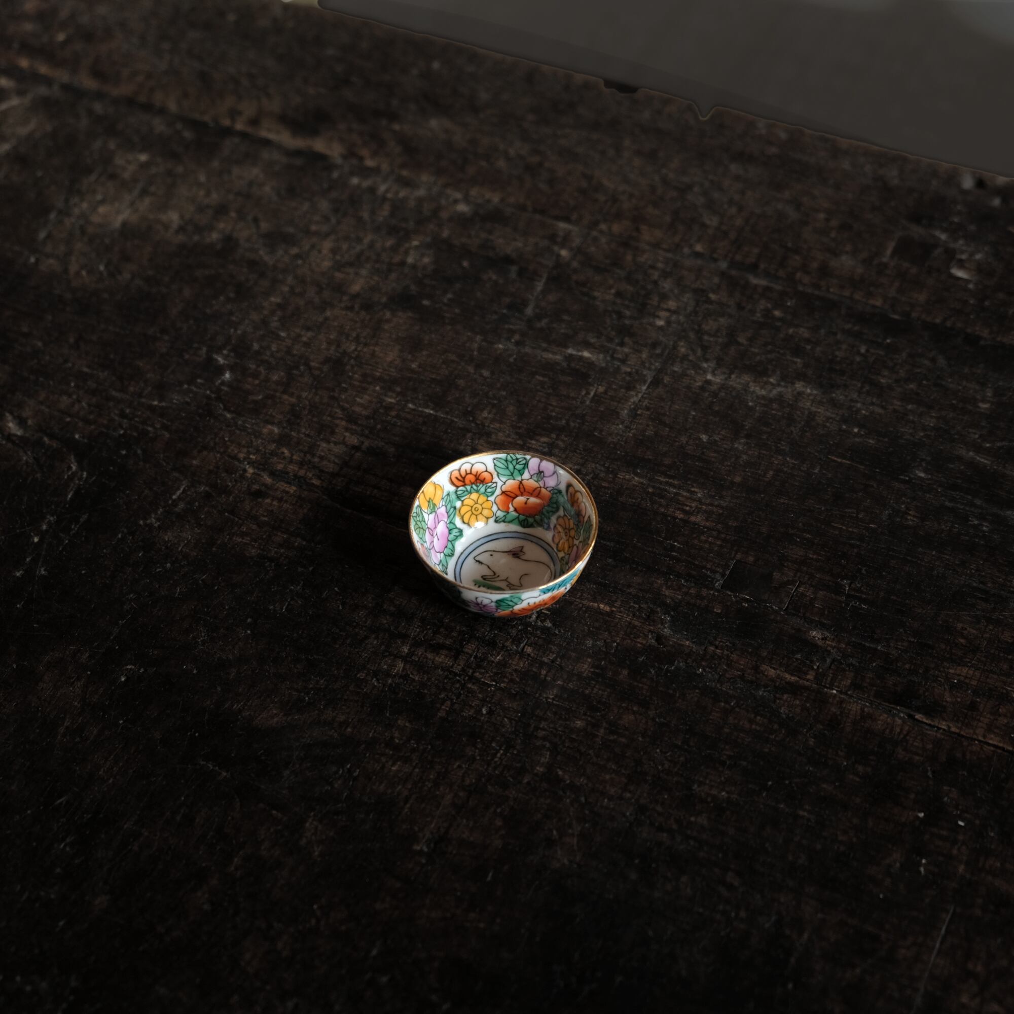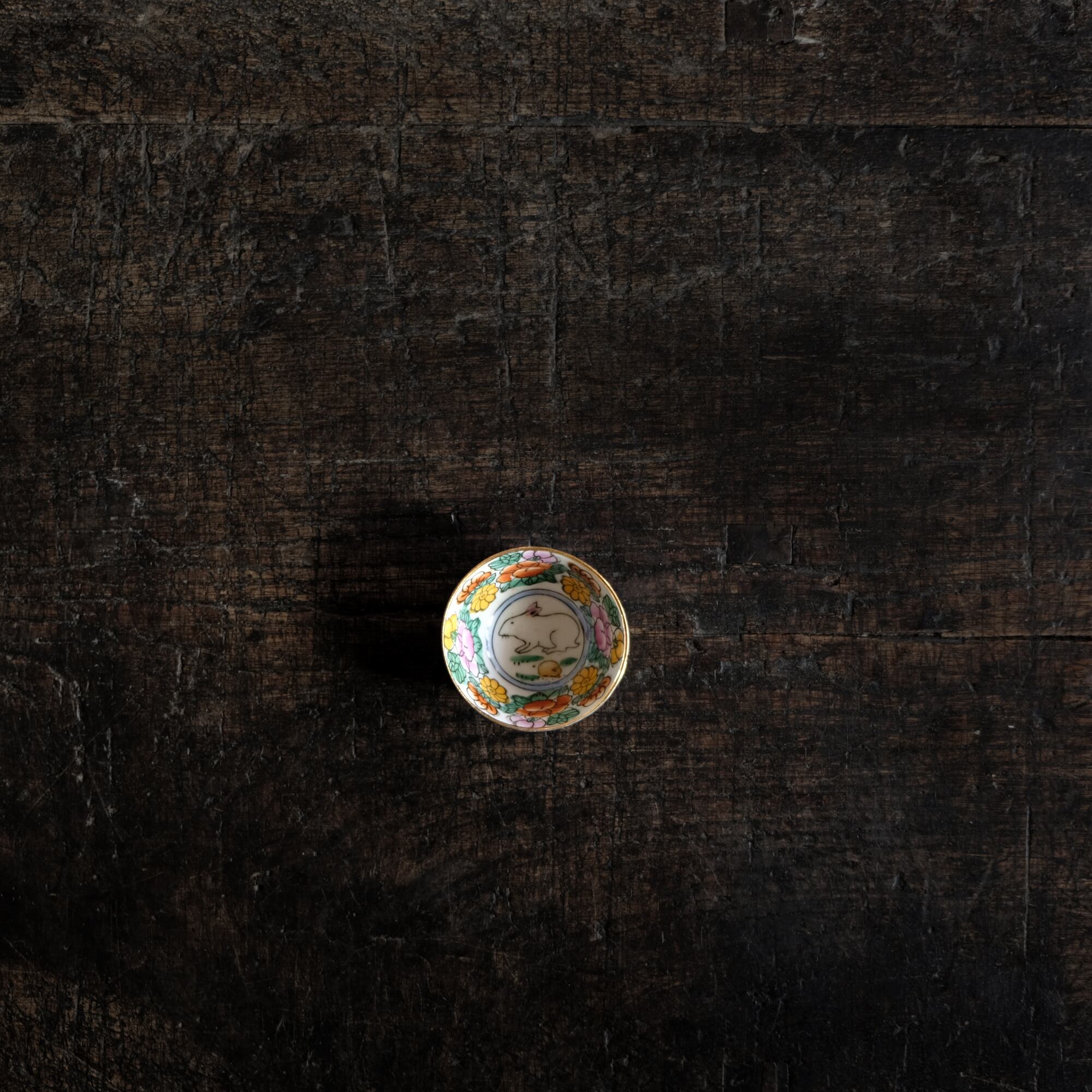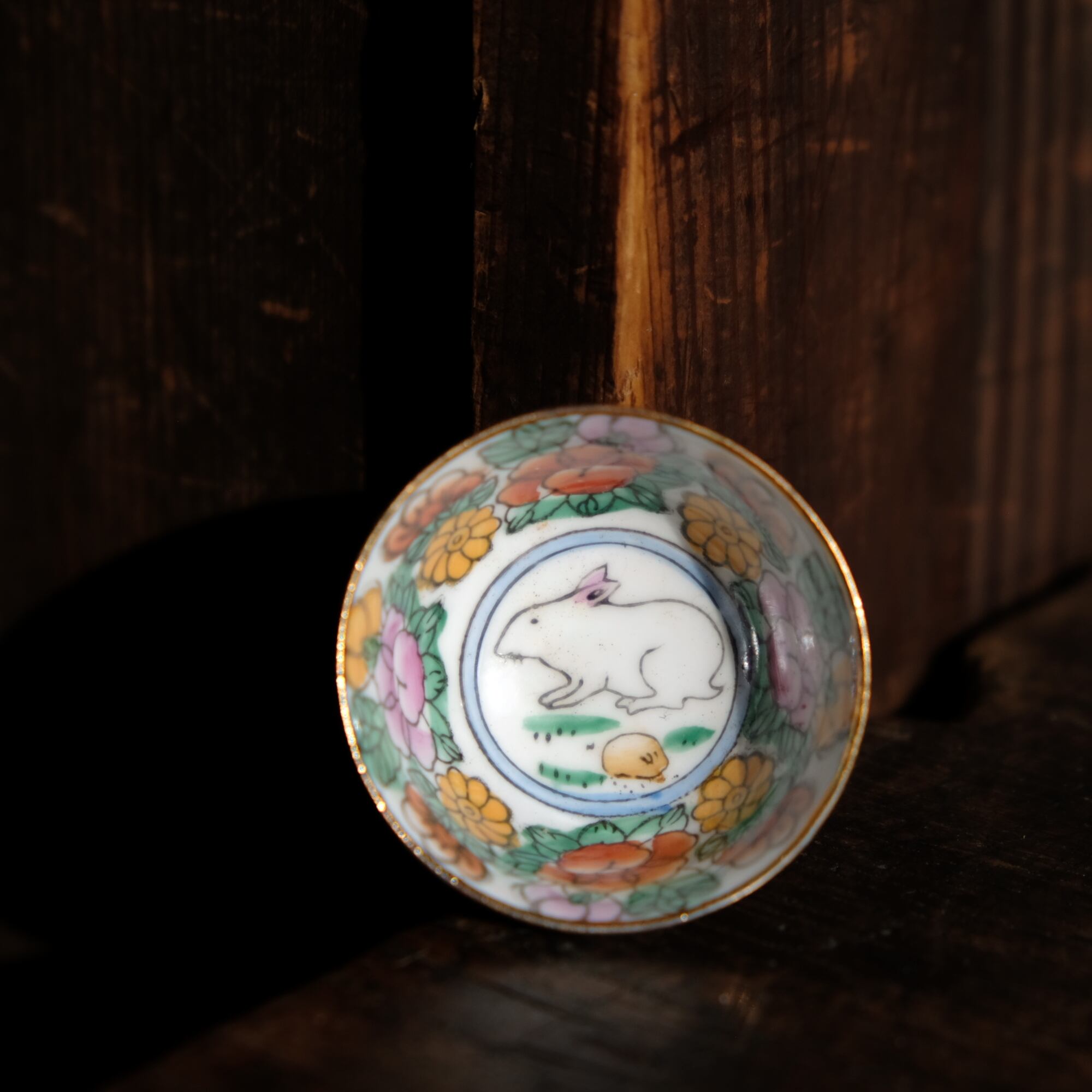 見込みに兎(卯)◆白にカラフルな草花と果実。中国製造 干支文色絵金彩小ぶり猪口 茶杯 シノワズリ チャイナレトロ