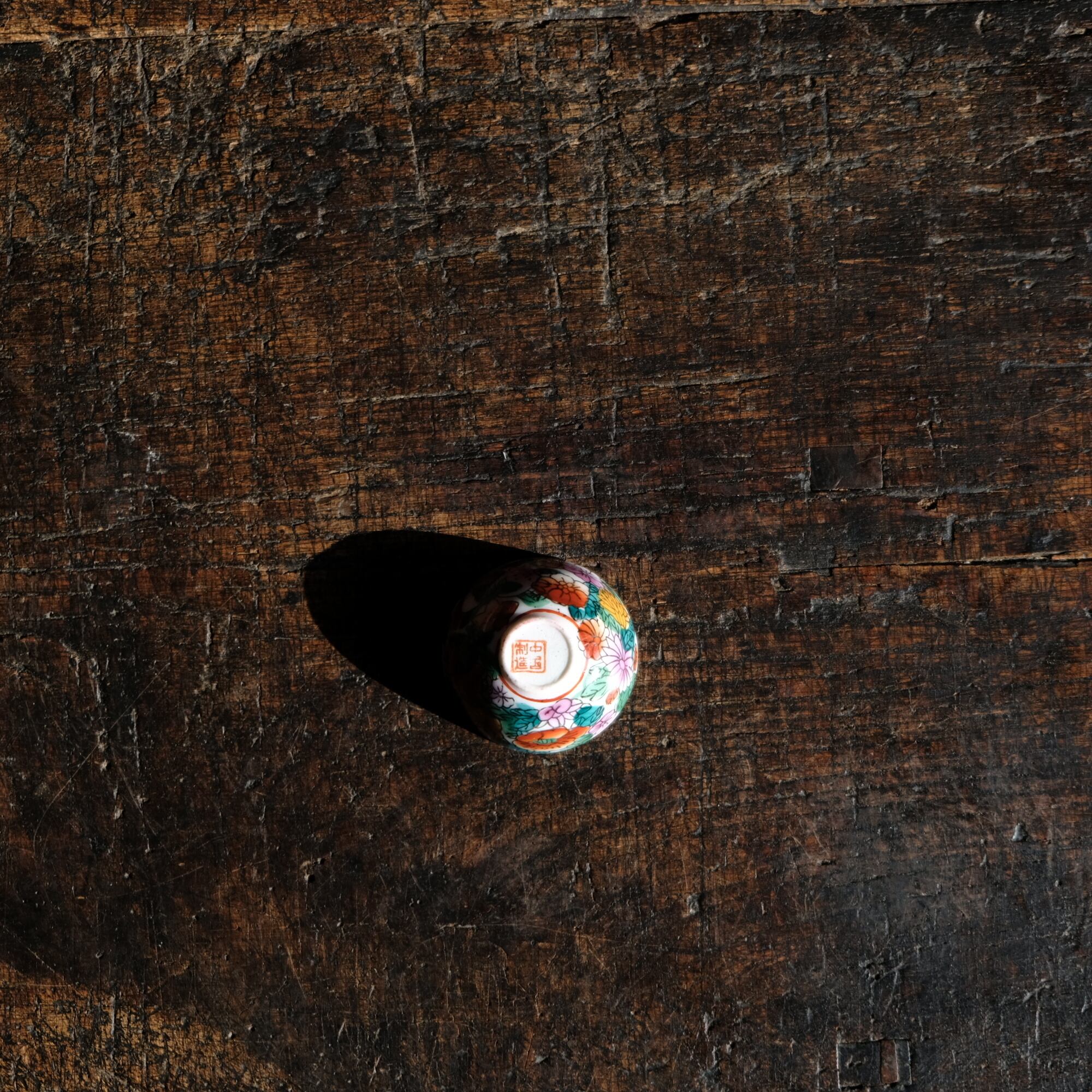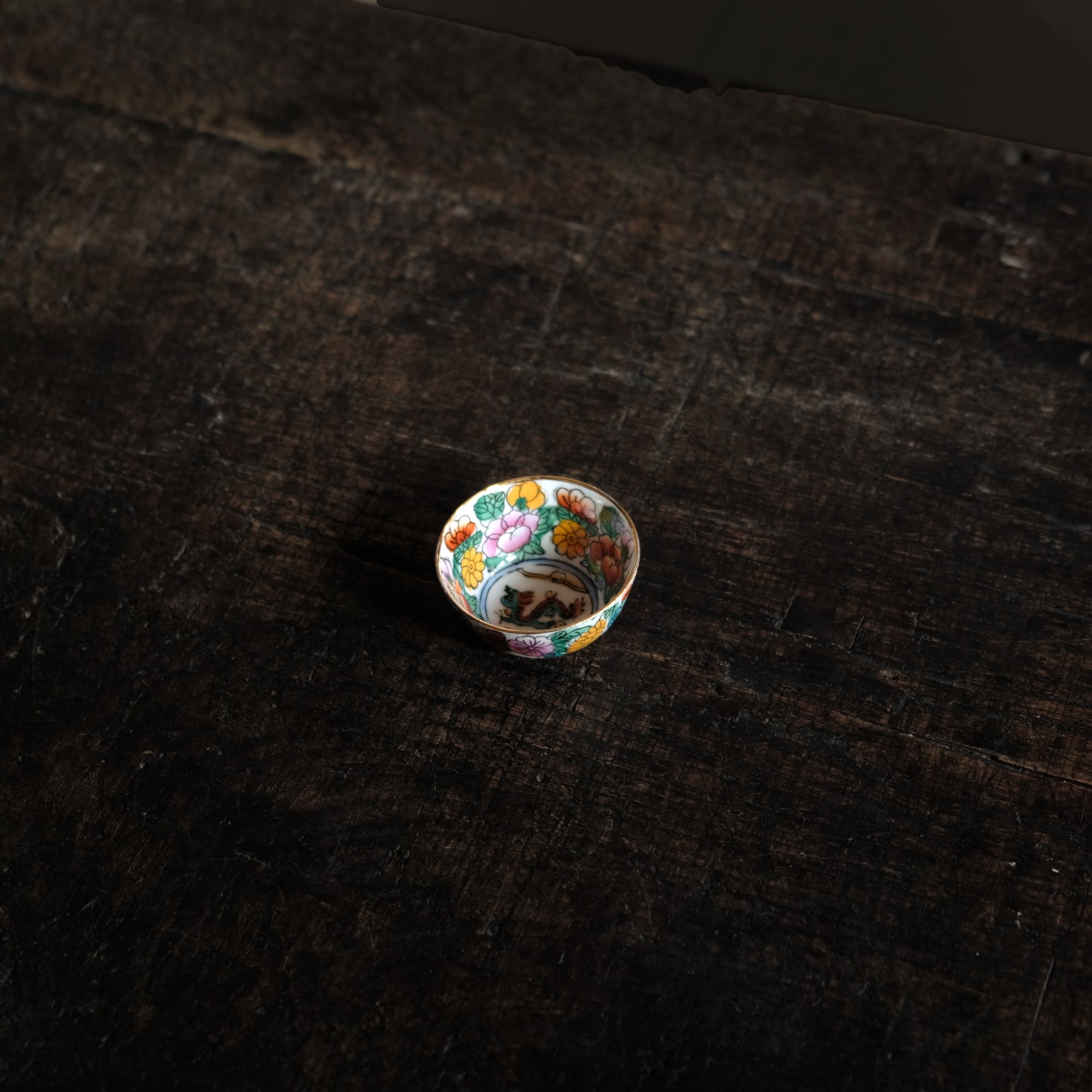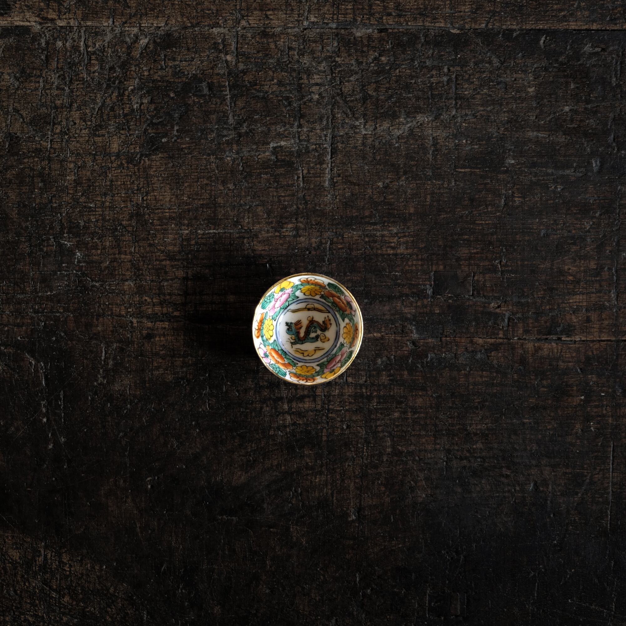見込みに龍(辰)◆白にカラフルな草花と果実。中国製造 干支文色絵金彩小ぶり猪口 茶杯 シノワズリ チャイナレトロ