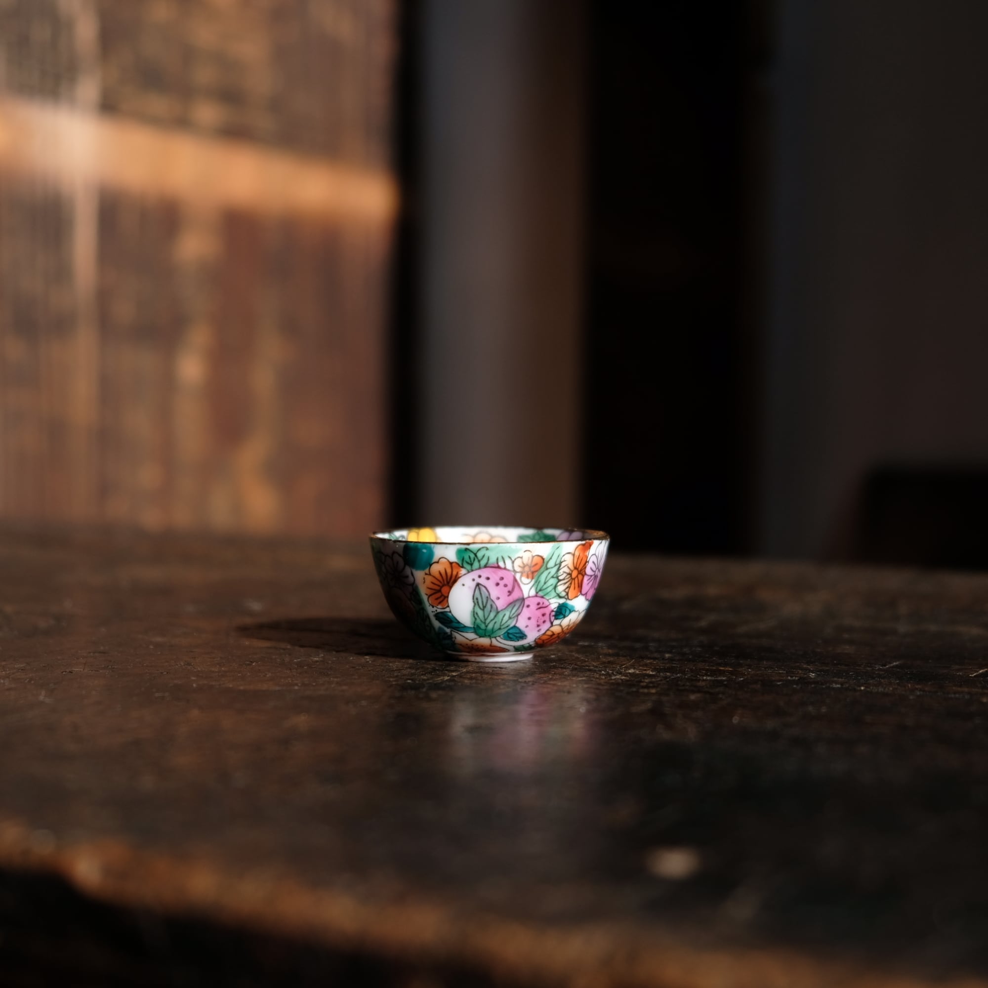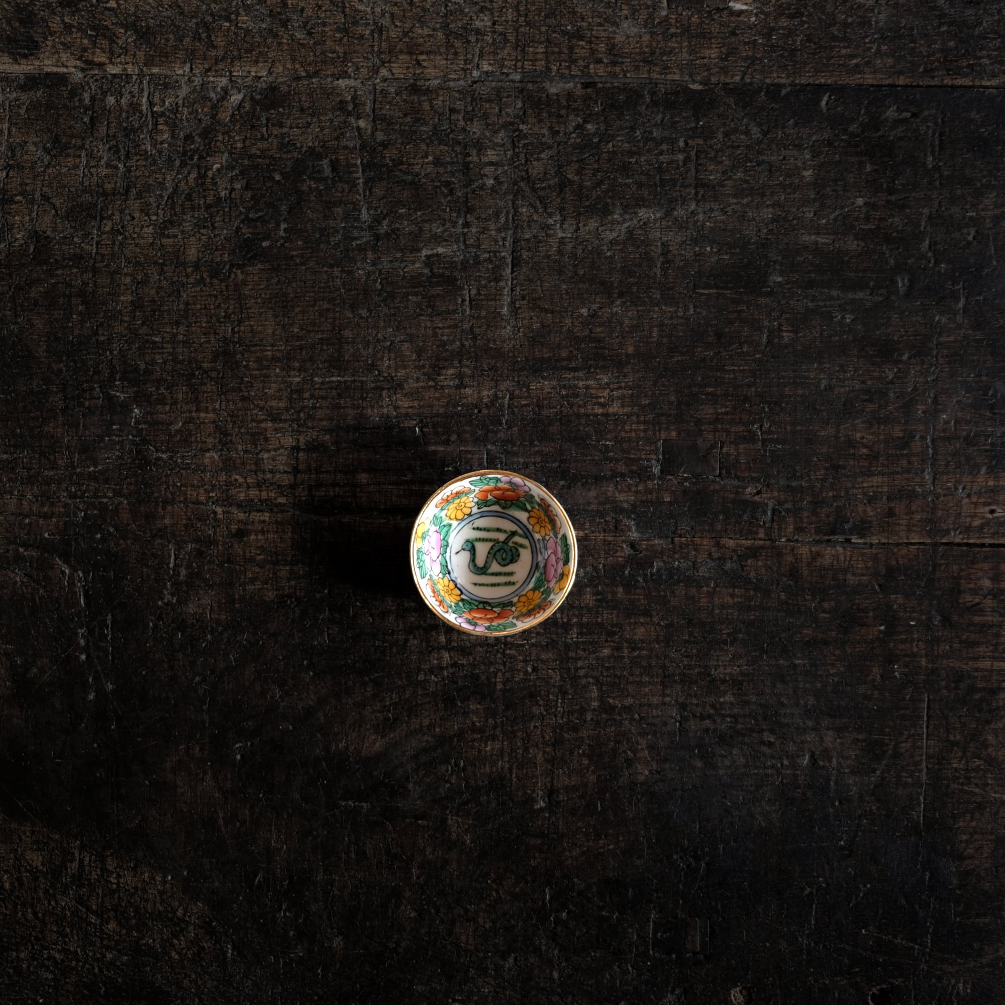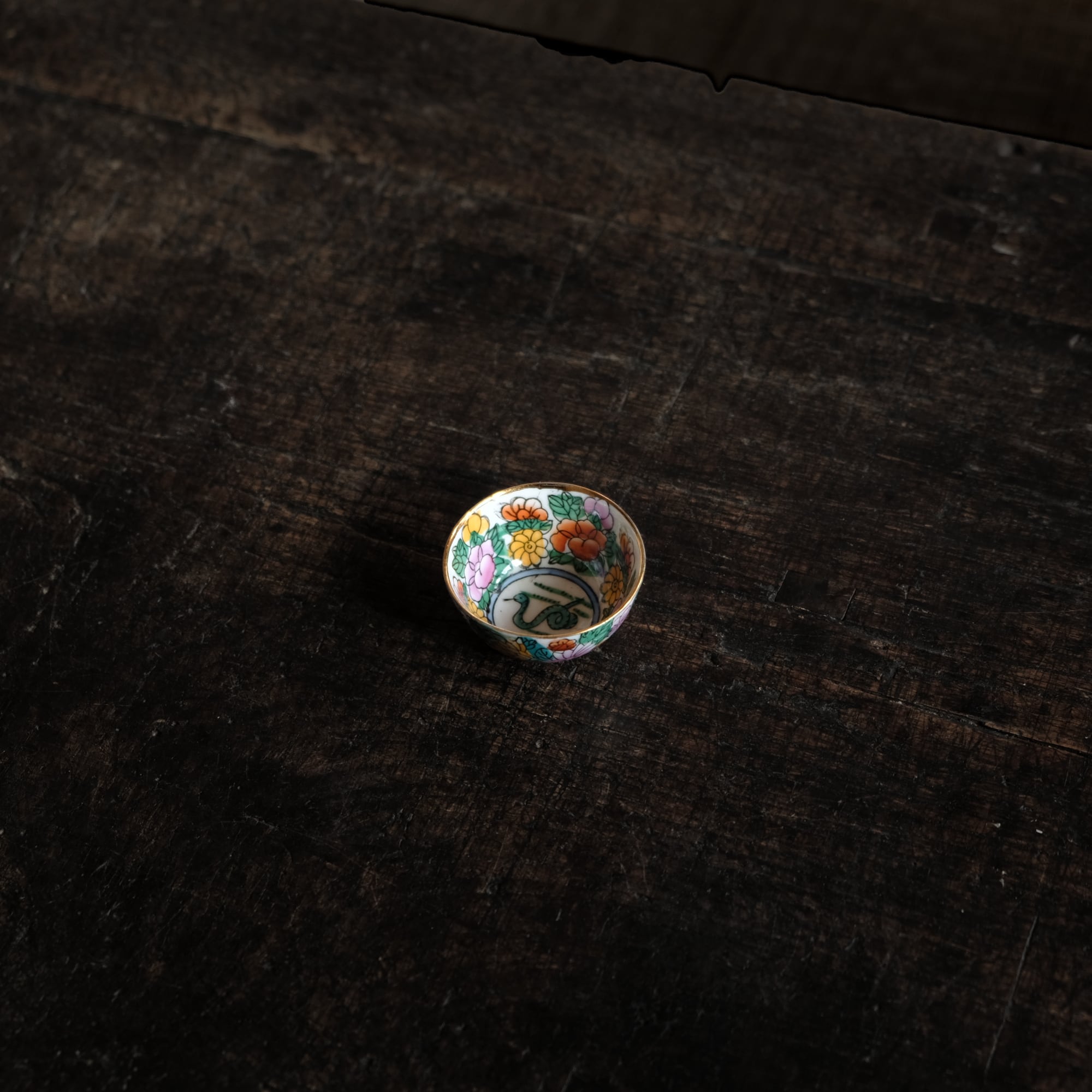 見込みに蛇(巳)◆白にカラフルな草花と果実。中国製造 干支文色絵金彩小ぶり猪口 茶杯 シノワズリ チャイナレトロ