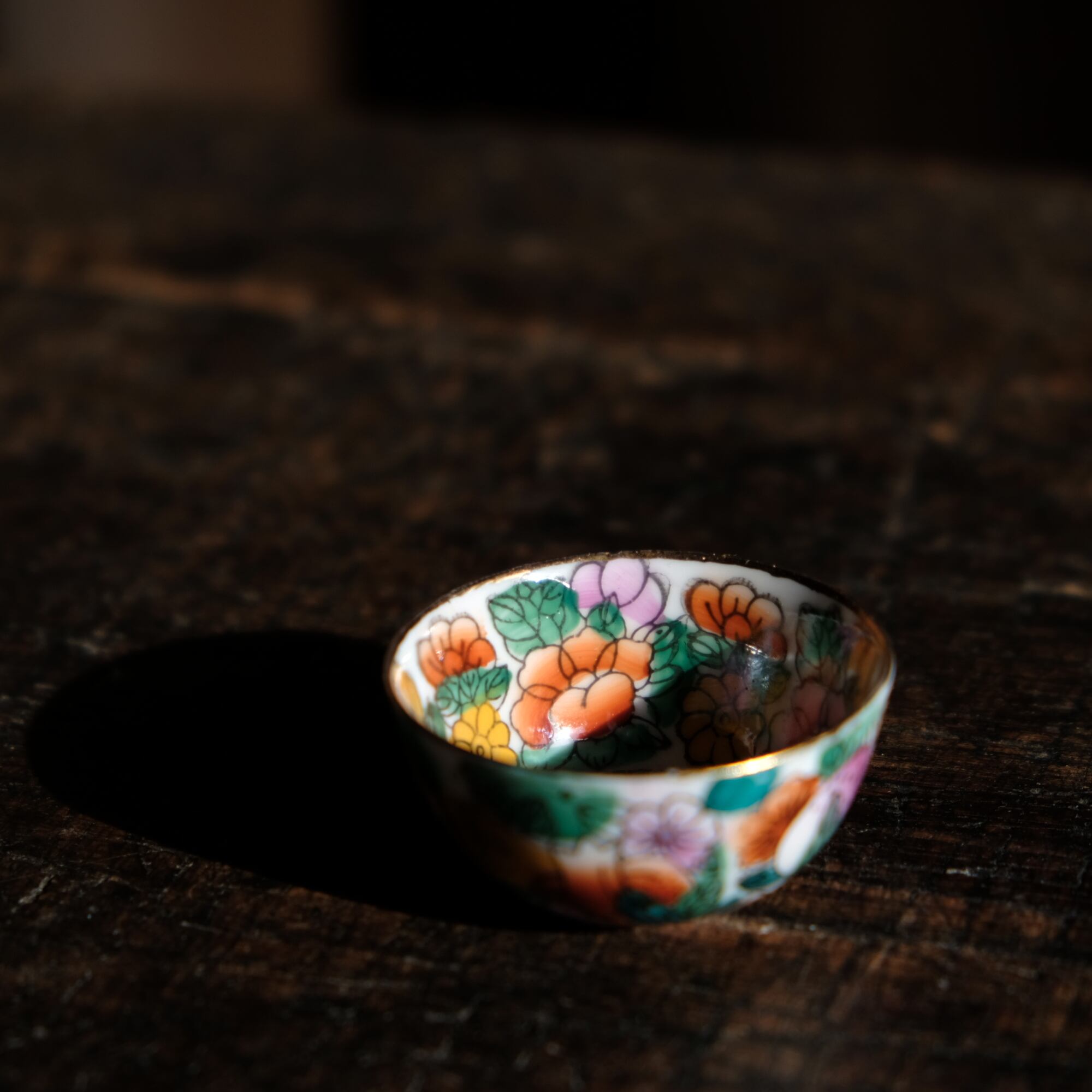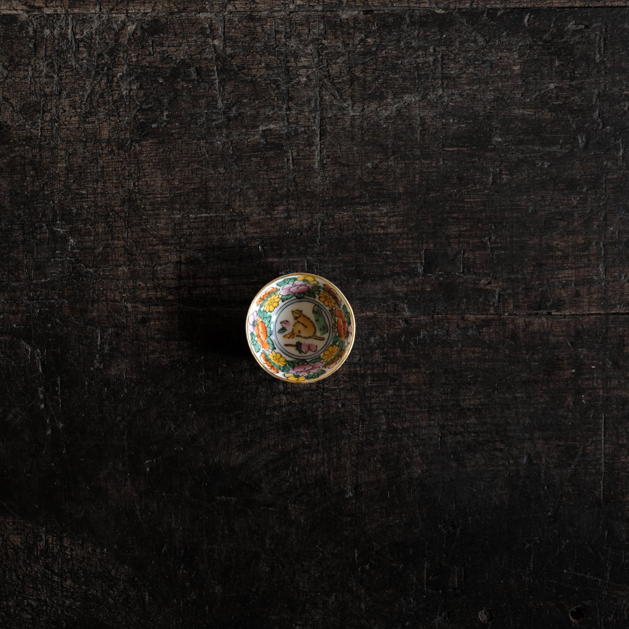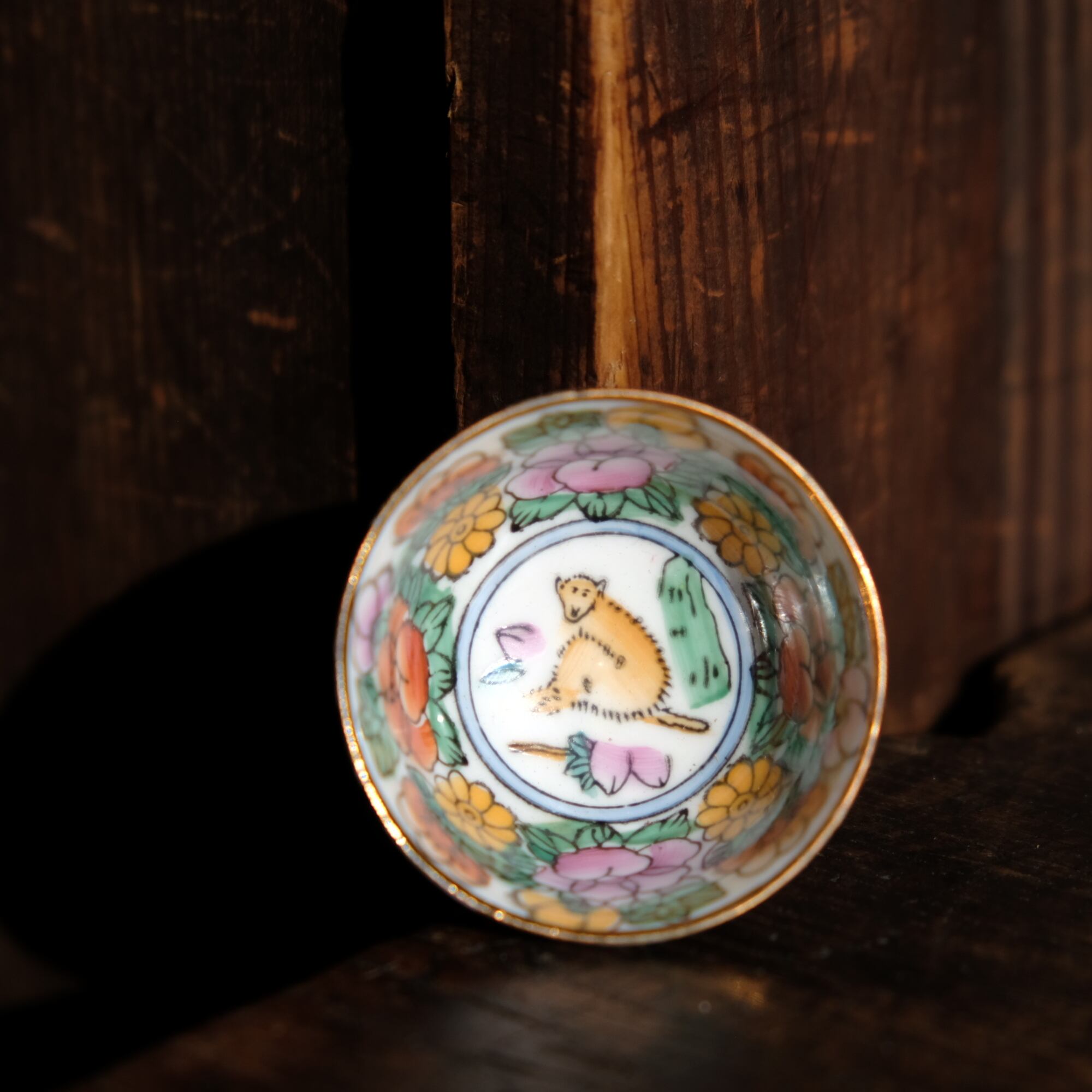 見込みに猿(申)◆白にカラフルな草花と果実。中国製造 干支文色絵金彩小ぶり猪口 茶杯 シノワズリ チャイナレトロ
