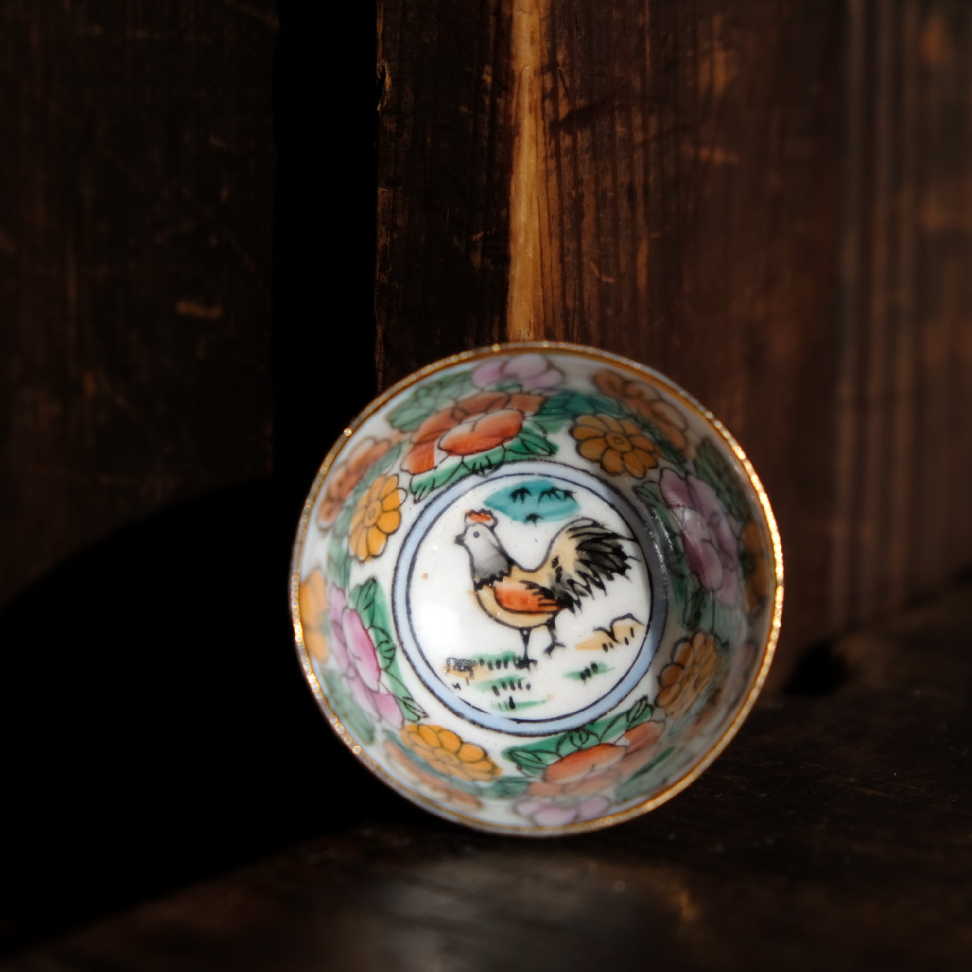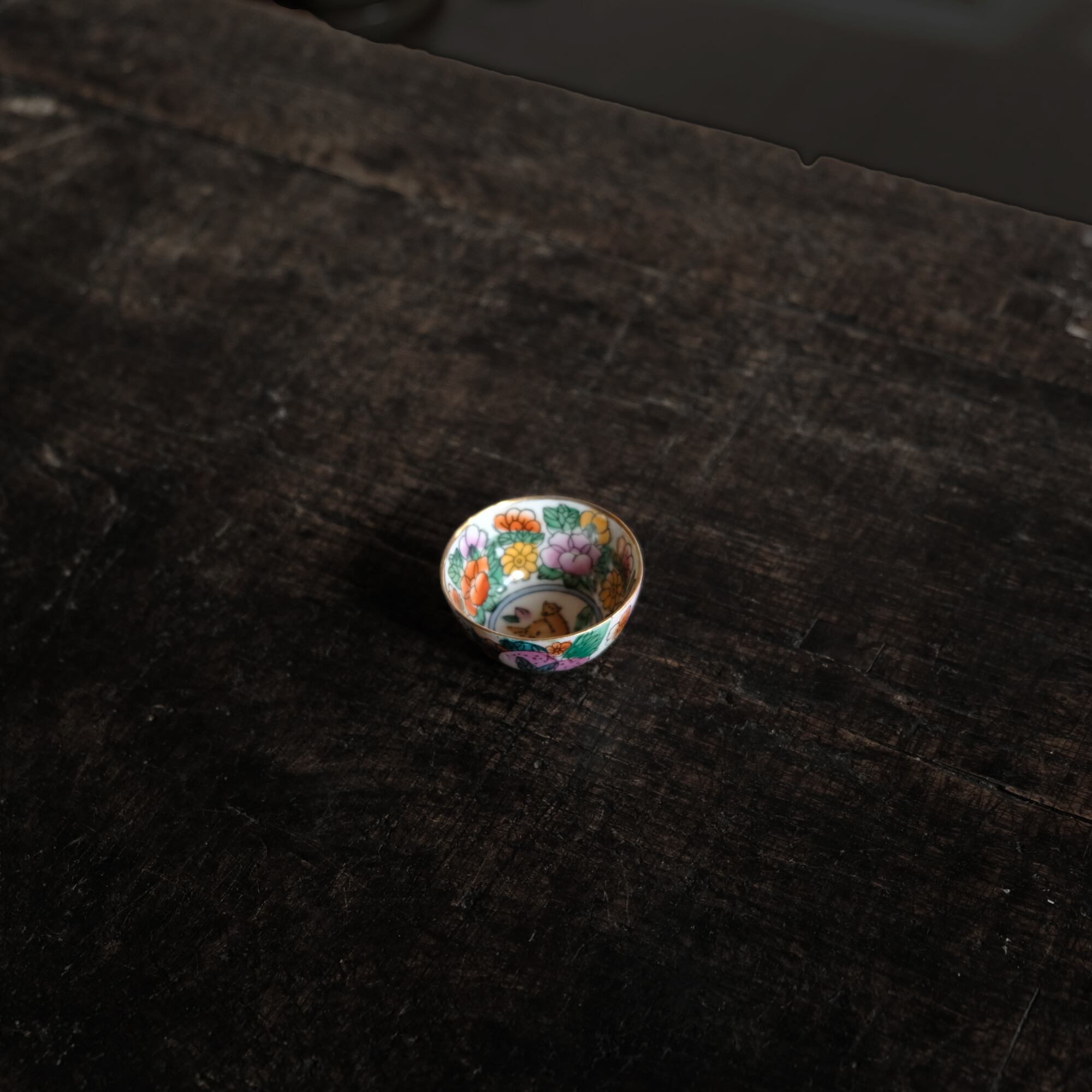 見込みに子(鼠)◆白にカラフルな草花と果実。中国製造 干支文色絵金彩小ぶり猪口 茶杯 シノワズリ チャイナレトロ