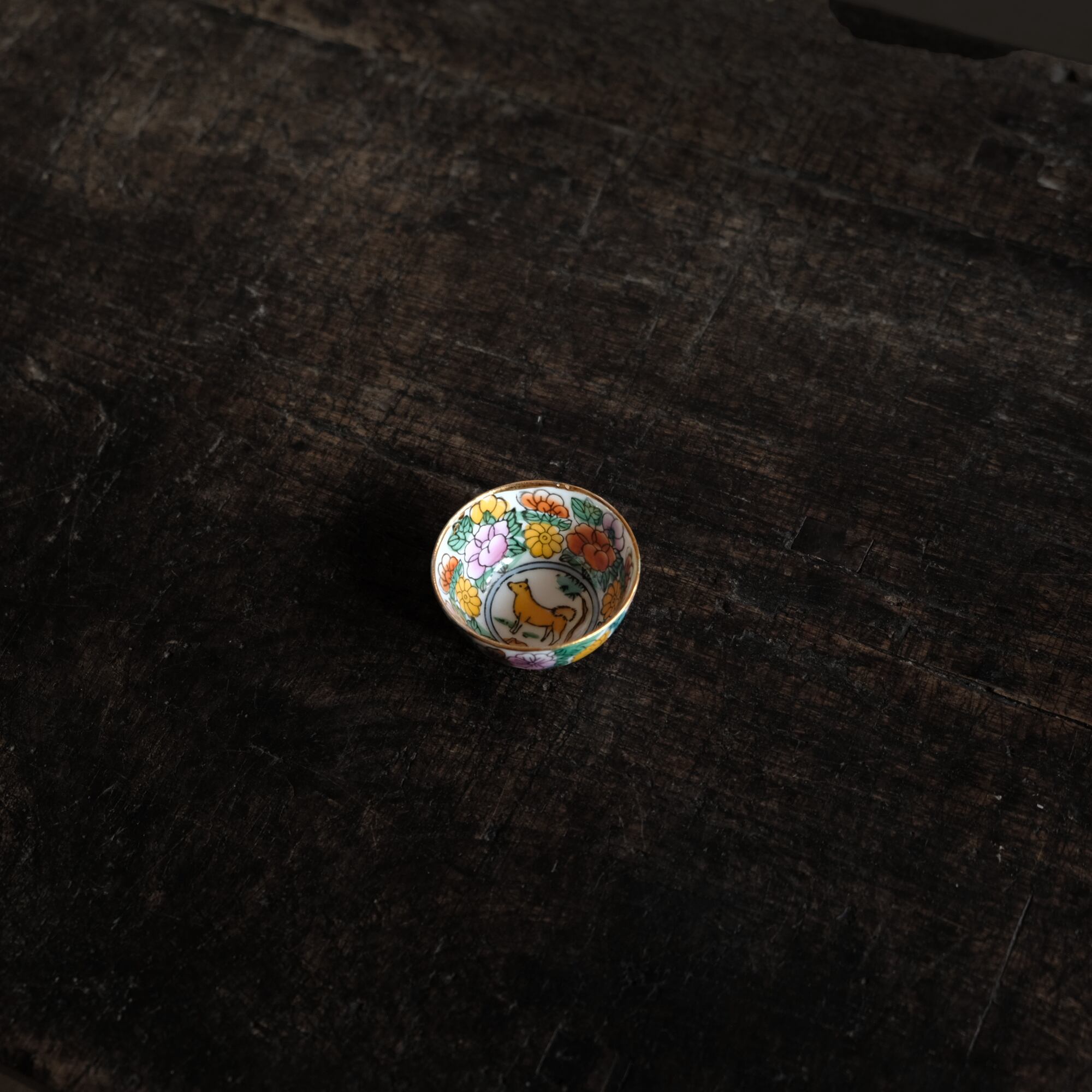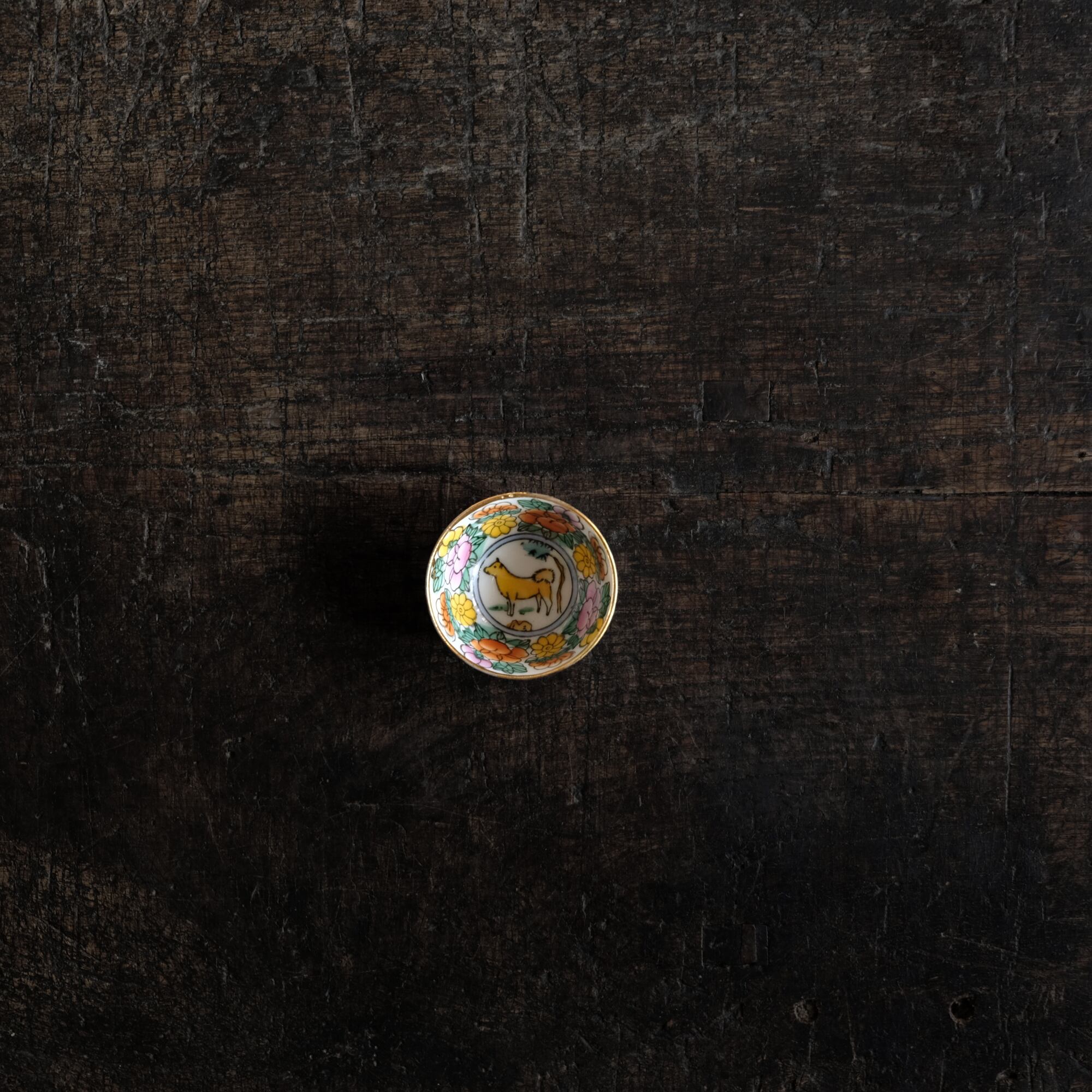 見込みに犬(戌)◆白にカラフルな草花と果実。中国製造 干支文色絵金彩小ぶり猪口 茶杯 シノワズリ チャイナレトロ