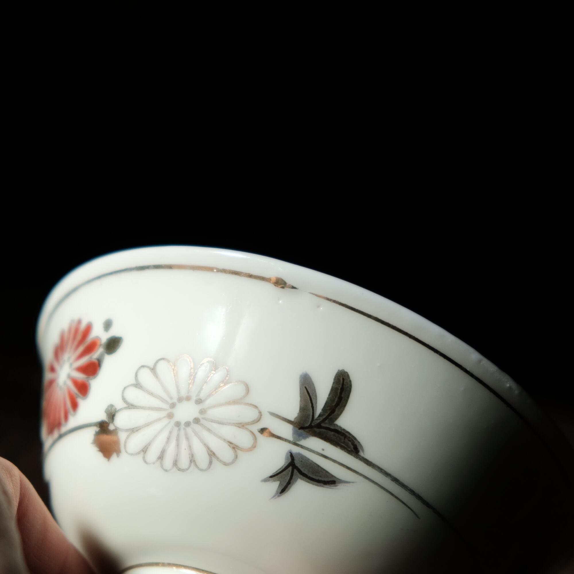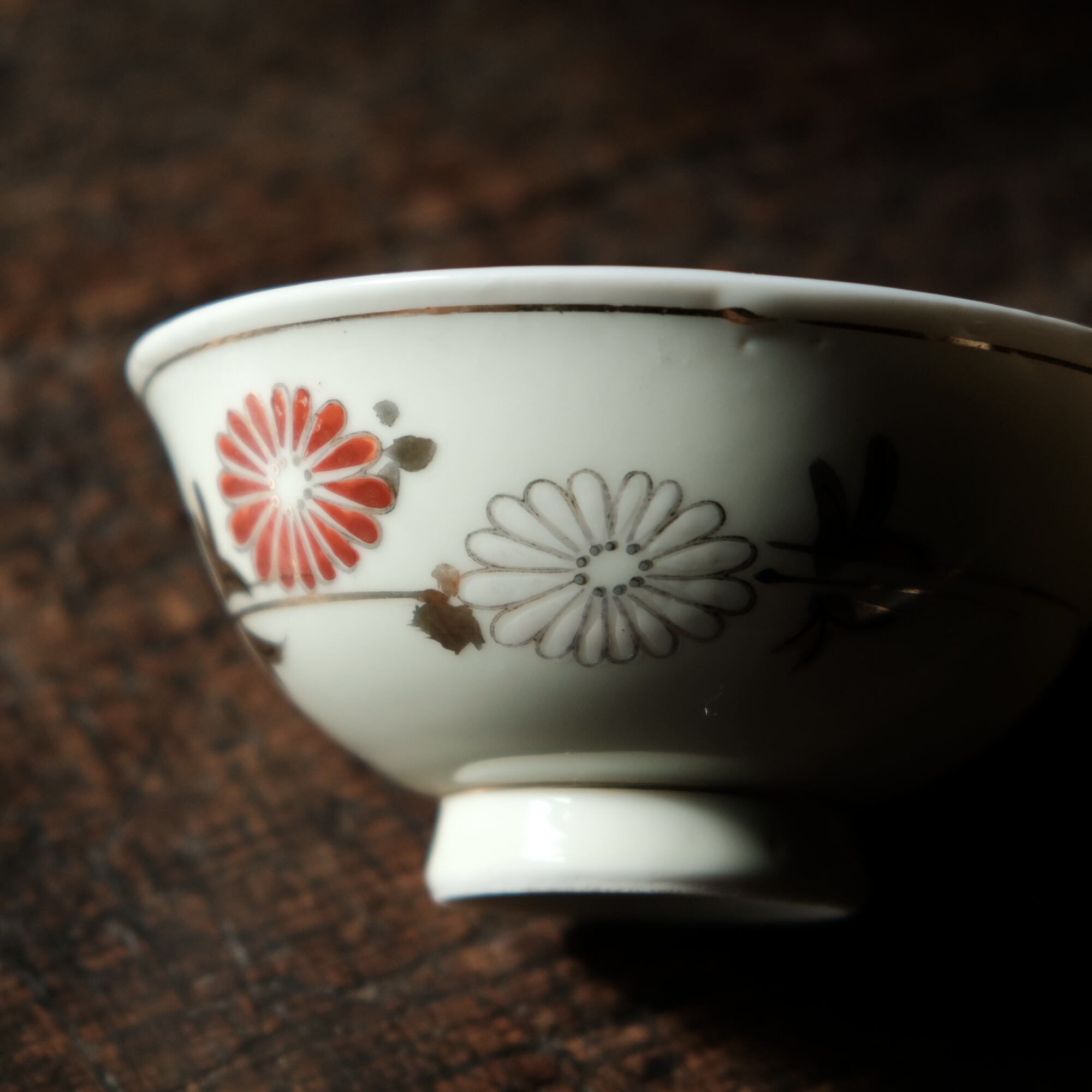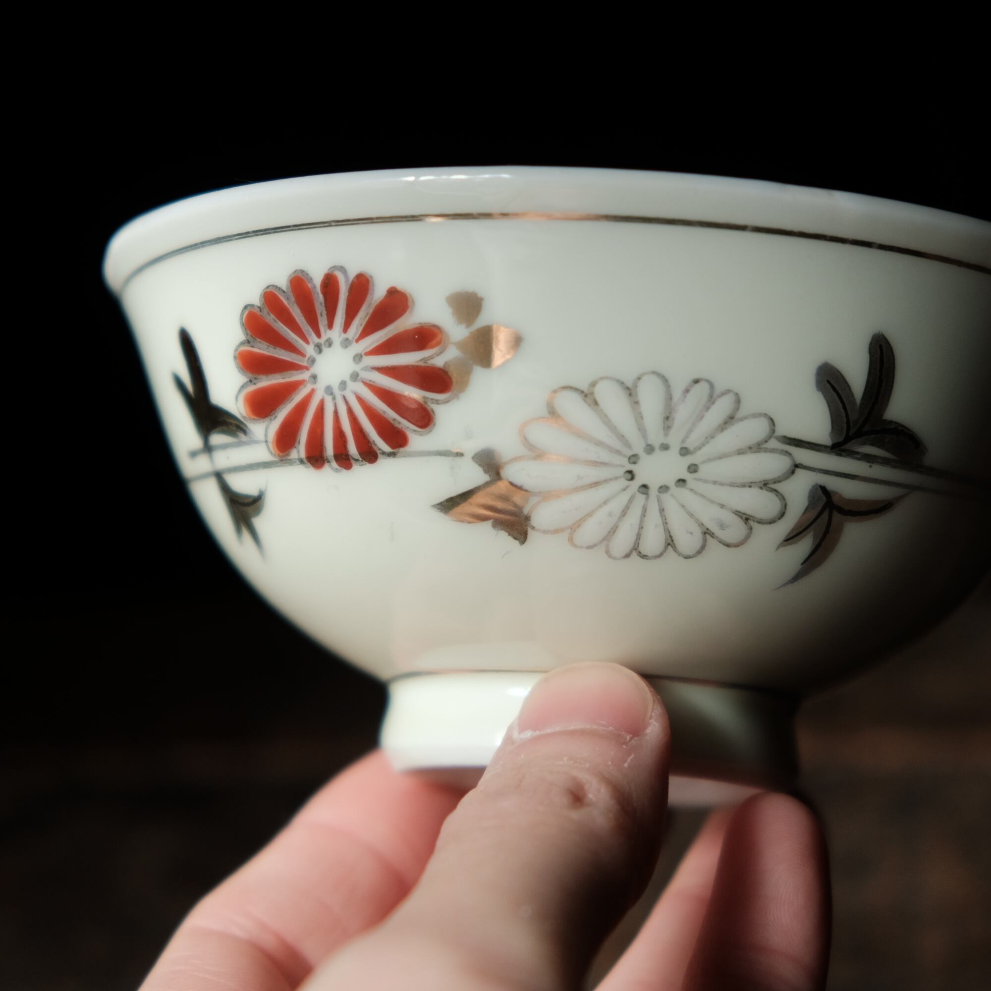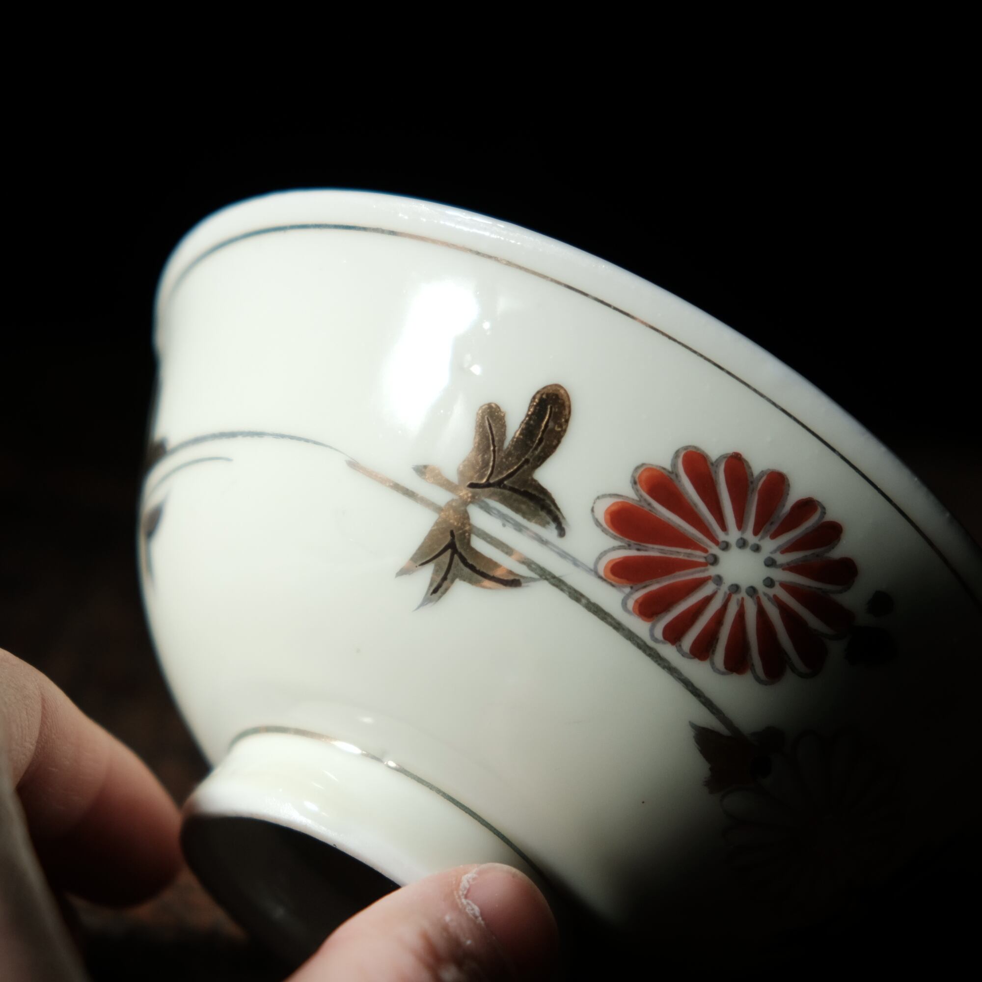 薄緑で素敵◆赤と白い花 瀬戸焼 色絵金彩飯碗 骨董/antiques 古民家 古道具 大正〜昭和初期