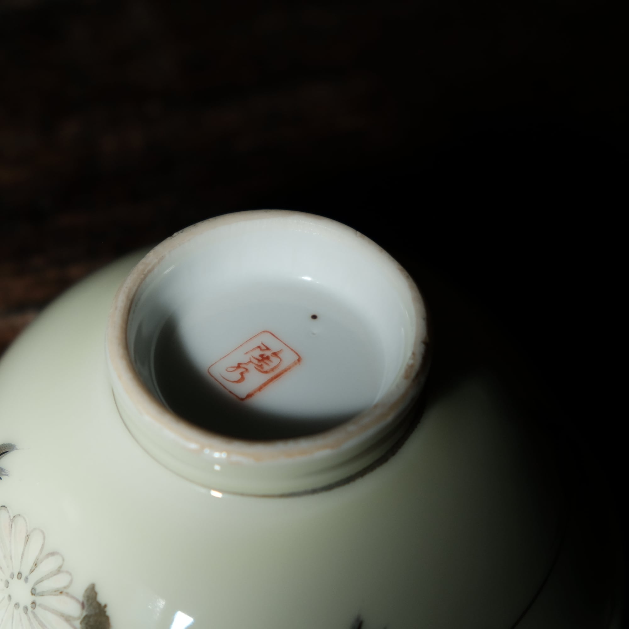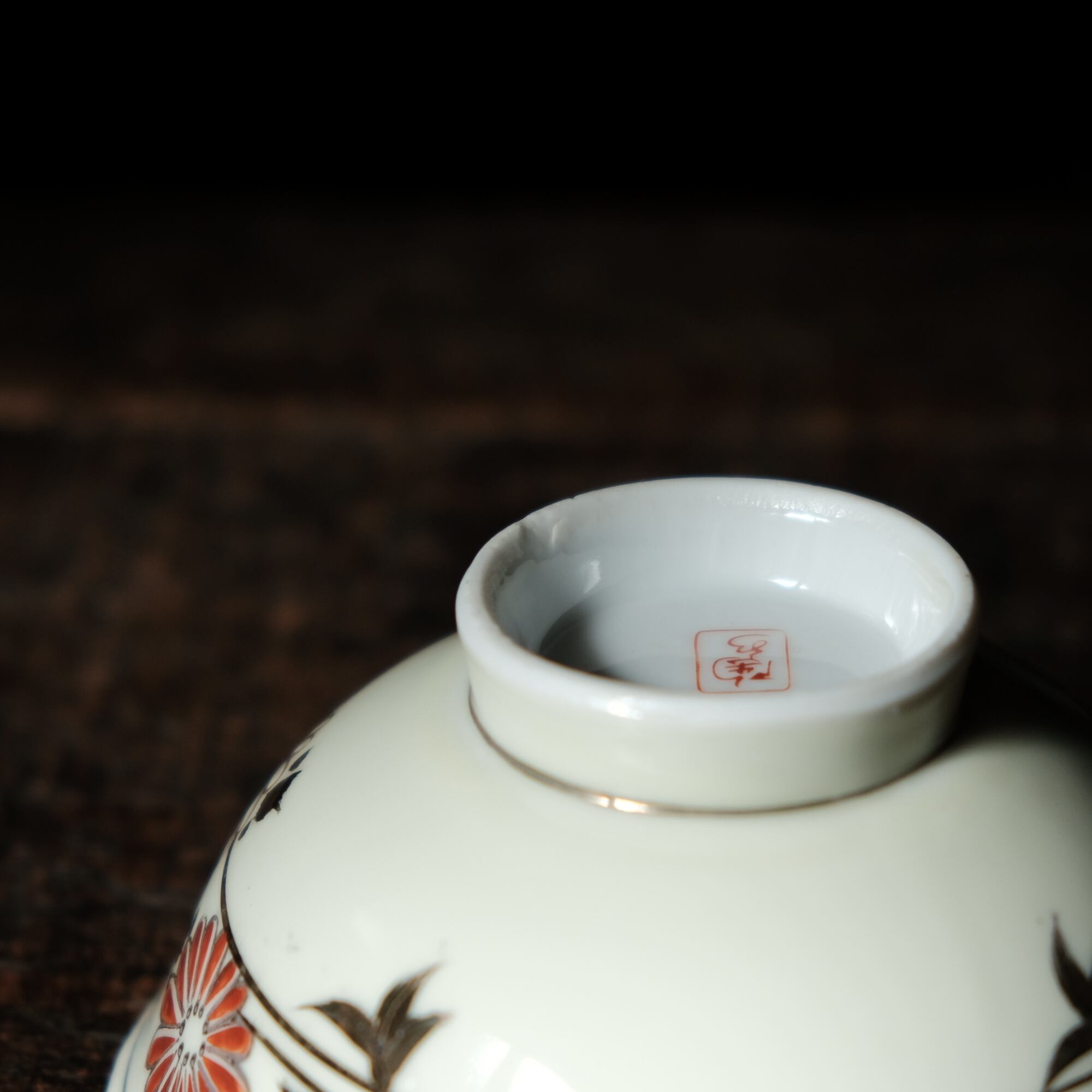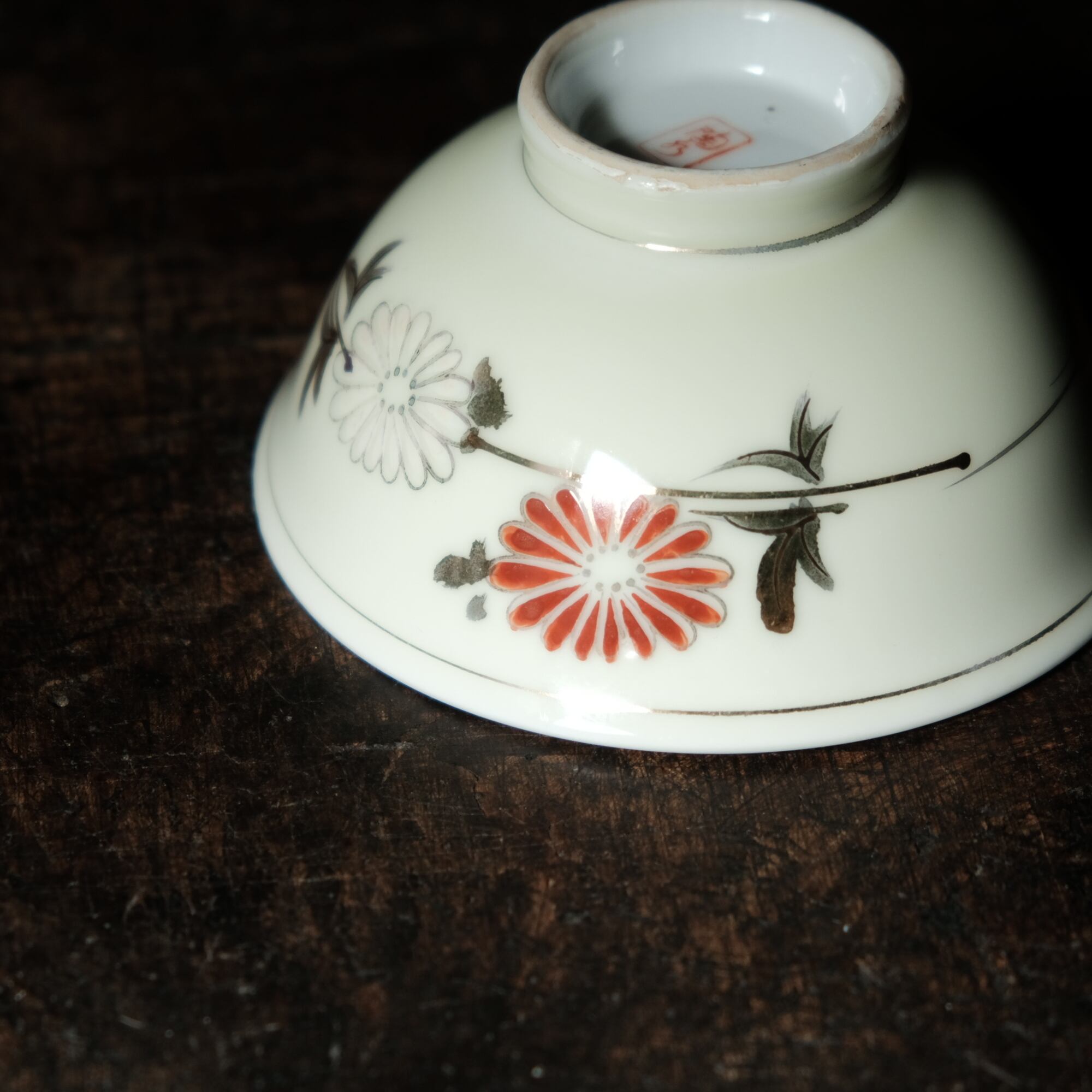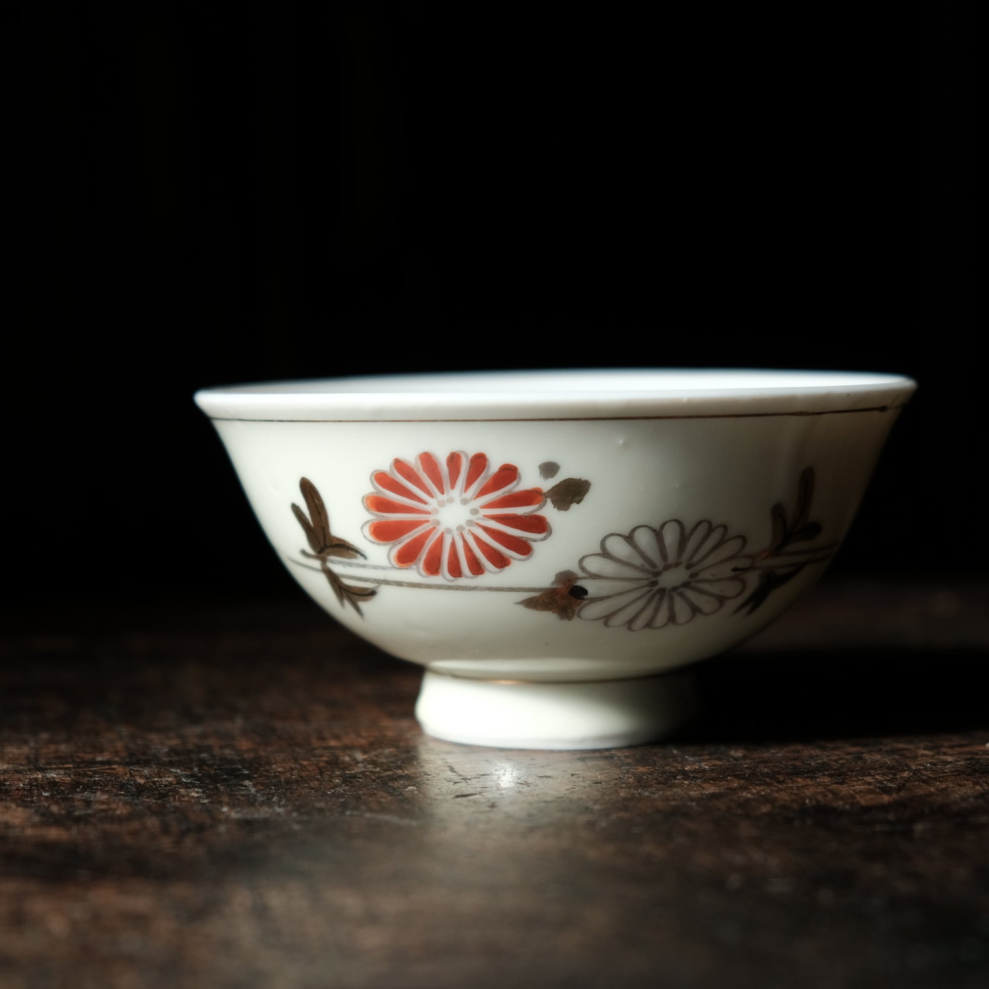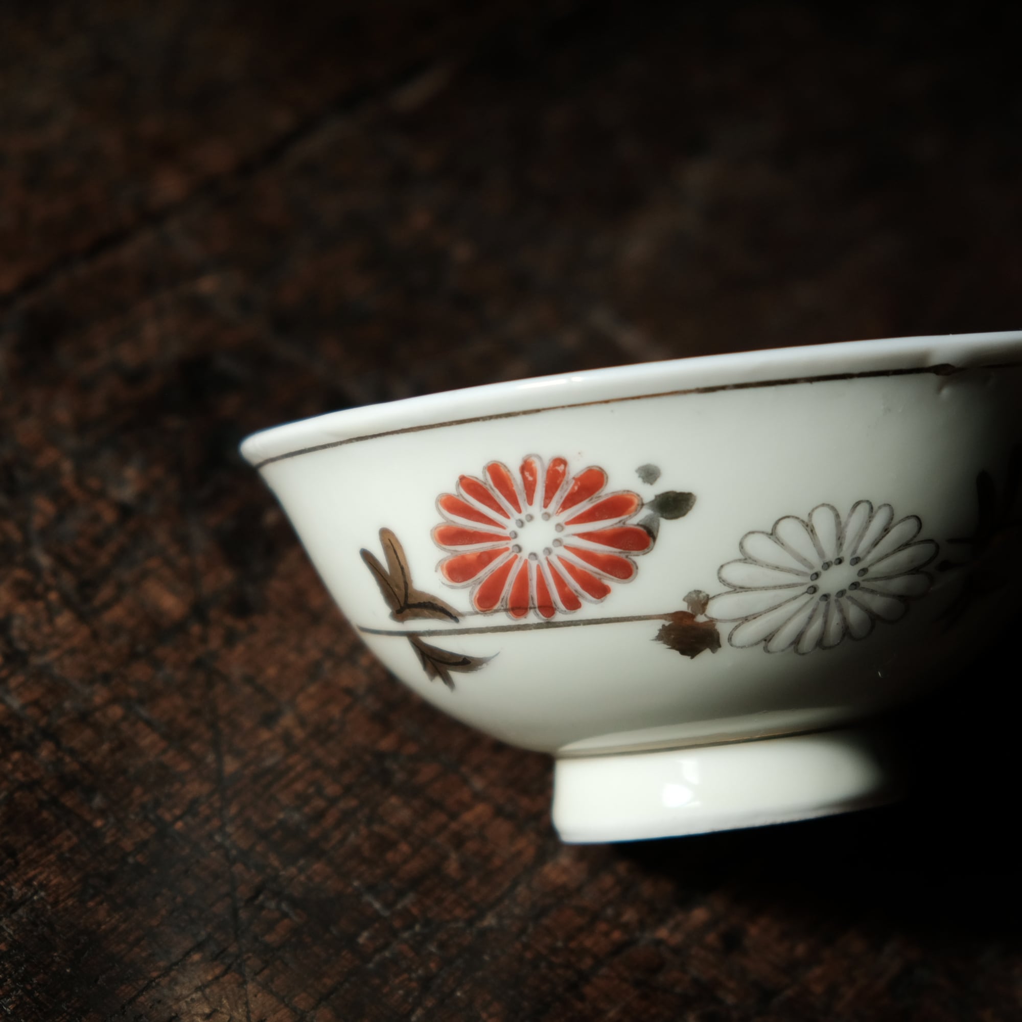 薄緑で素敵◆赤と白い花 瀬戸焼 色絵金彩飯碗 骨董/antiques 古民家 古道具 大正〜昭和初期