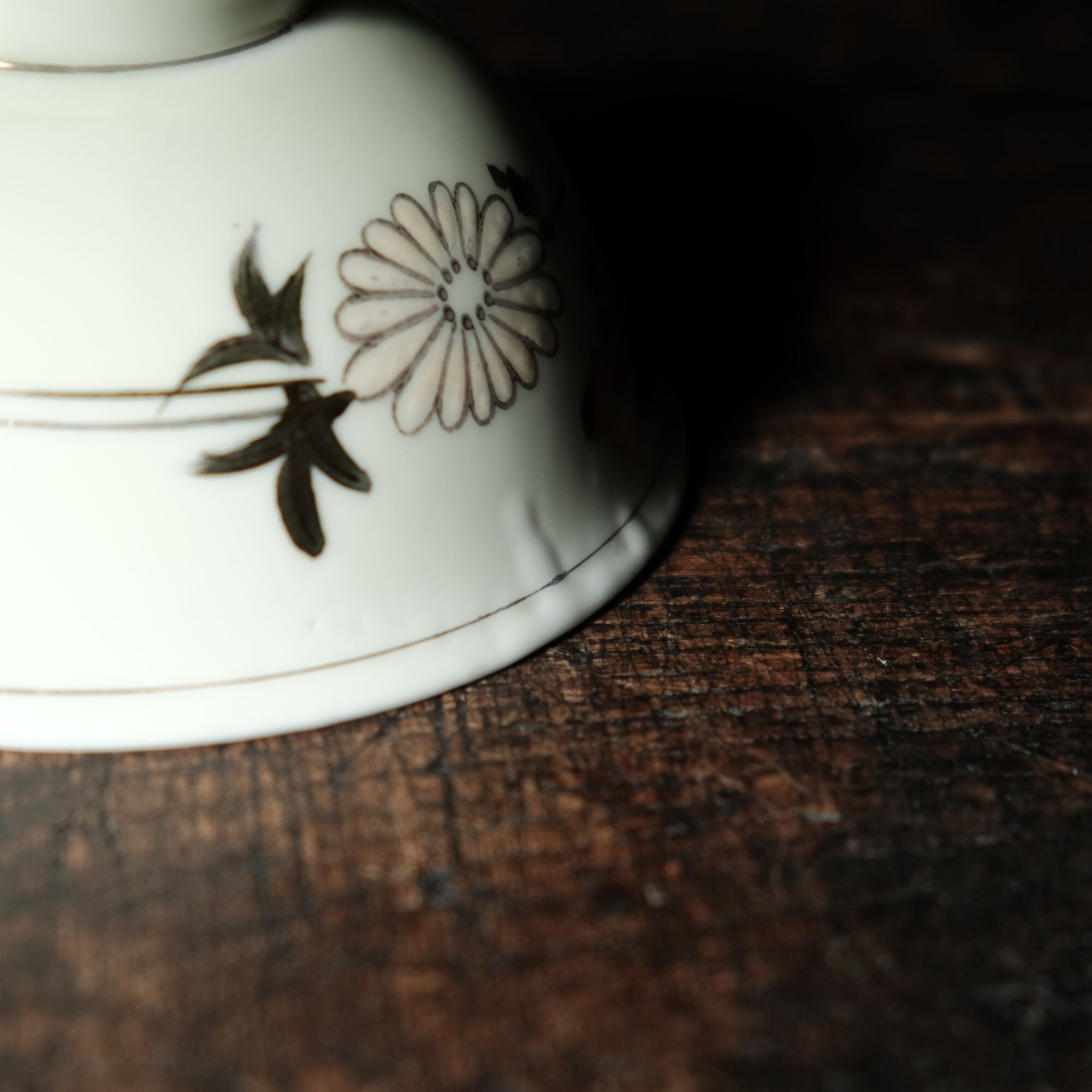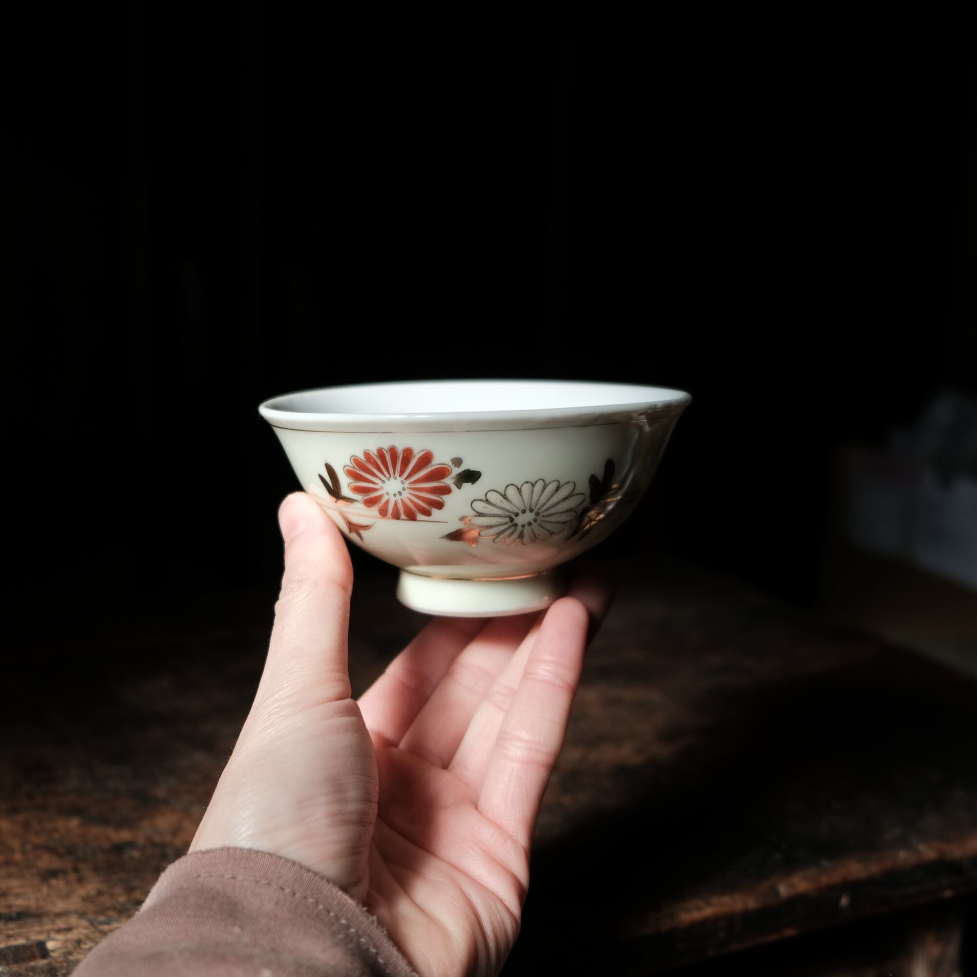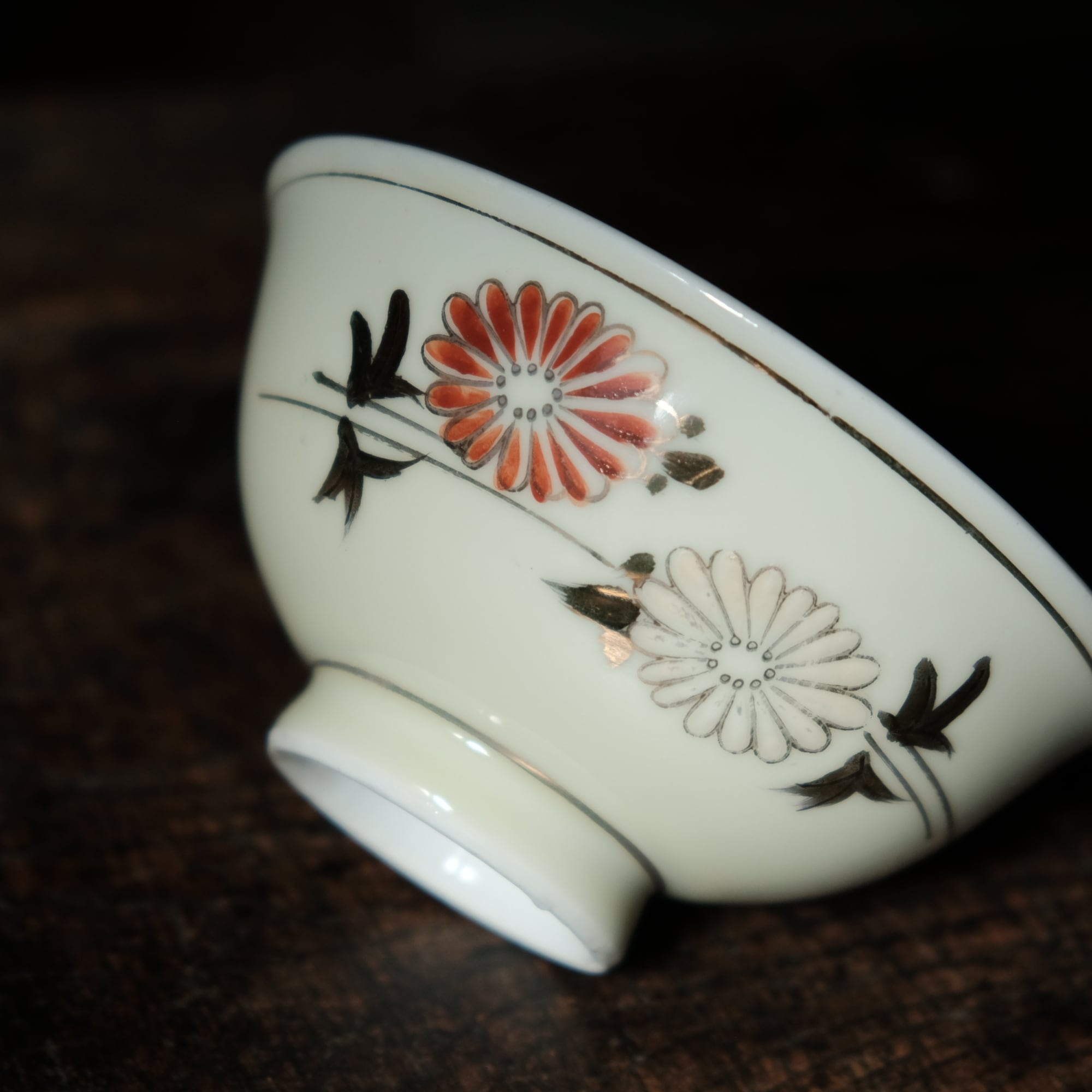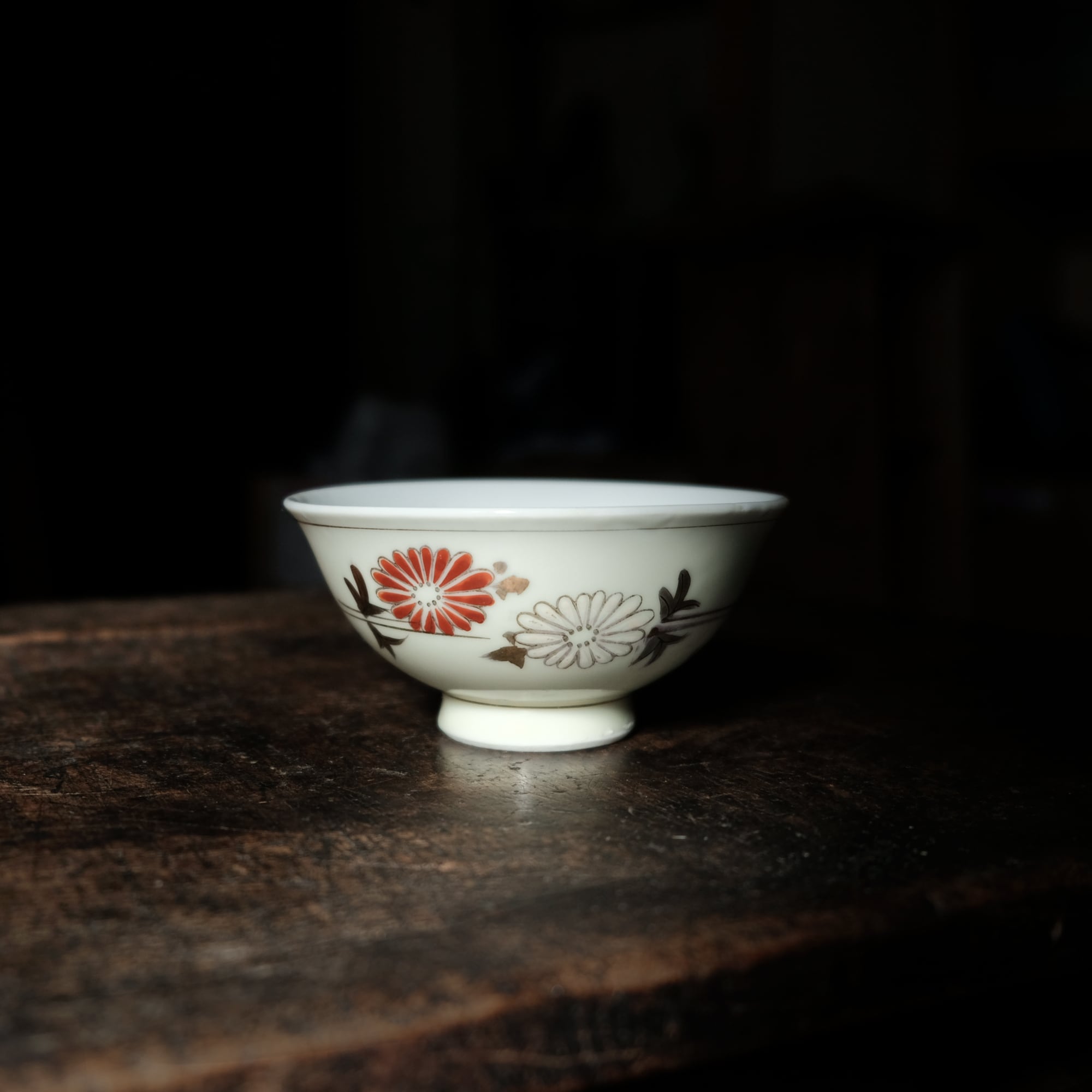 薄緑で素敵◆赤と白い花 瀬戸焼 色絵金彩飯碗 骨董/antiques 古民家 古道具 大正〜昭和初期