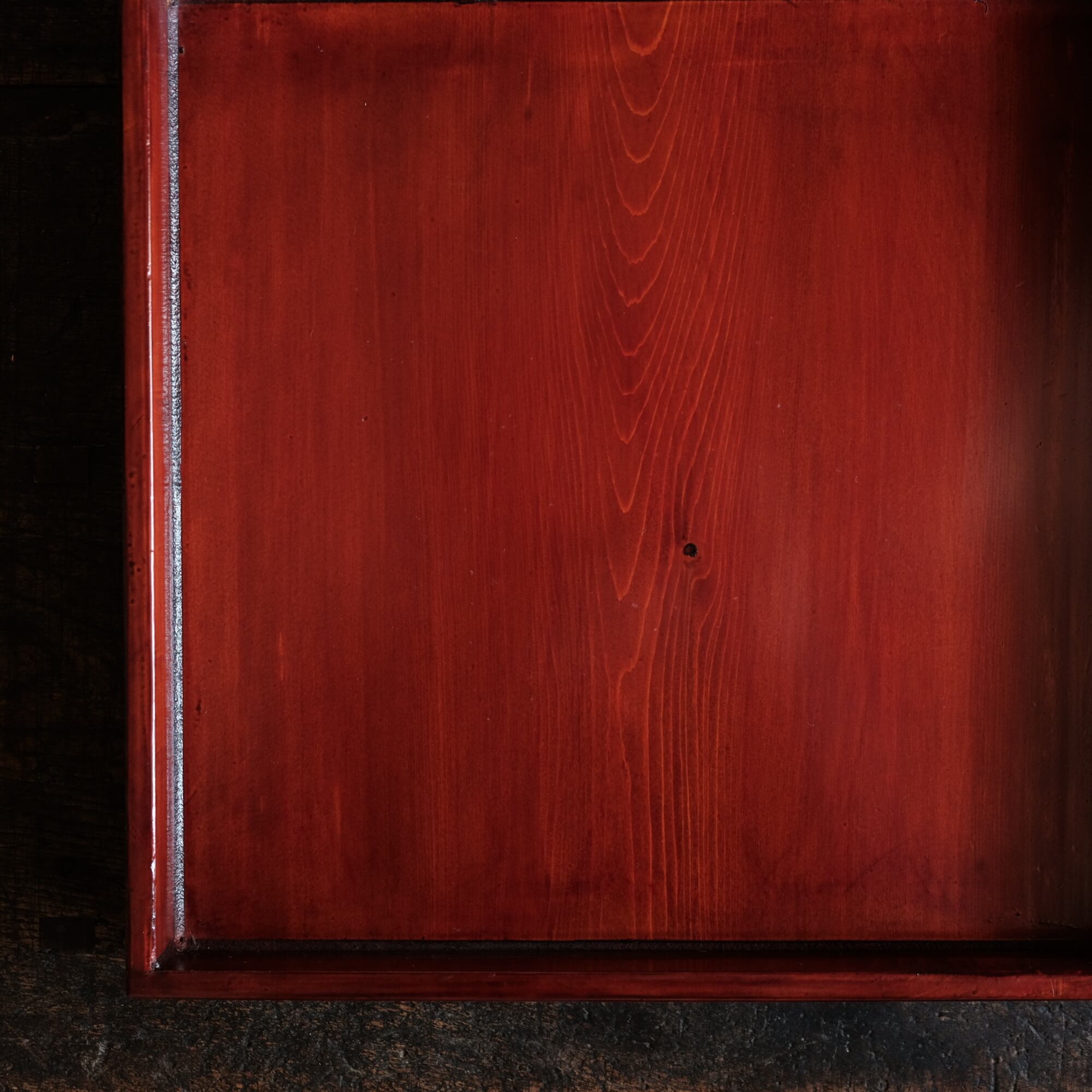 縁と盆面の繋ぎ目に木地と漆の収縮差によって生じる漆ビビや微々たる隙間など生じておりますがこの手の盆にはよく見られれる現象で、しっかりとした造りなので普通のご使用には問題ございません。