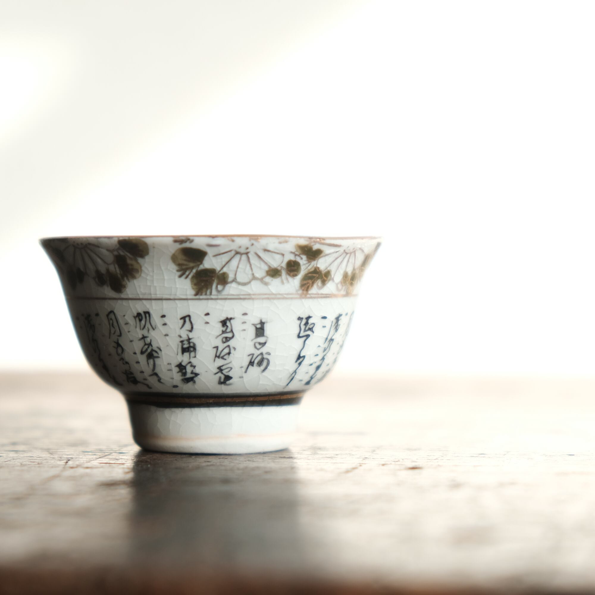 菊と漢文◇九谷焼 色絵金彩小ぶり猪口 丁寧な暮らしに。酒器 骨董・antiques好きにも。