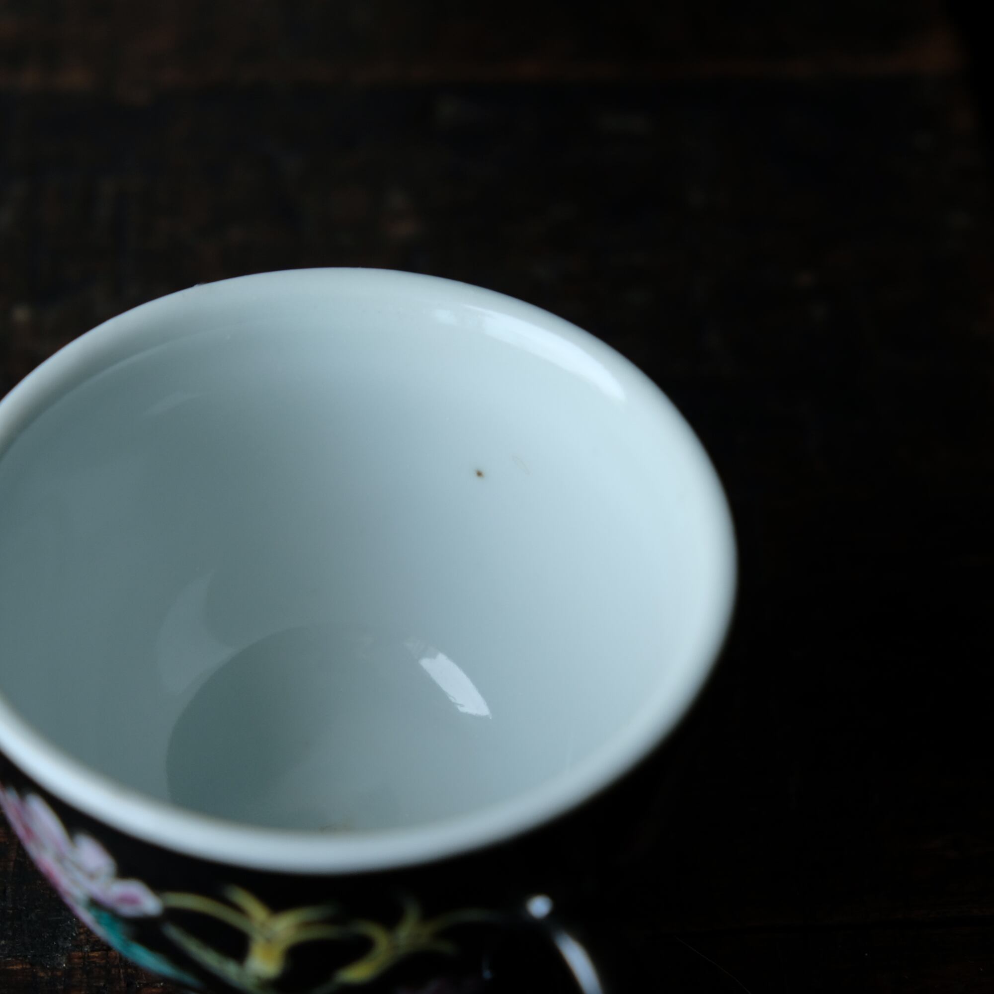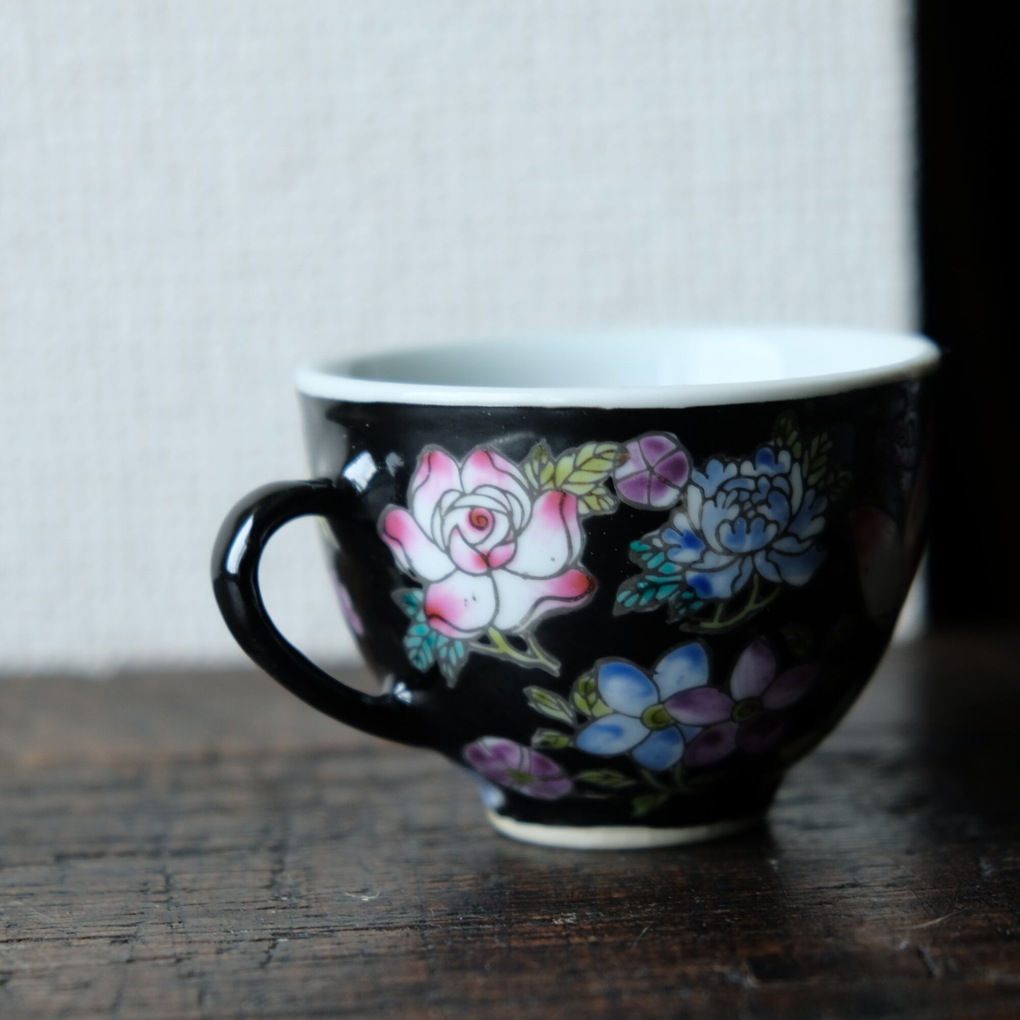 中国景徳鎮◆黒にカラフルな花。色絵カップ 器 シノワズリ チャイナレトロ 暮らしに。BK