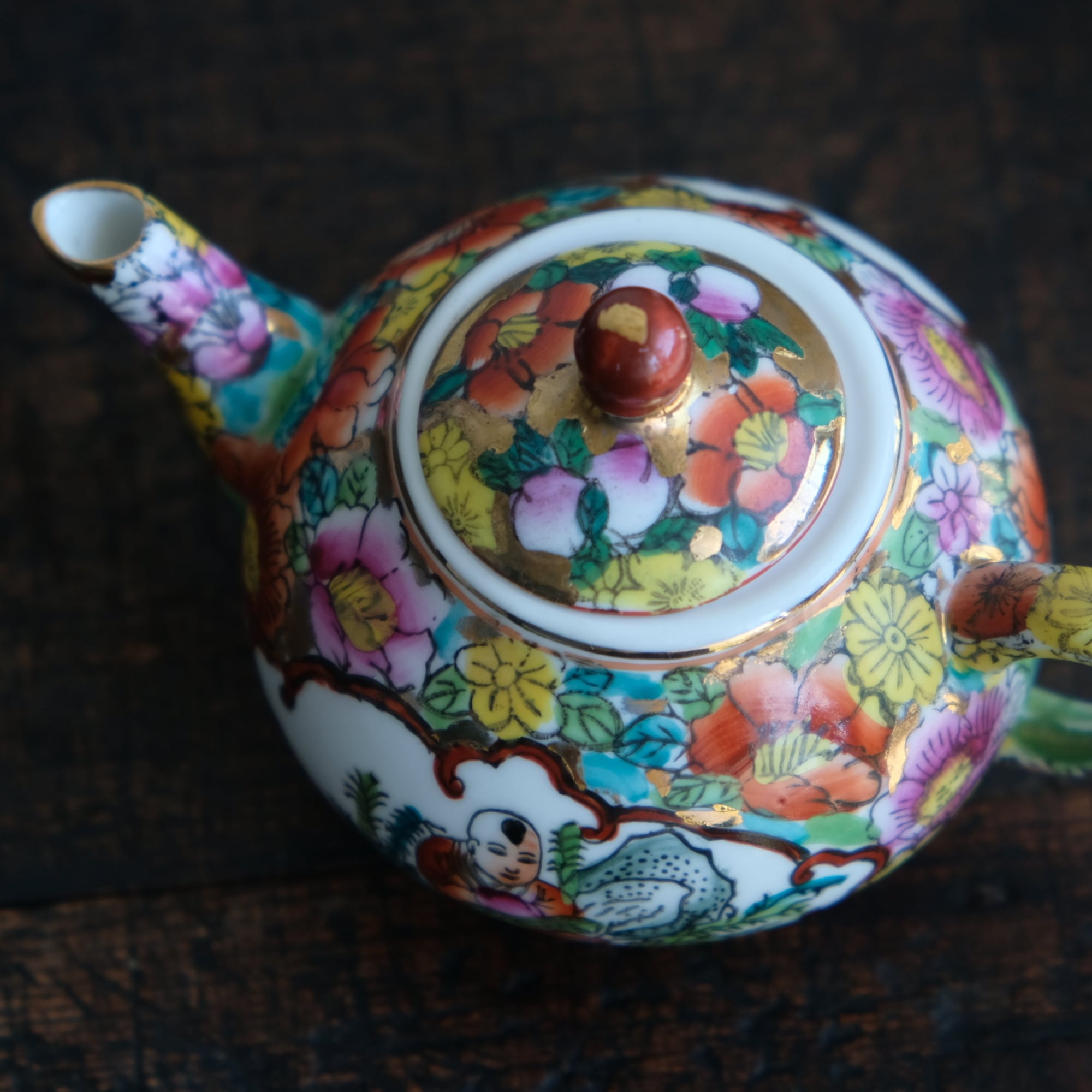 金にカラフルな花尽くし◆唐子もいる。中国景徳鎮 色絵金彩小ぶり急須 煎茶茶器 チャイナレトロ シノワズリ