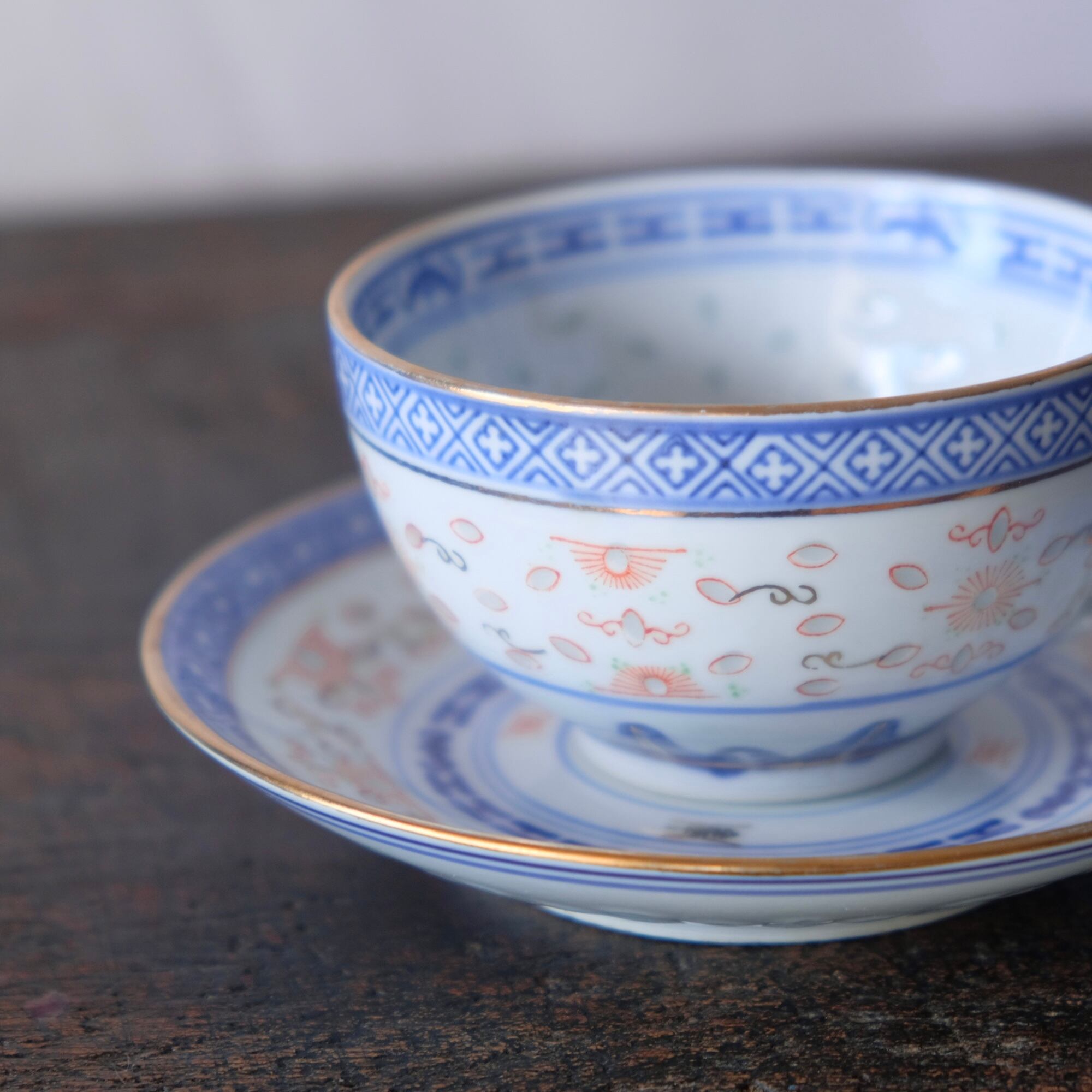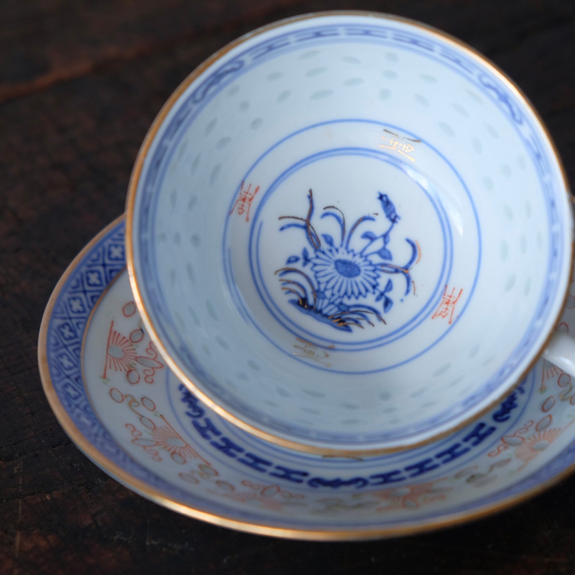 チャイナレトロで可愛い◇見込みに青花。中国景徳鎮 赤絵金彩蛍焼 カップ&ソーサー 蝙蝠 漢字 茶器