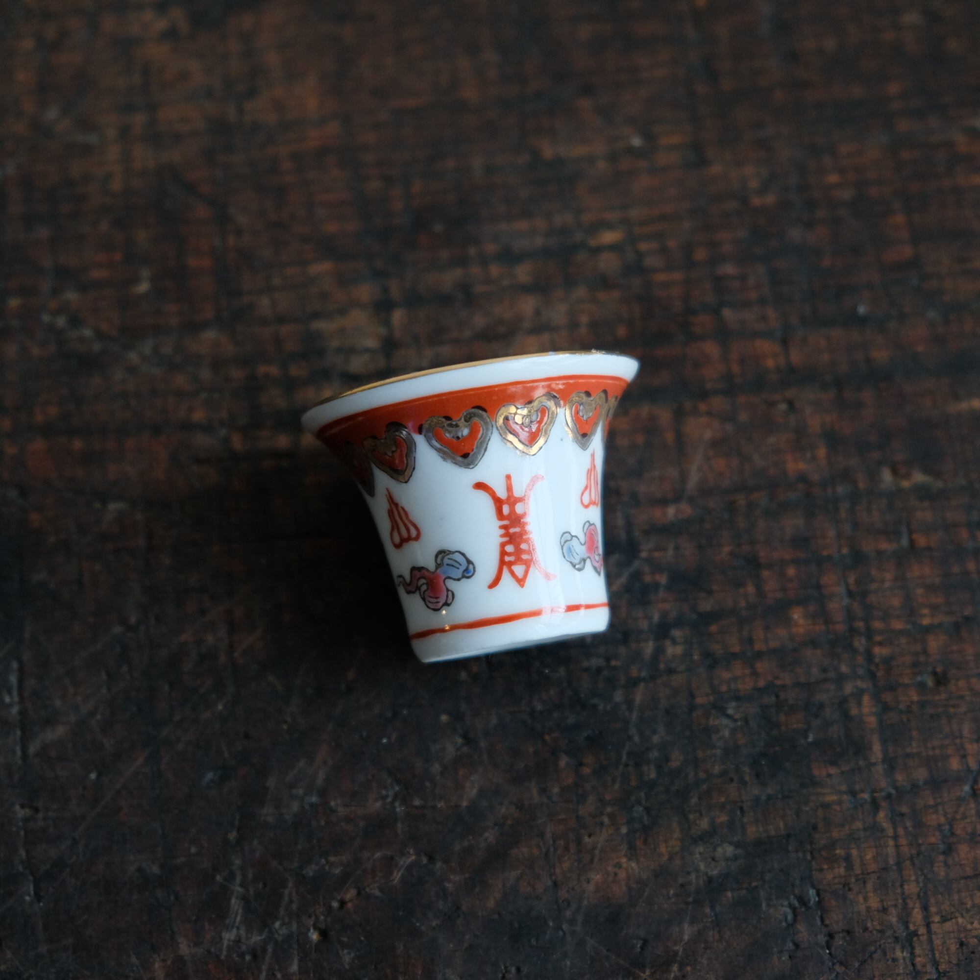 雲と漢字◇中国産 赤絵金彩小ぶり猪口 茶杯 器 チャイナレトロ ポップ 中華