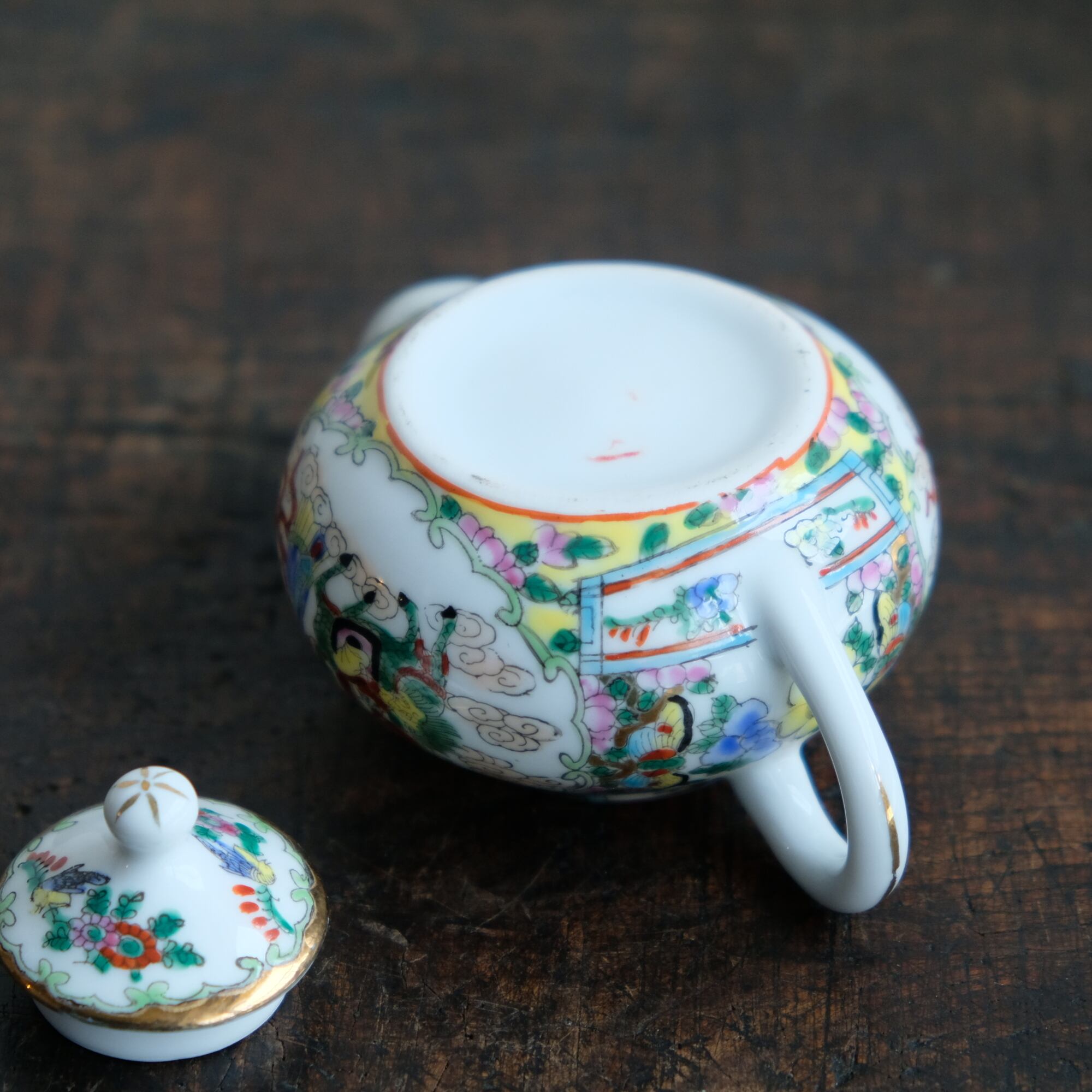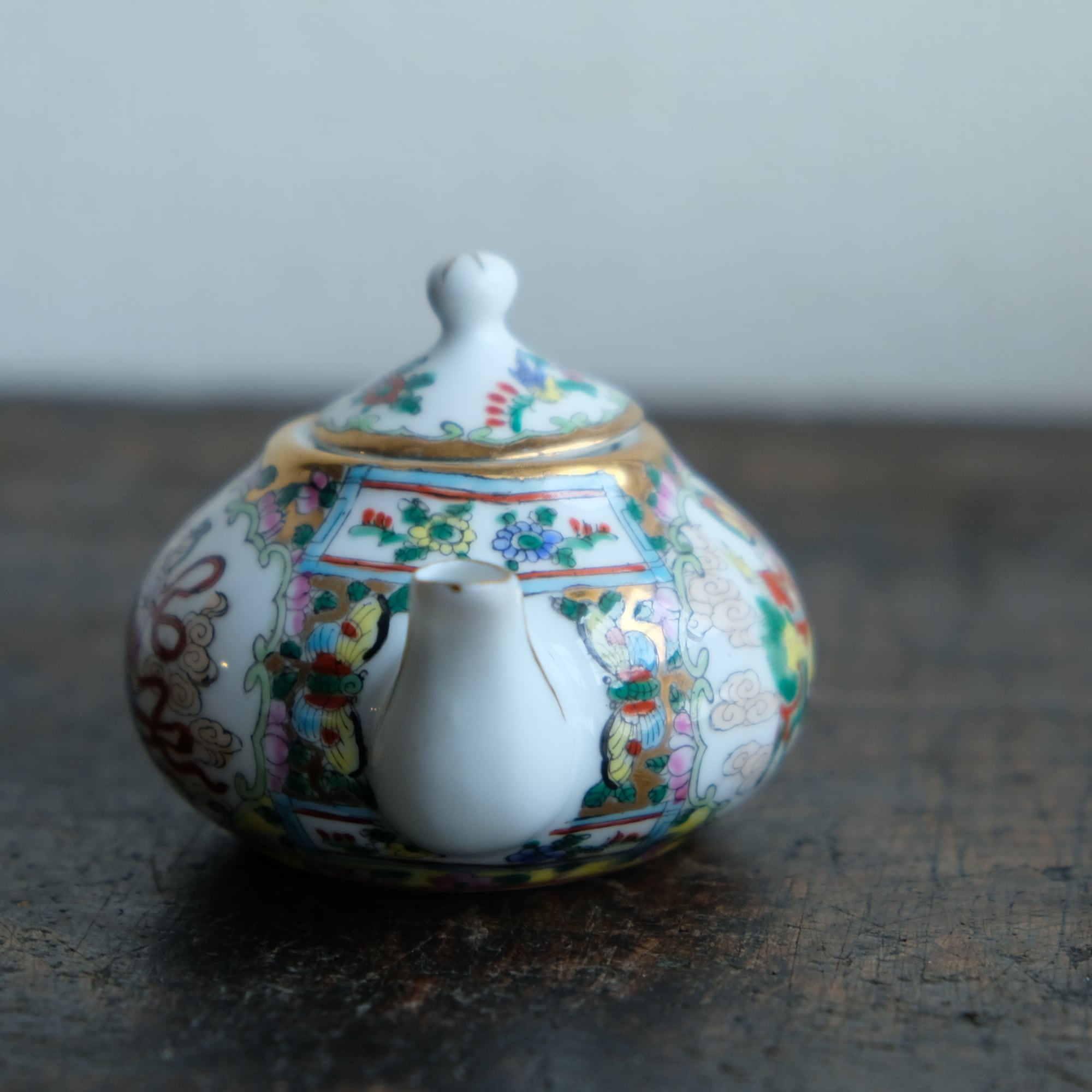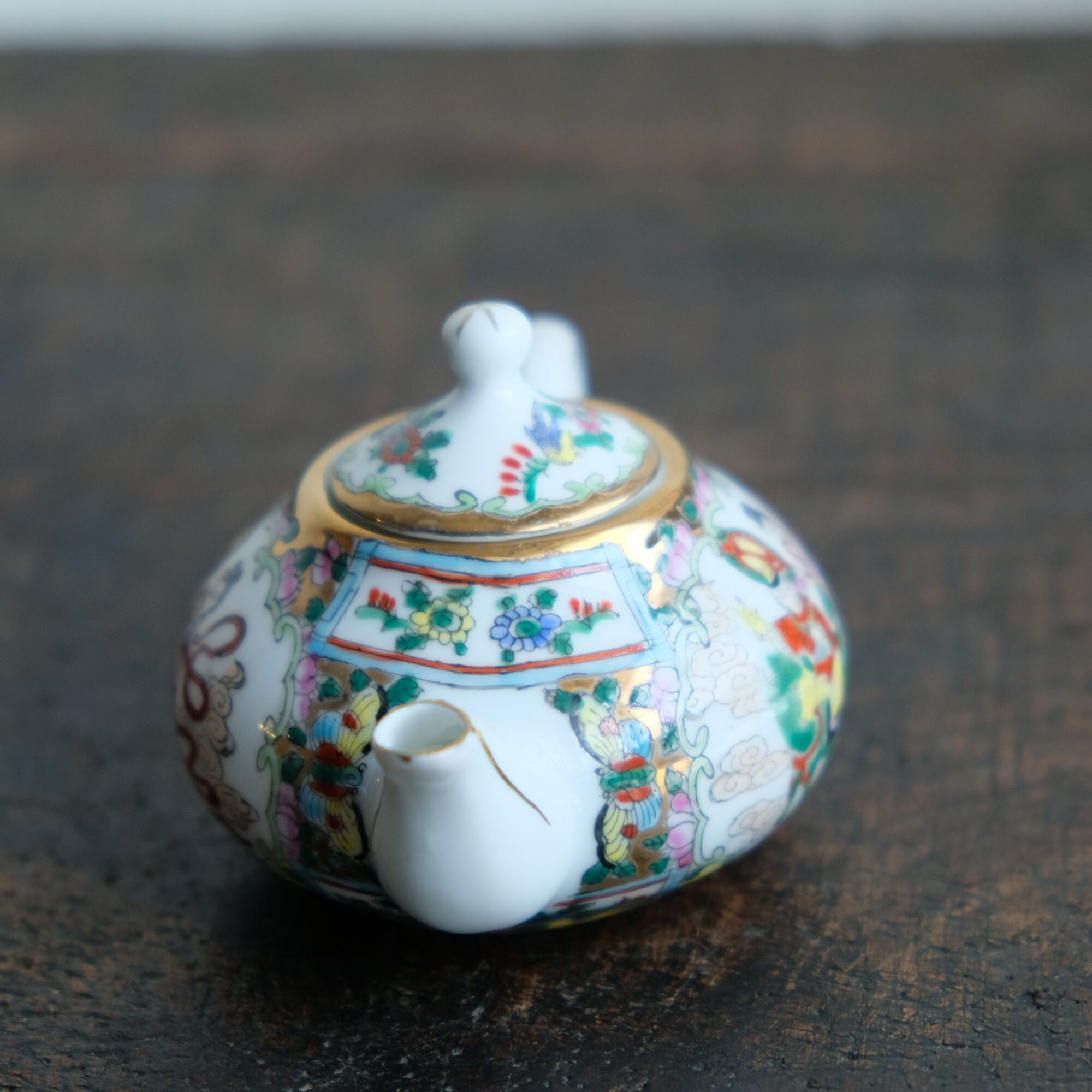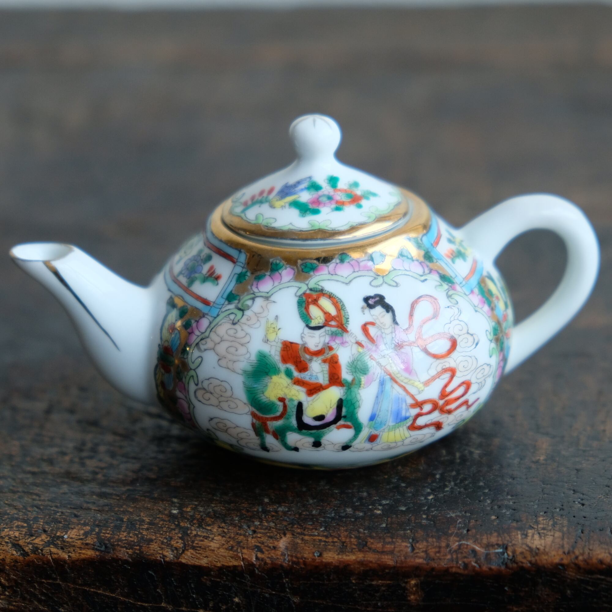 天女と麒麟に乗る唐子◆花と蝶と鳥。中国産 色絵金彩小ぶり急須 煎茶茶器 チャイナレトロ シノワズリ