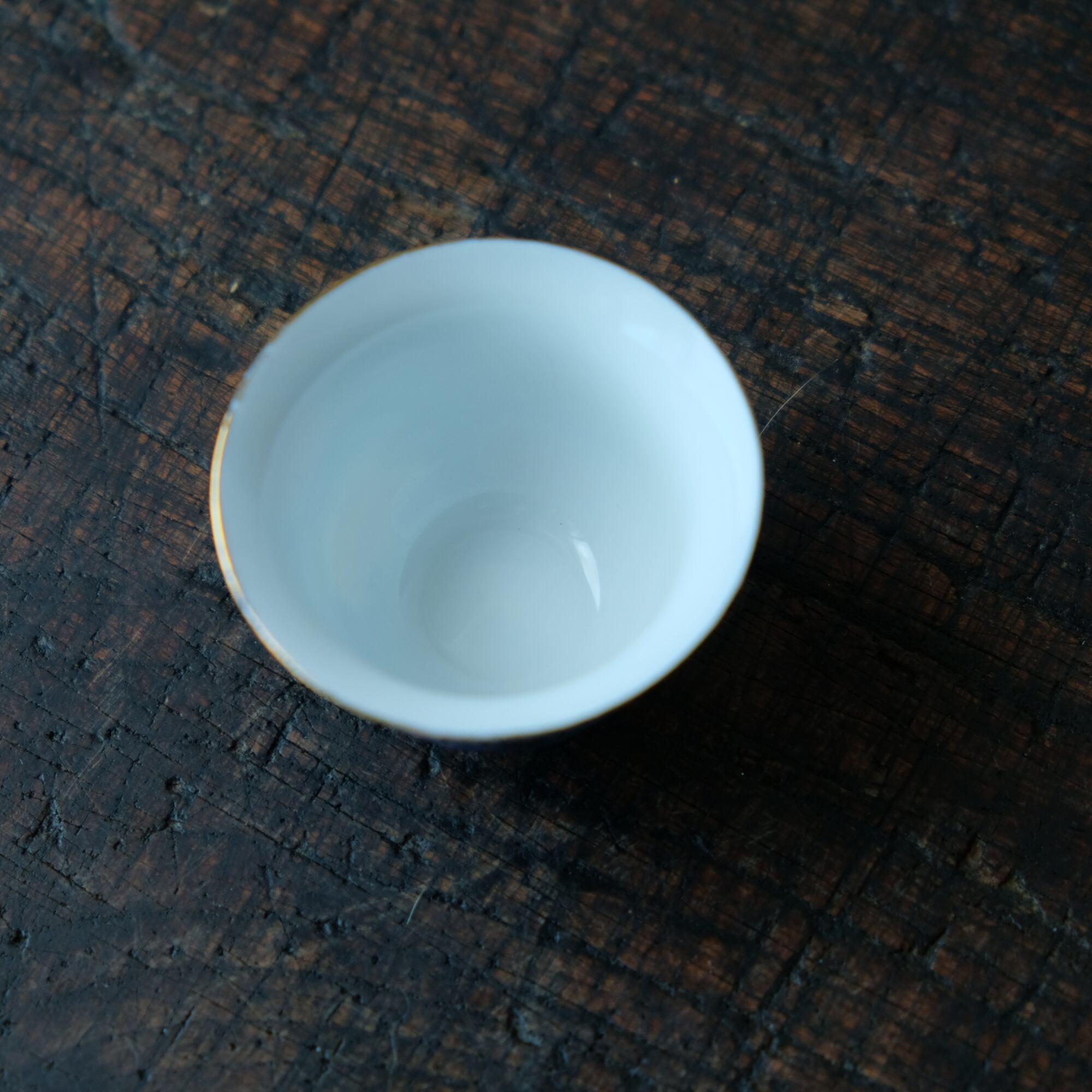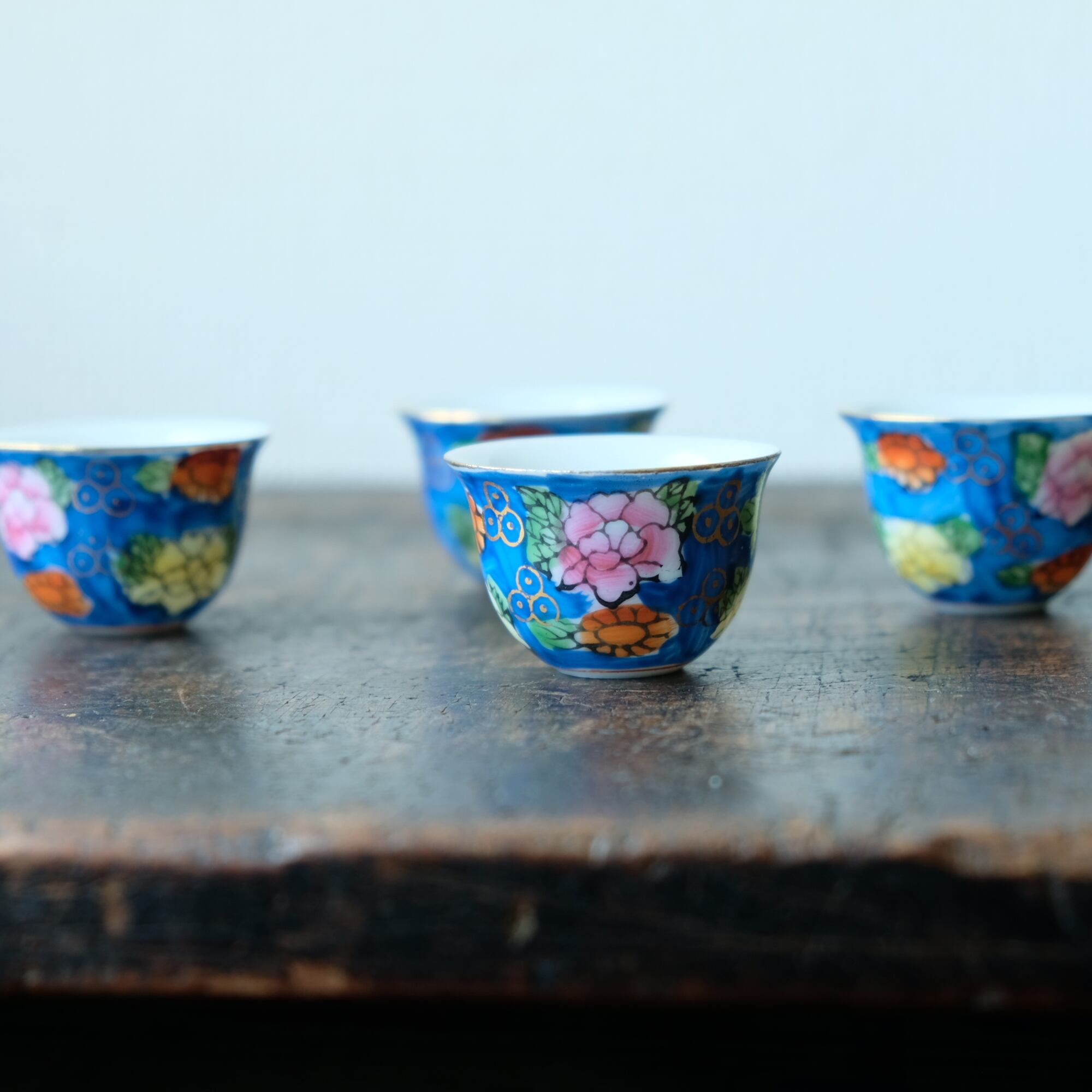 鮮やかな青にカラフルな花◆中国産 色絵金彩小ぶり猪口 茶杯 シノワズリ チャイナレトロ インテリア