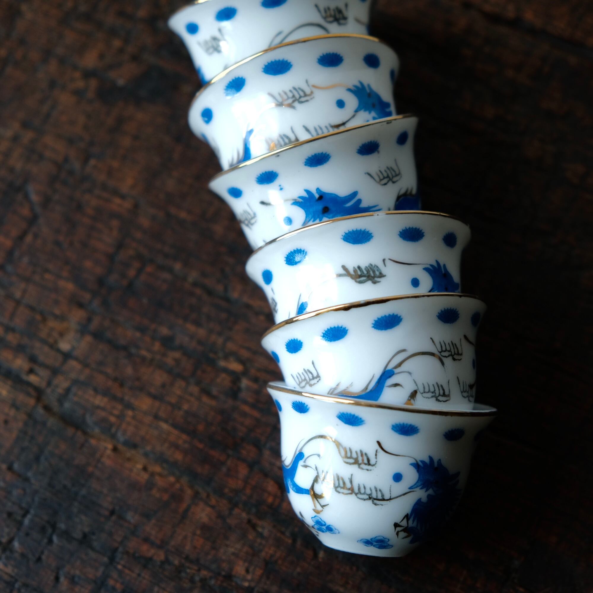 青で龍もキュート◇中国産 色絵金彩小ぶり猪口 茶杯 チャイナレトロ 転写 シノワズリ ブルー