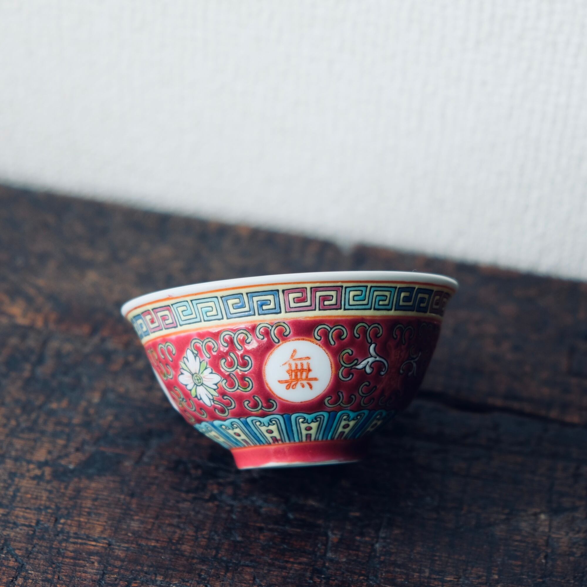 チャイナレトロで可愛い◇中国景徳鎮 花と漢字 色絵小ぶり碗 中華料理 映え 花唐草 寿 ピンク