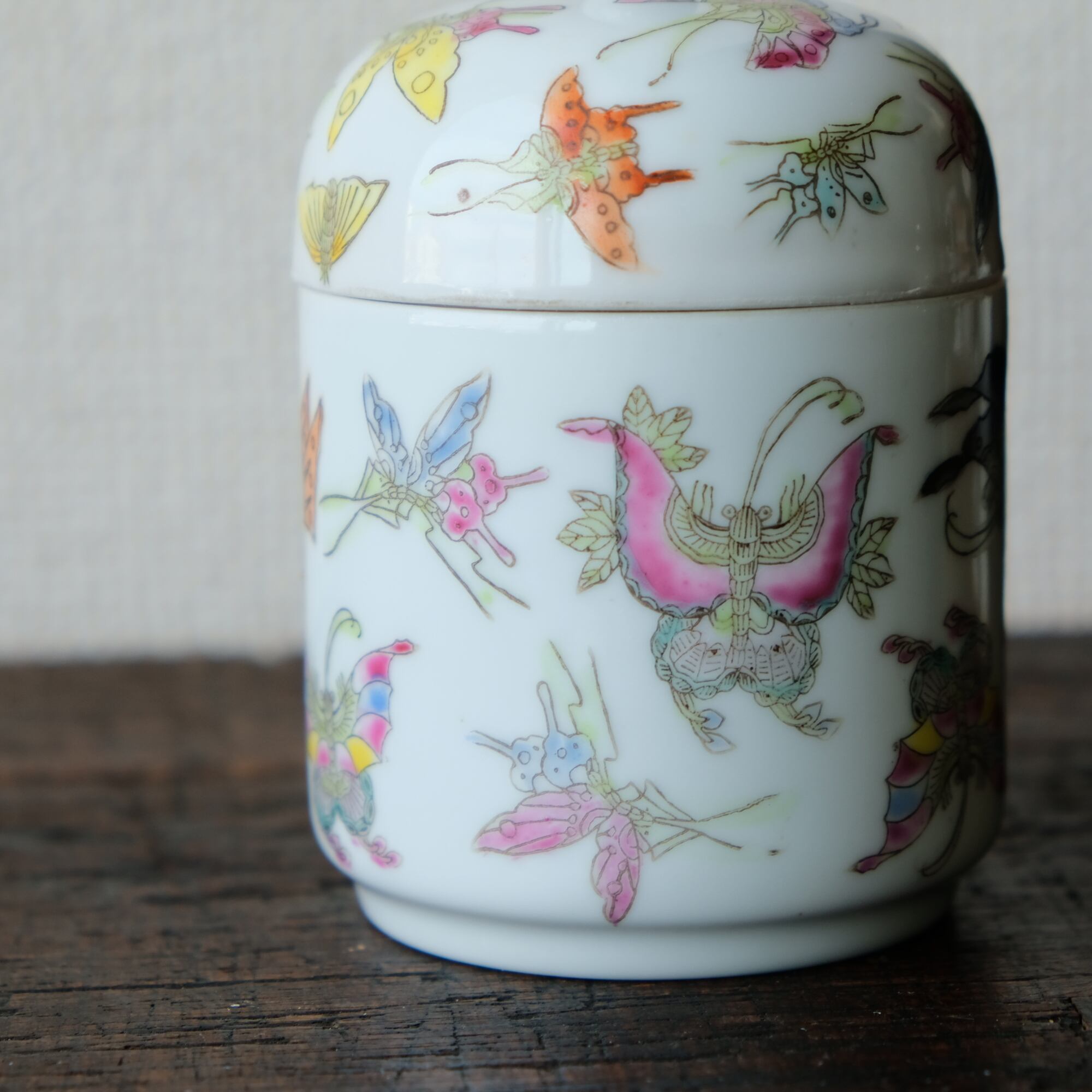 白にカラフルな蝶尽くし◇中国景徳鎮 色絵蓋付茶壷 器 茶器 ホワイト 白 チャイナレトロ 個体B