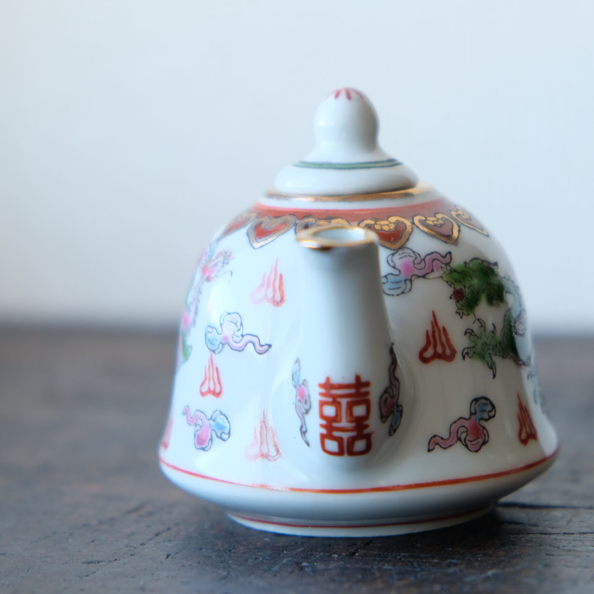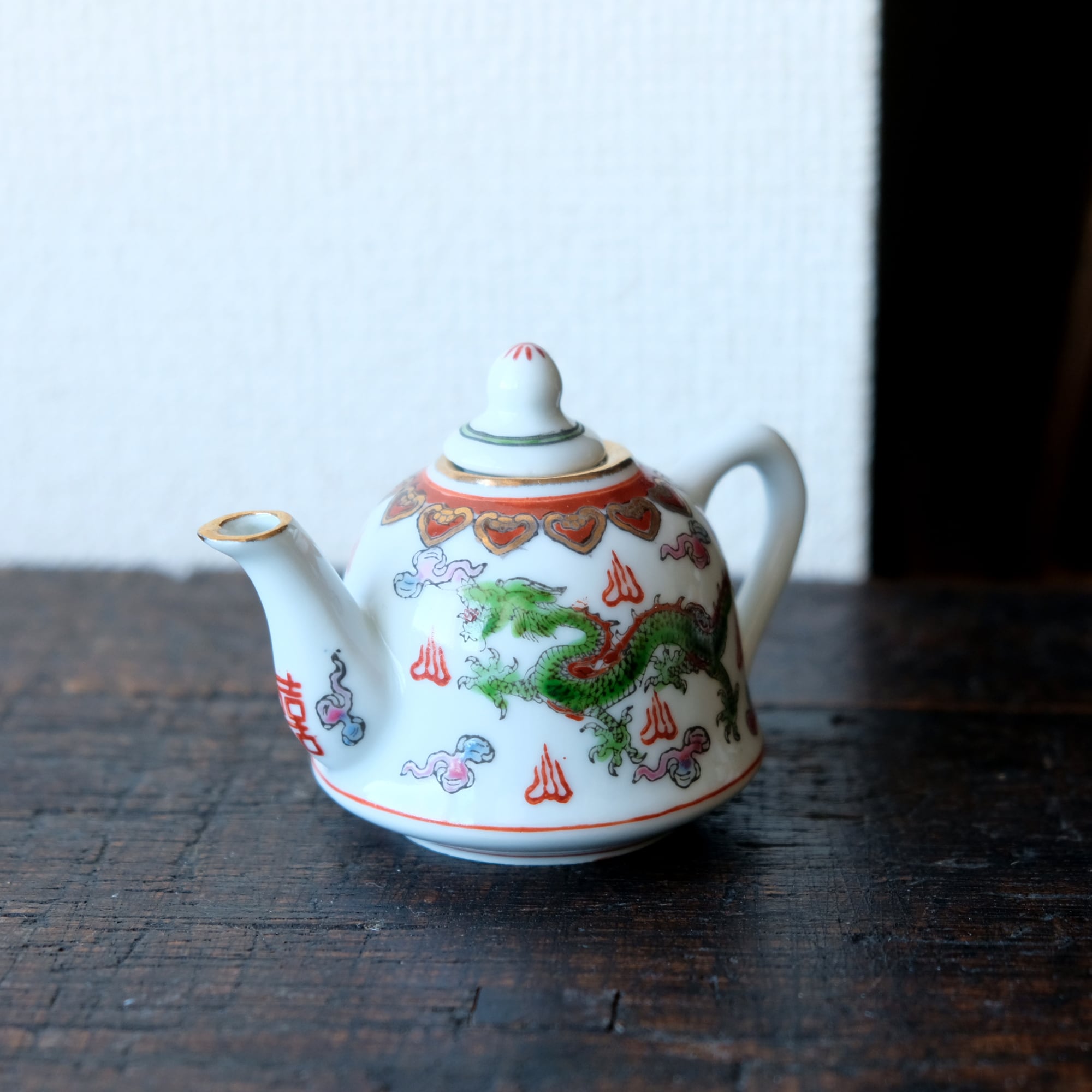 チャイナレトロで可愛い◇龍と鳳凰。中国景徳鎮 赤絵金彩小ぶり急須 煎茶茶器 雲と漢字。インテリア