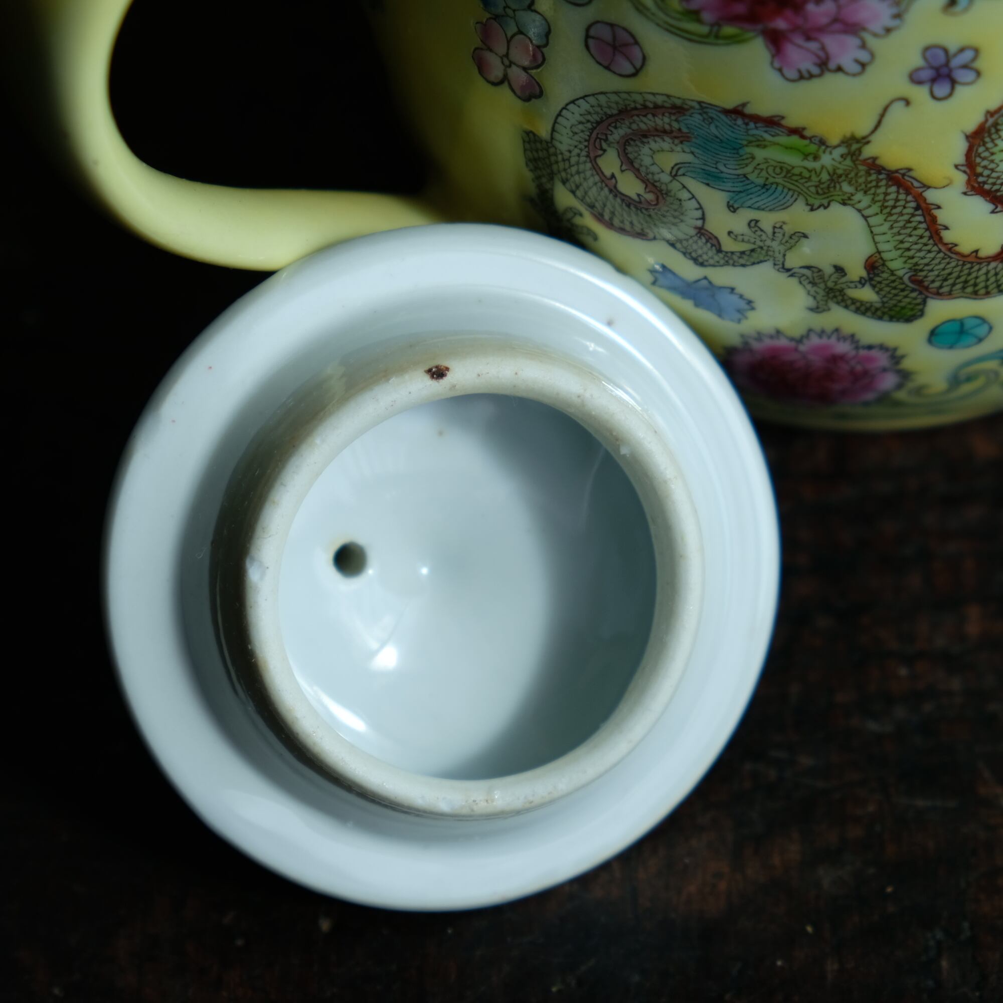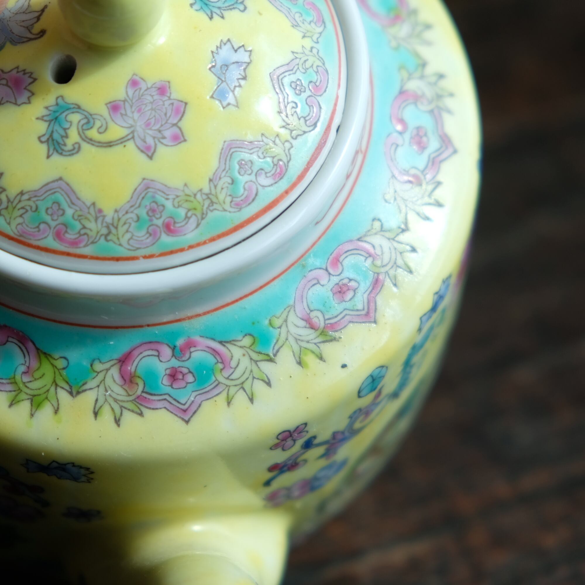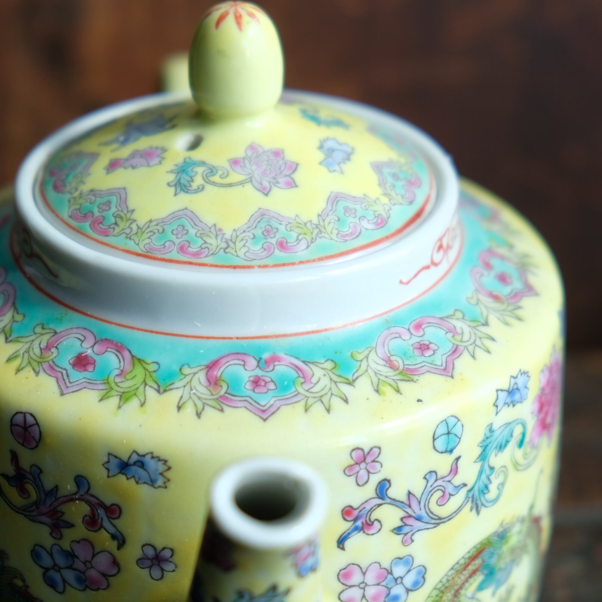 パステル調のカラーで可愛い◆花と龍。中国景徳鎮 色絵急須 茶器 黄色 ポップ チャイナレトロ