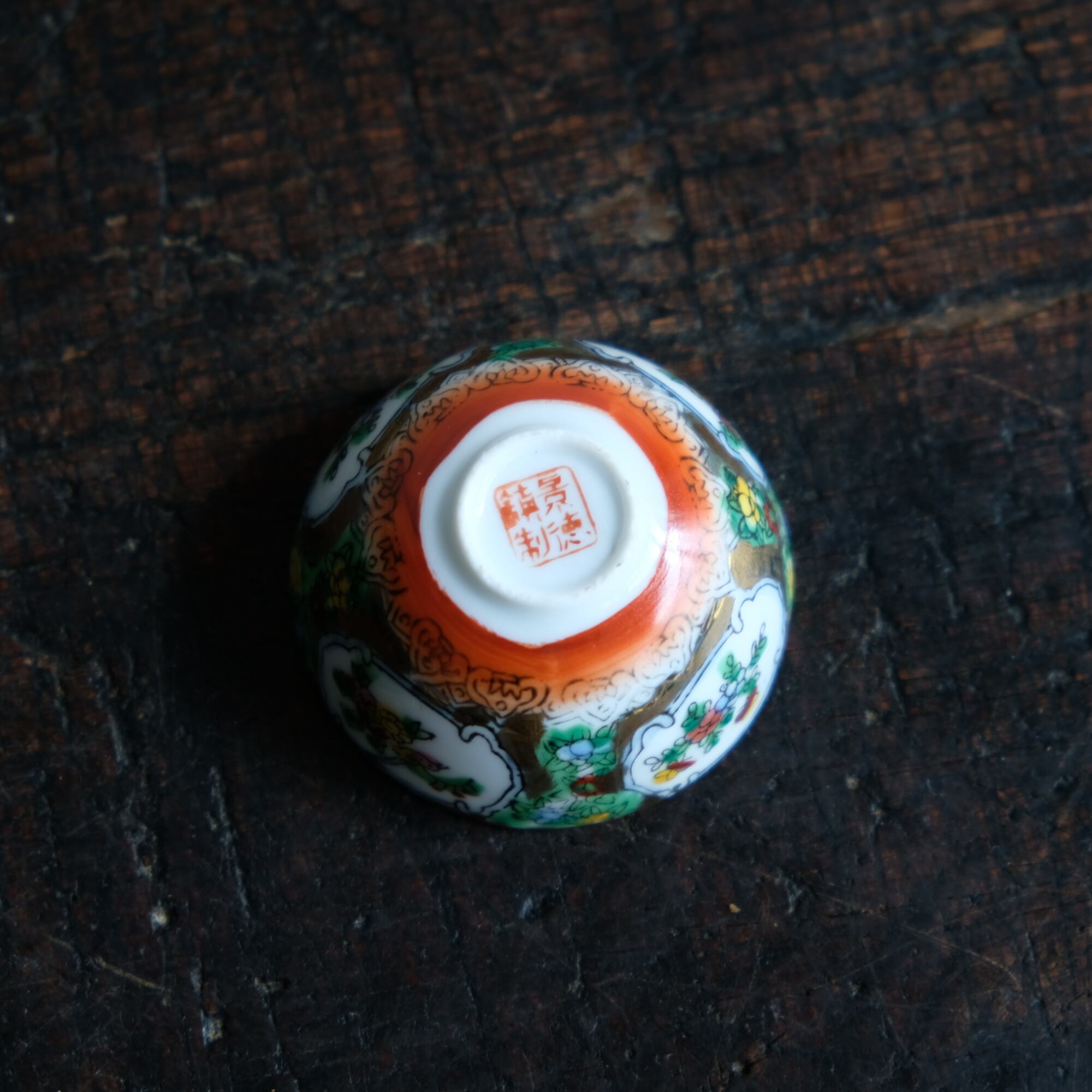 花と蝶と鳥と人◆カラフルな花尽くし。中国景徳鎮 チャイナレトロ 色絵金彩小ぶり猪口 シノワズリ