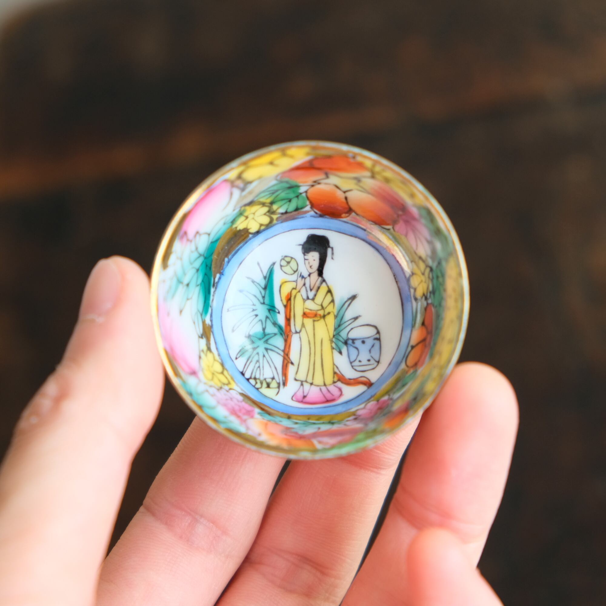 見込みに皇女◆カラフルな花と果実。中国景徳鎮 チャイナレトロ 色絵金彩小ぶり猪口 シノワズリ E
