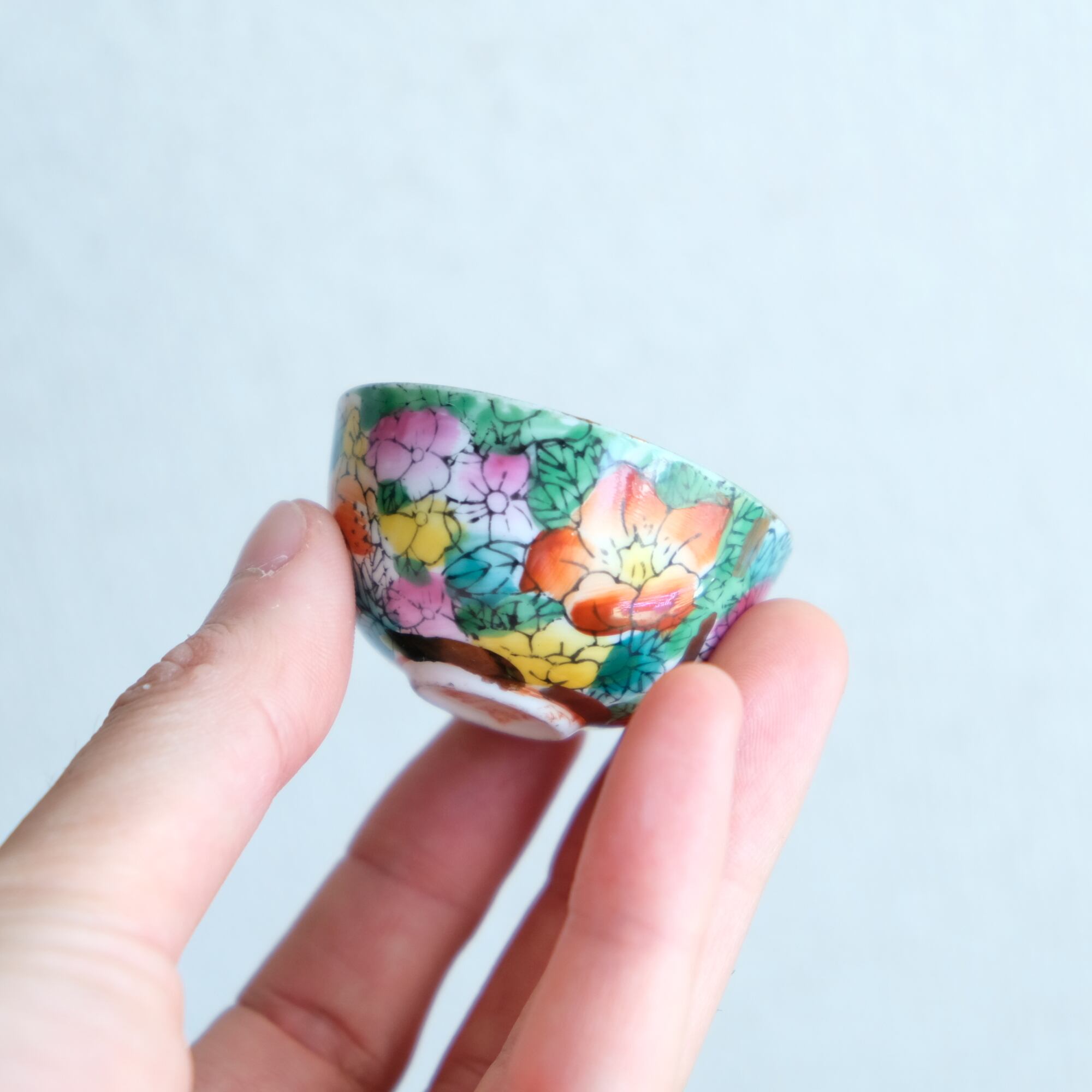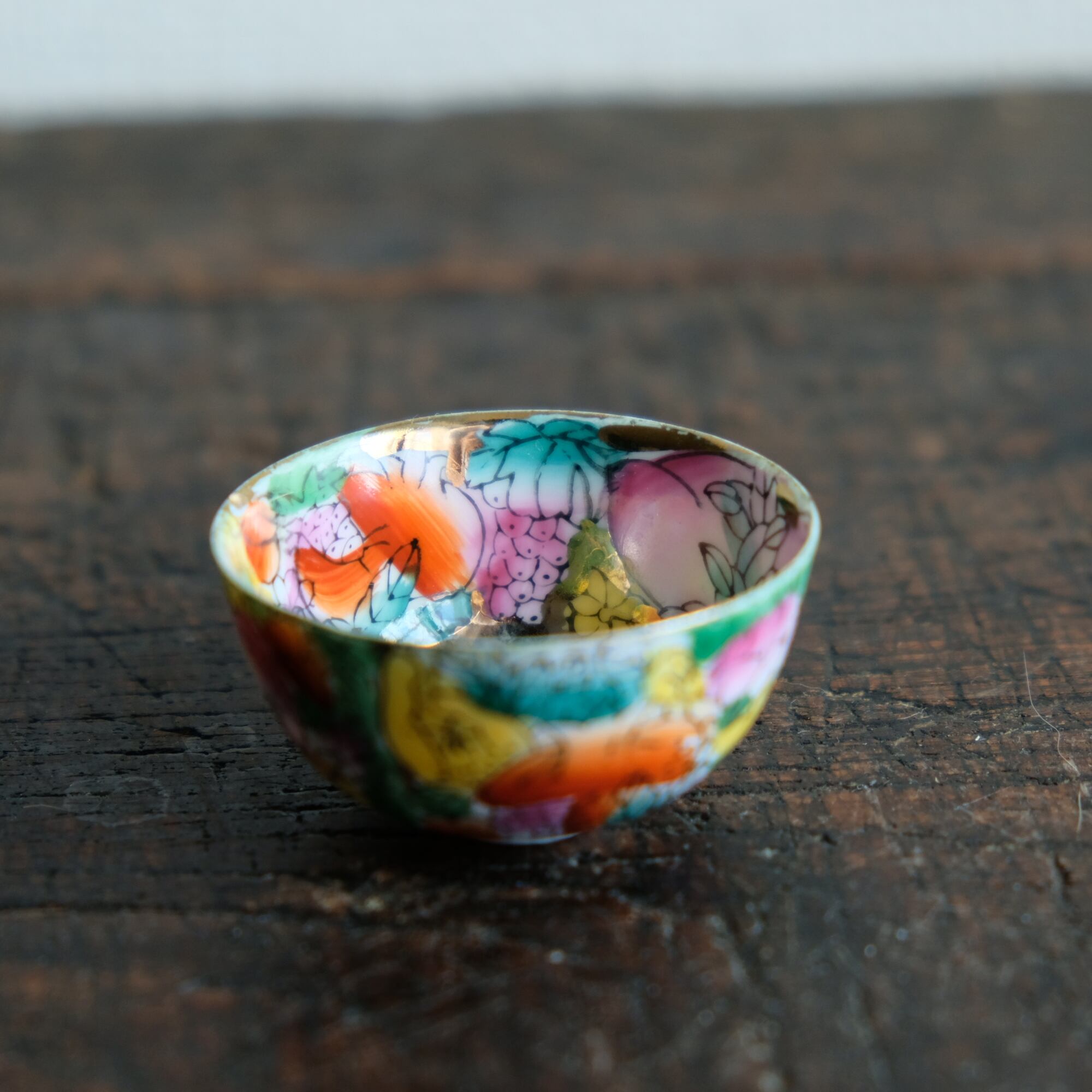 見込みに皇女◆カラフルな花と果実。中国景徳鎮 チャイナレトロ 色絵金彩小ぶり猪口 シノワズリ H