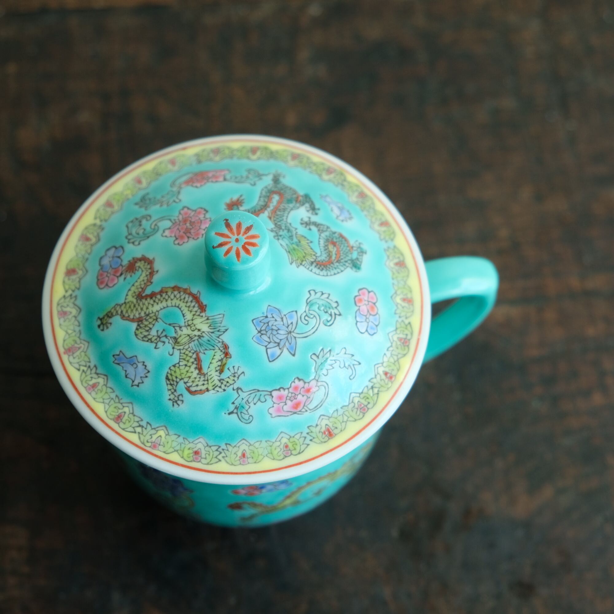 チャイナレトロで可愛い◆花と龍。中国景徳鎮 花文色絵蓋付マグ カップ 暮らしに。ヴィンテージ