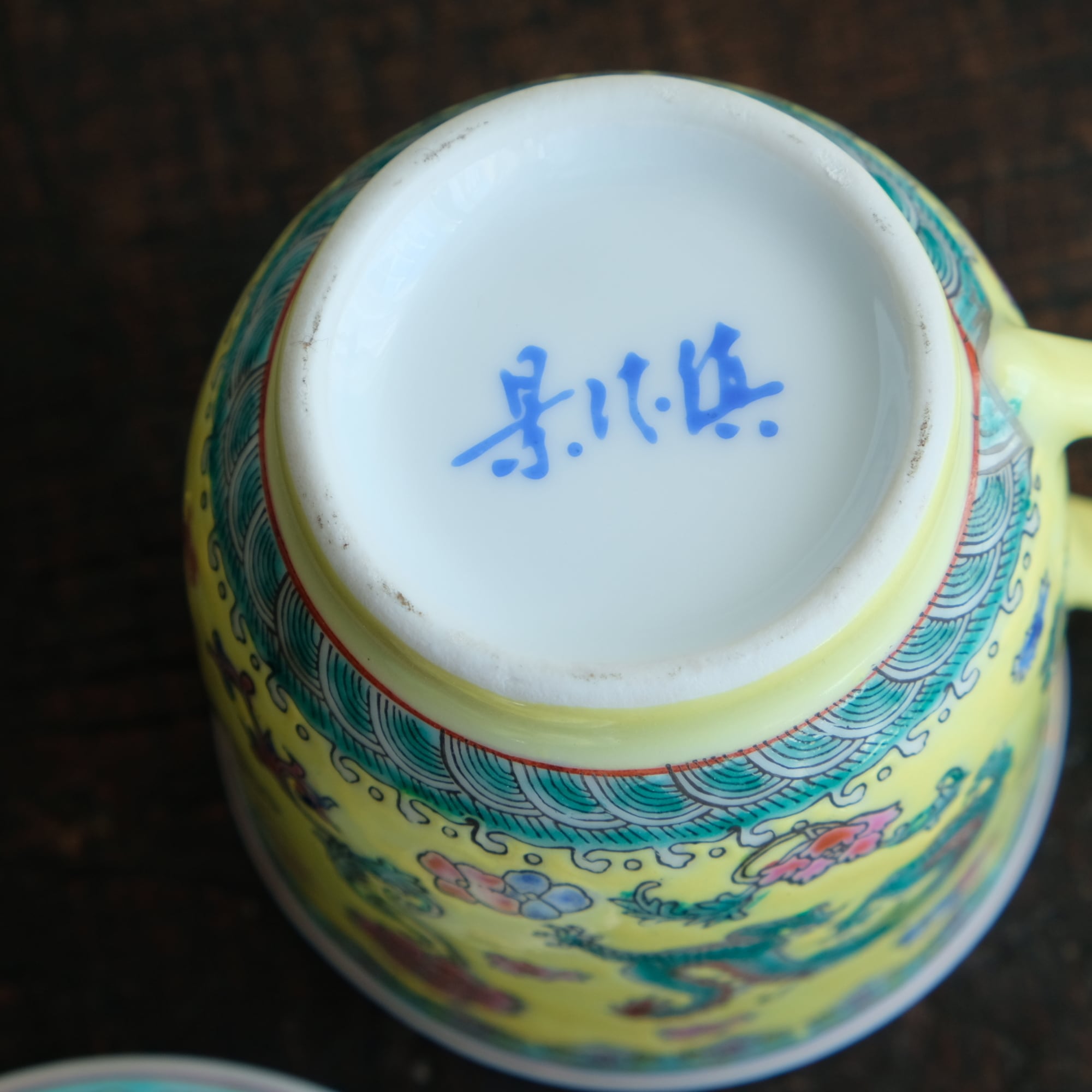 チャイナレトロで可愛い◆花と龍。中国景徳鎮 花文色絵蓋付マグ カップ 暮らしに。ヴィンテージ