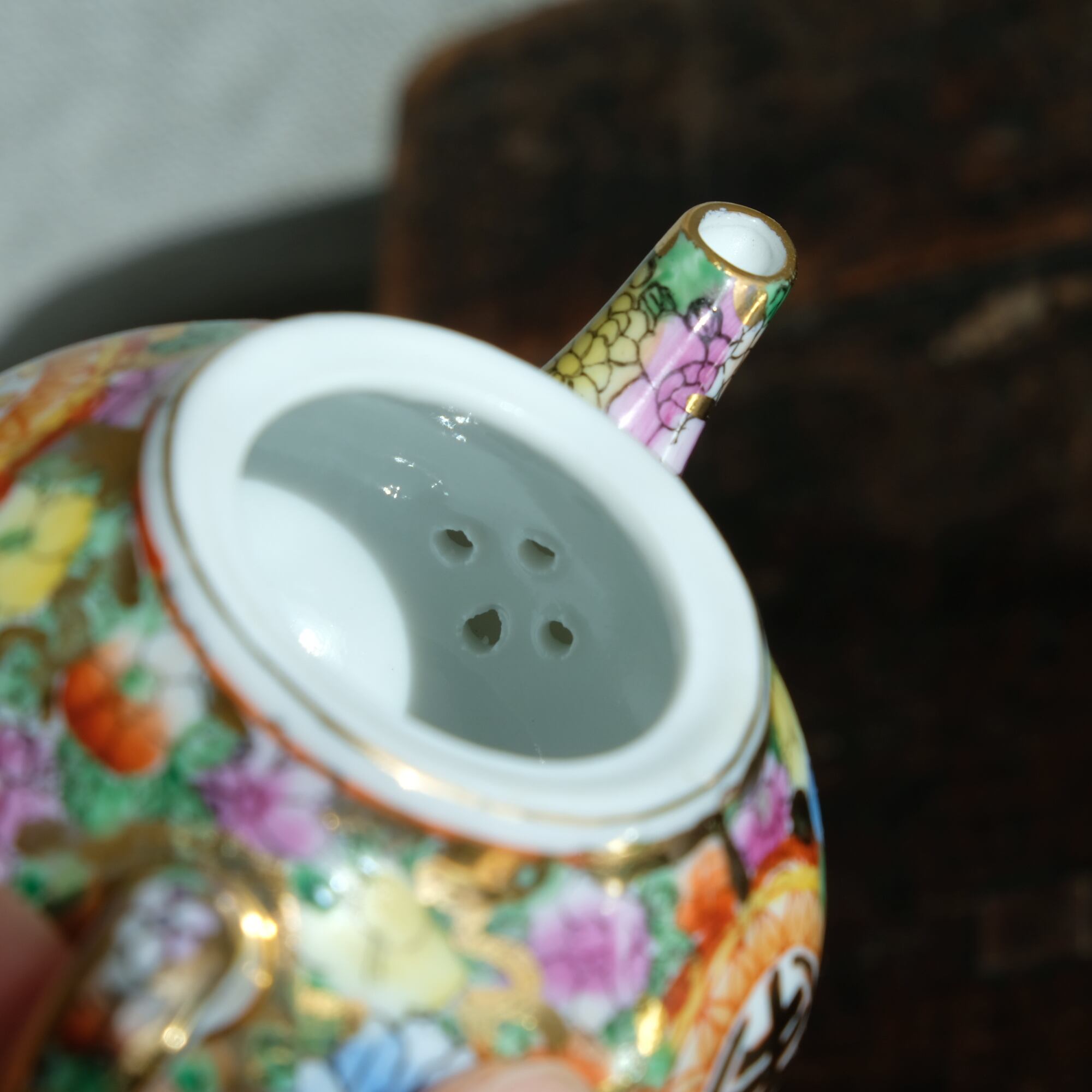 カラフルな花と漢字◆中国景徳鎮 色絵金彩小ぶりな急須 煎茶茶器 チャイナレトロ シノワズリ 寿 金