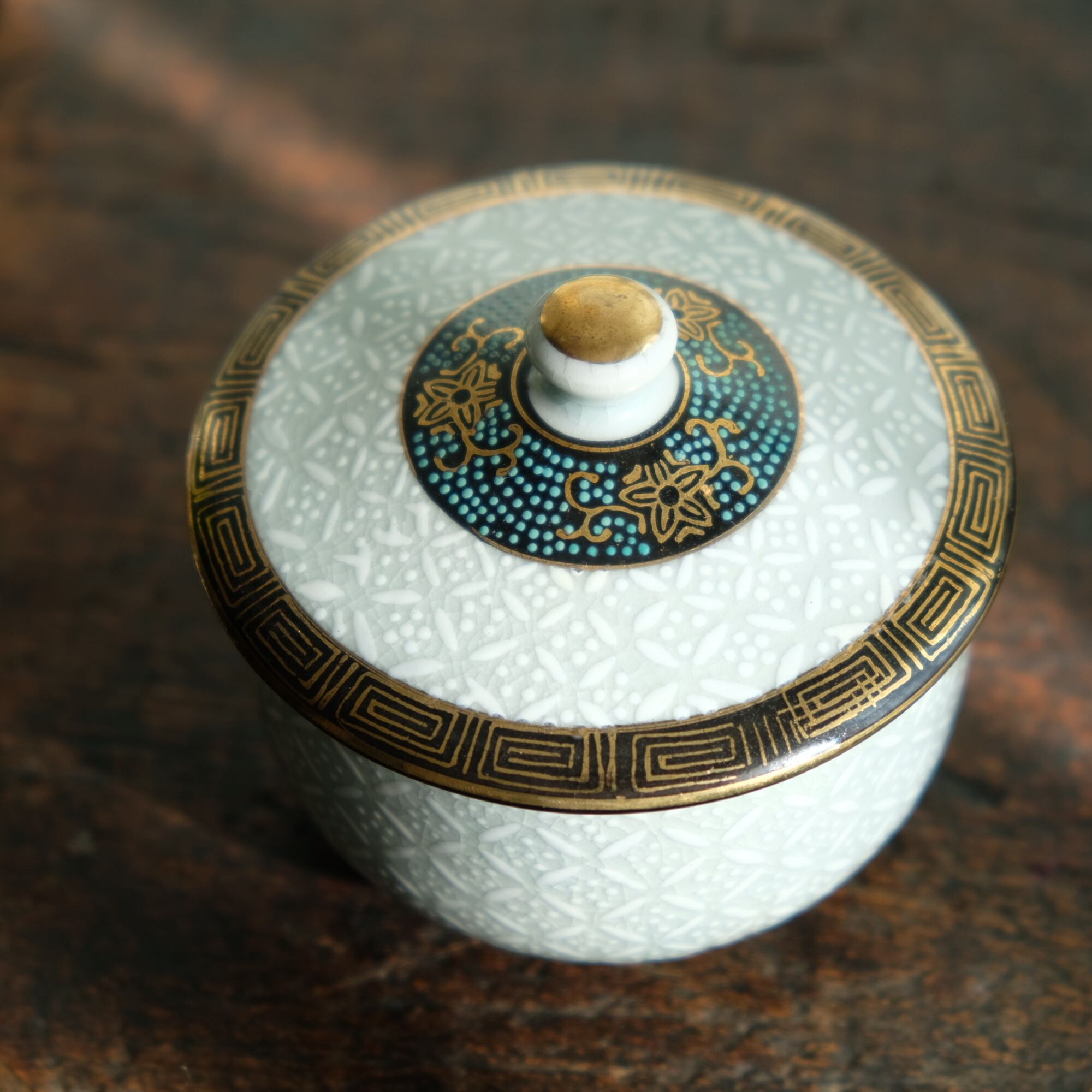 白い花文様の総柄◆青粒も素敵。九谷焼 青粒金彩蓋付湯呑み 丁寧な暮らしに。昭和レトロ 工芸品