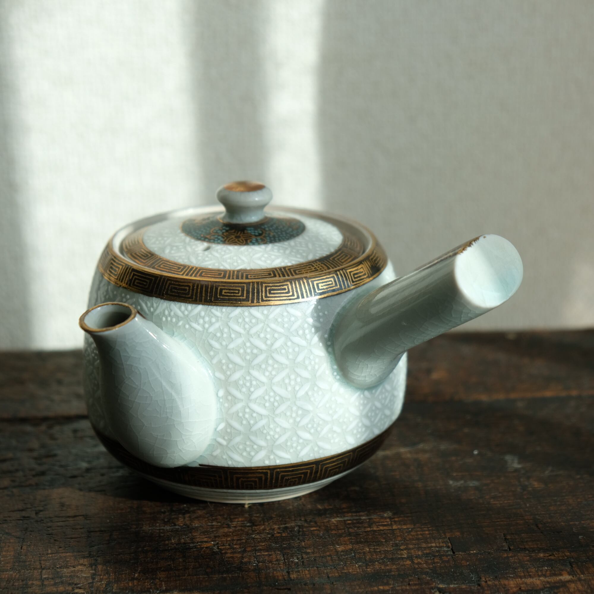 白い花文様で素敵◆九谷焼 青粒金彩急須 丁寧な暮らしに。茶器 昭和レトロ 工芸品