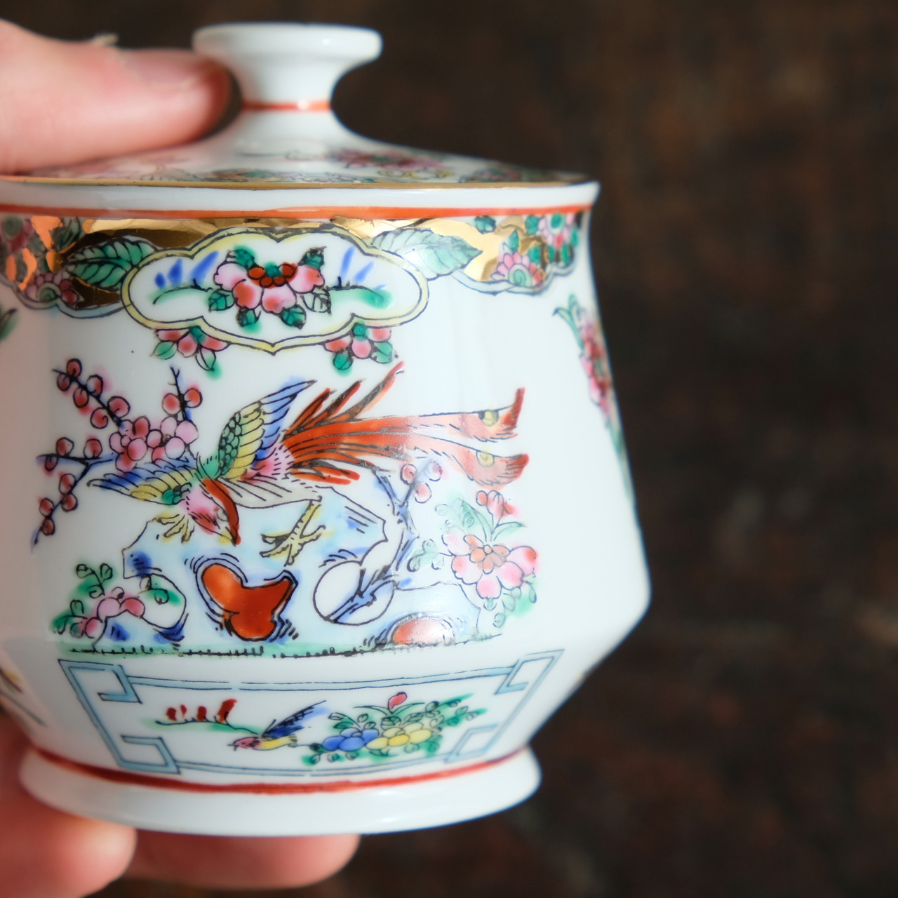 カラフルな花と鳥と蝶◆中国産 廣州彩瓷 色絵金彩シュガーポット チャイナレトロ シノワズリ