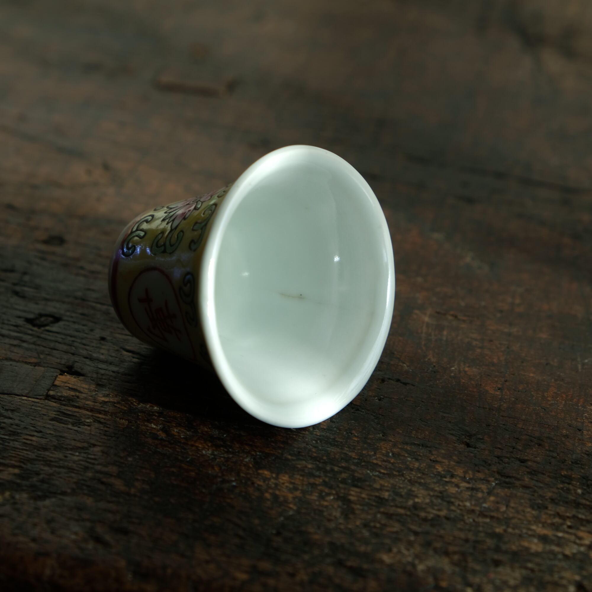 パステル調のカラーで可愛い◆万寿無疆 中国景徳鎮 色絵小ぶり猪口 茶杯 花唐草 漢字 チャイナレトロ 黄色