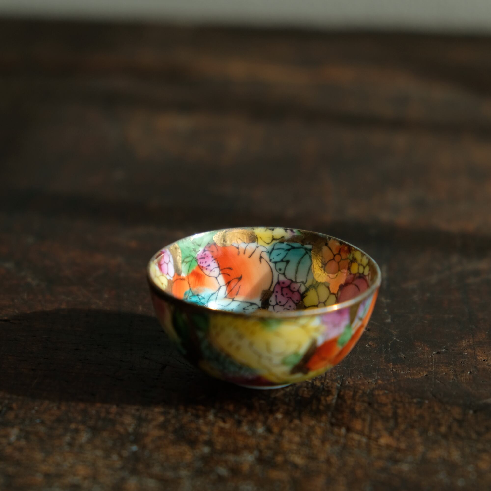 見込みに卯(兎)◆チャイナレトロで可愛い。中国景徳鎮 干支 色絵金彩小ぶり猪口 花や果実 シノワズリ