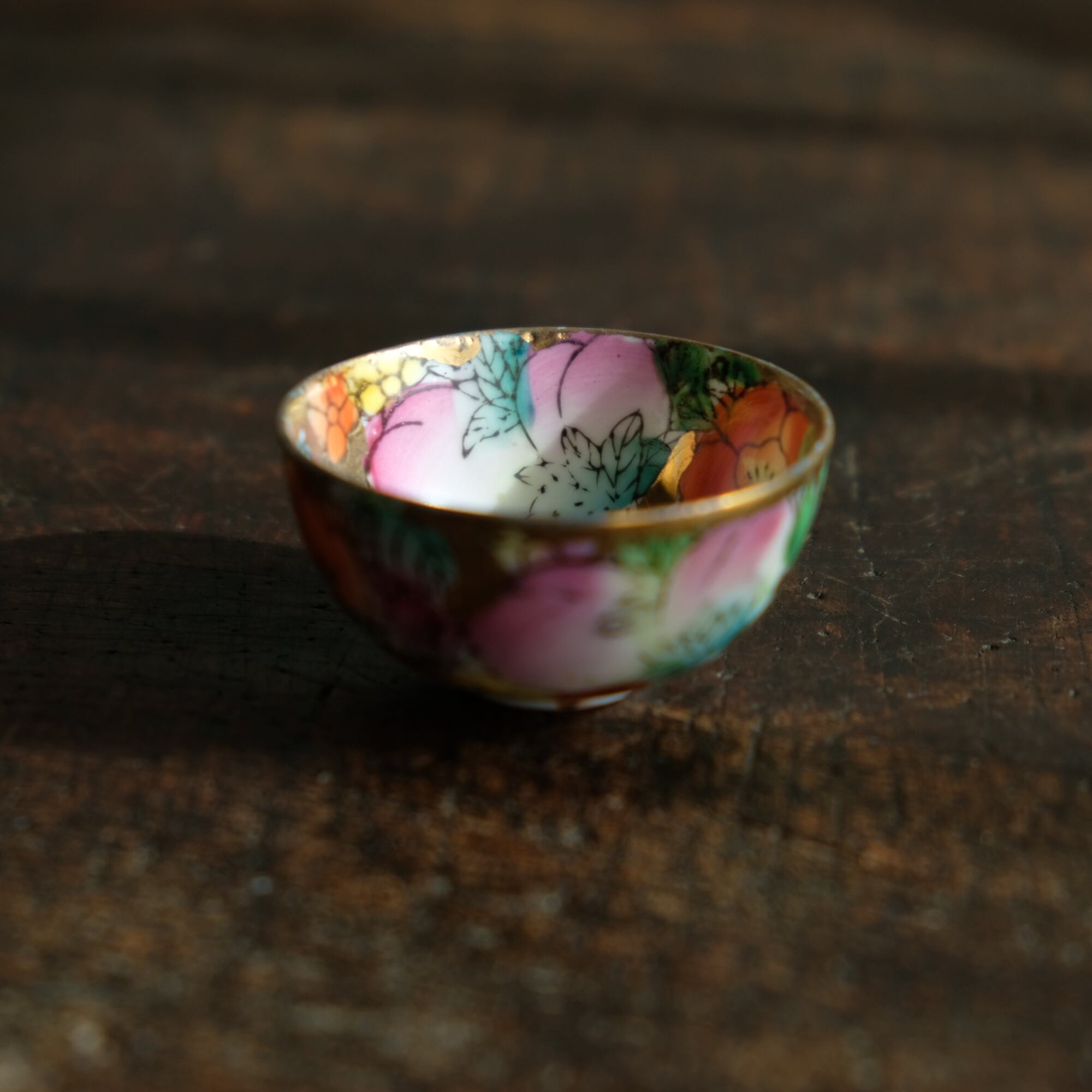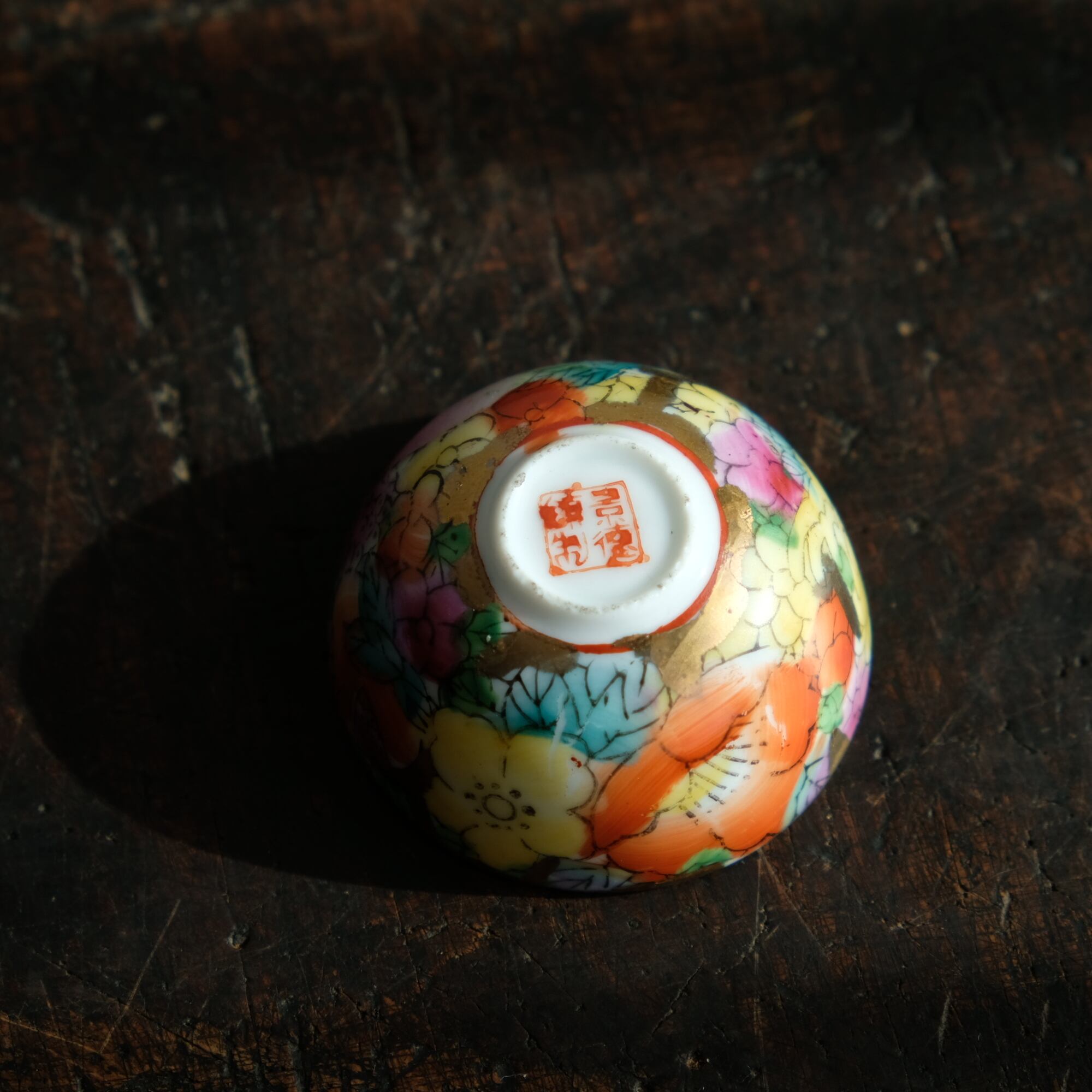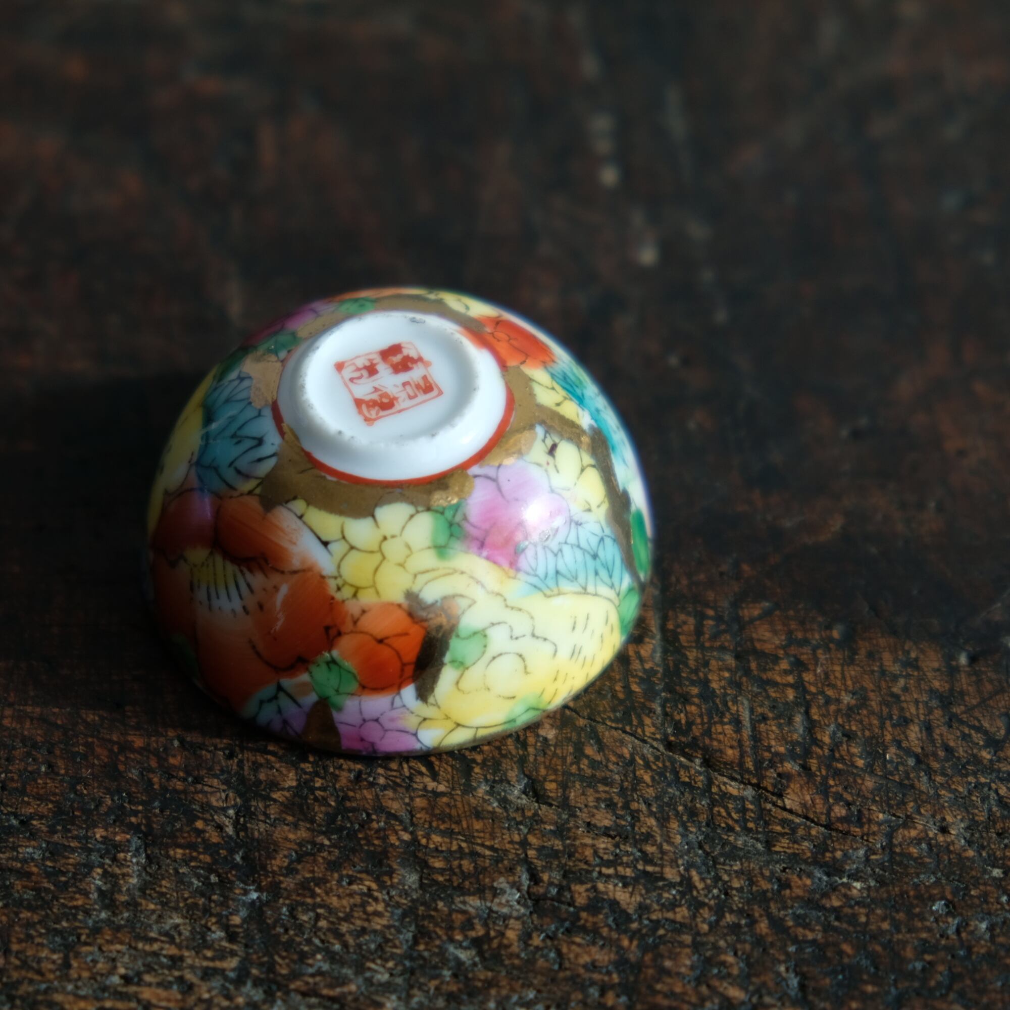 見込みに申(猿)◆チャイナレトロで可愛い。中国景徳鎮 干支 色絵金彩小ぶり猪口 花と果実 シノワズリ