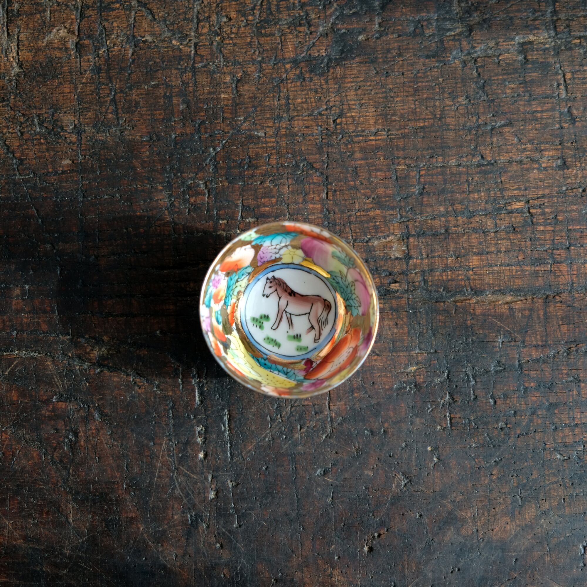 見込みに午(馬)◆チャイナレトロで可愛い。中国産 干支 色絵金彩小ぶり猪口 花や果実 シノワズリ