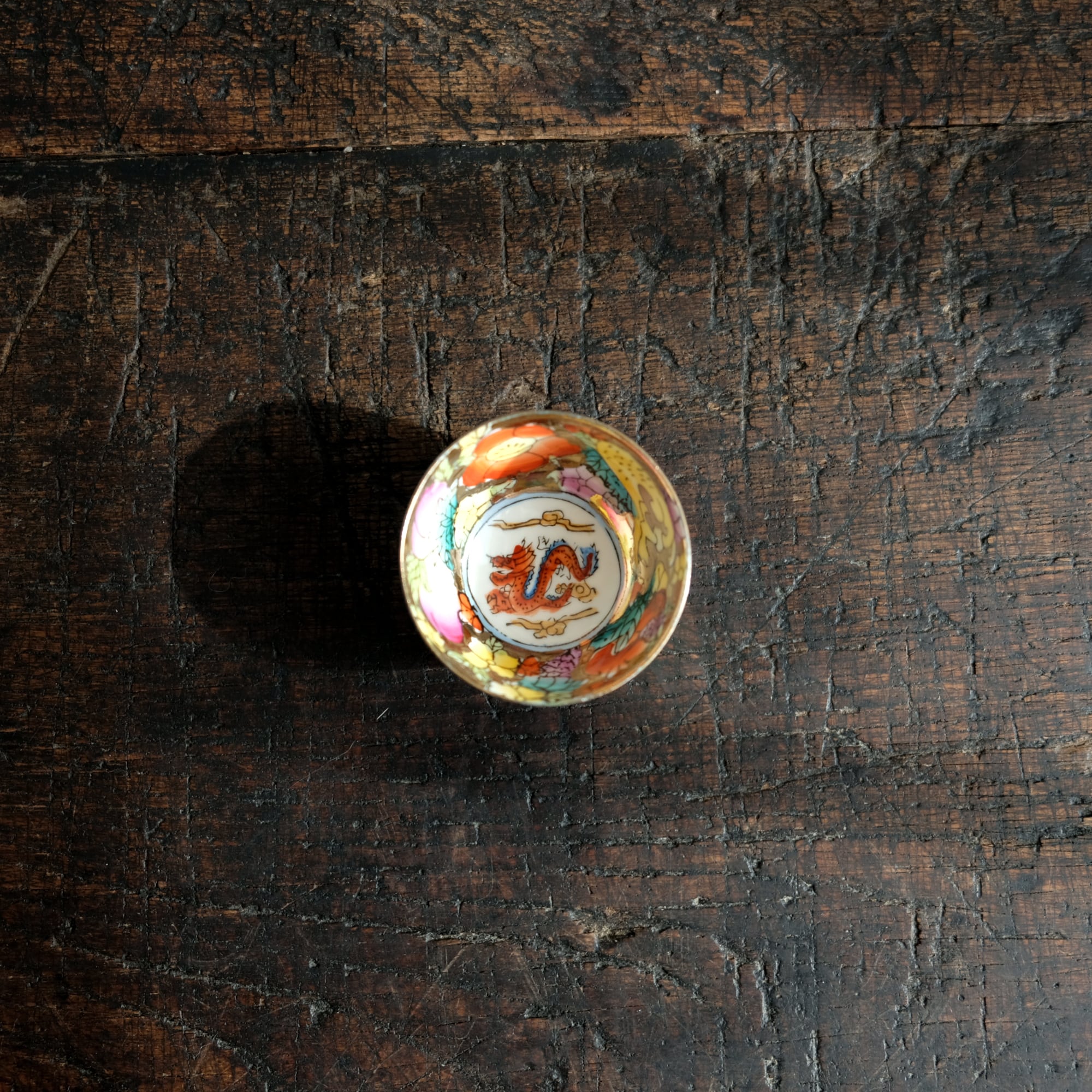 見込みに辰(龍)◆チャイナレトロで可愛い。中国産 干支 色絵金彩小ぶり猪口 花や果実 シノワズリ