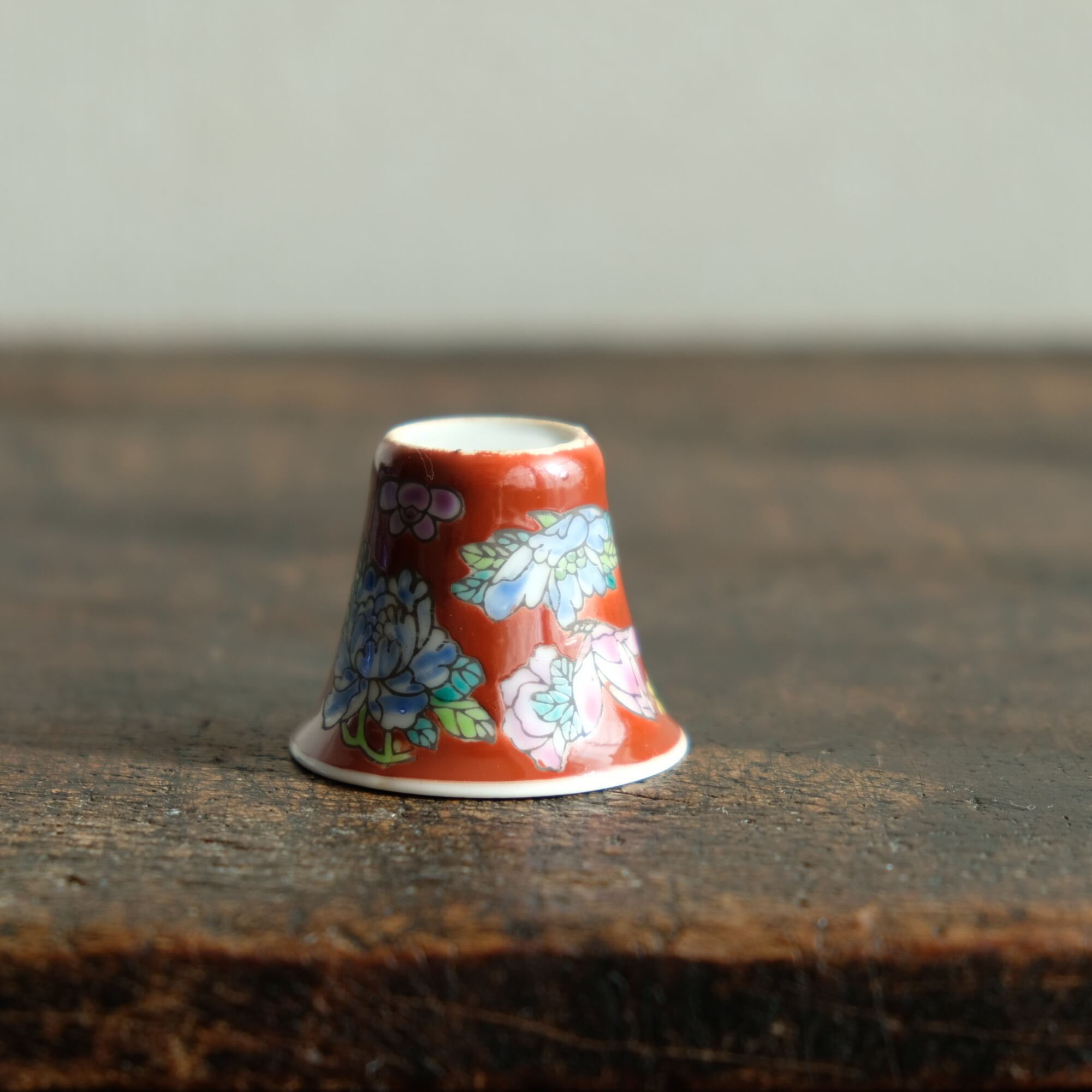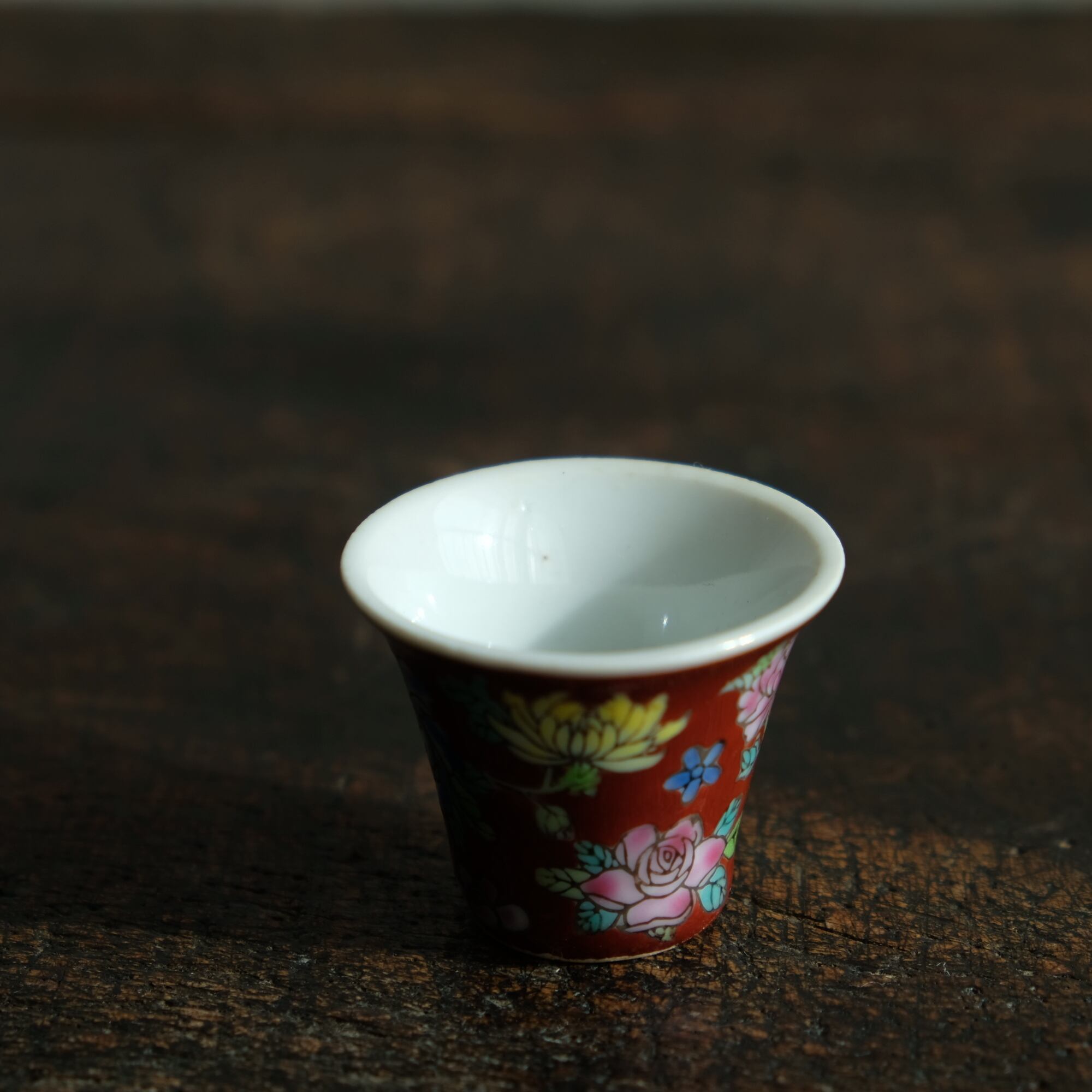 カラフルな草花◆チャイナレトロで可愛い。中国産 色絵小ぶり猪口 茶杯 燕脂色 インテリア