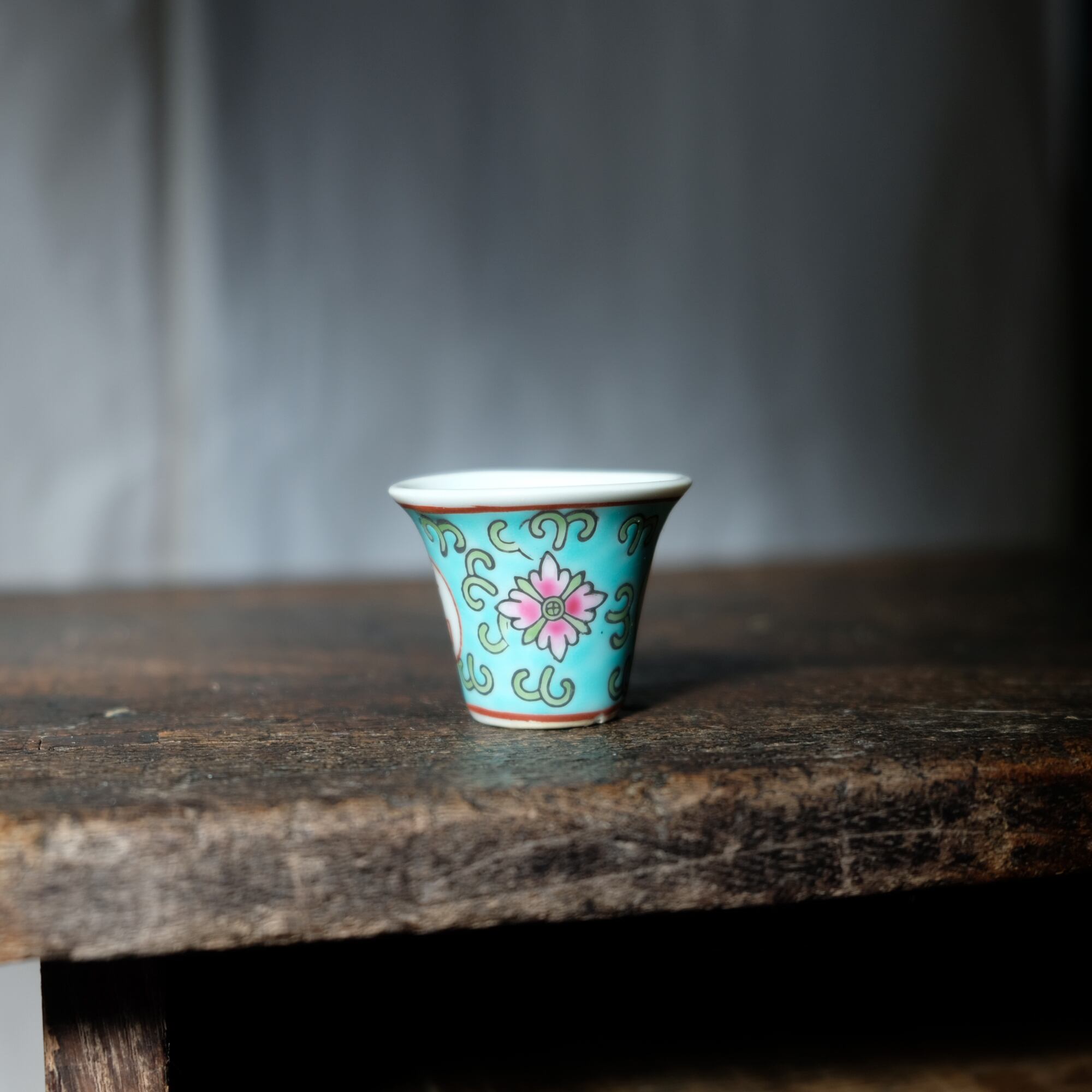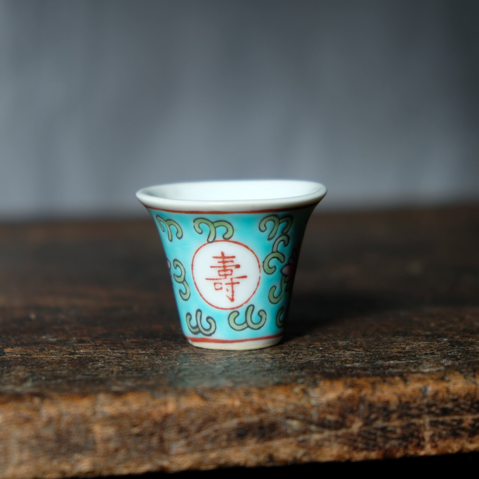 花唐草と漢字◆万寿無疆 中国景徳鎮 色絵小ぶり猪口 茶杯 茶器 花唐草 チャイナレトロ グリーン