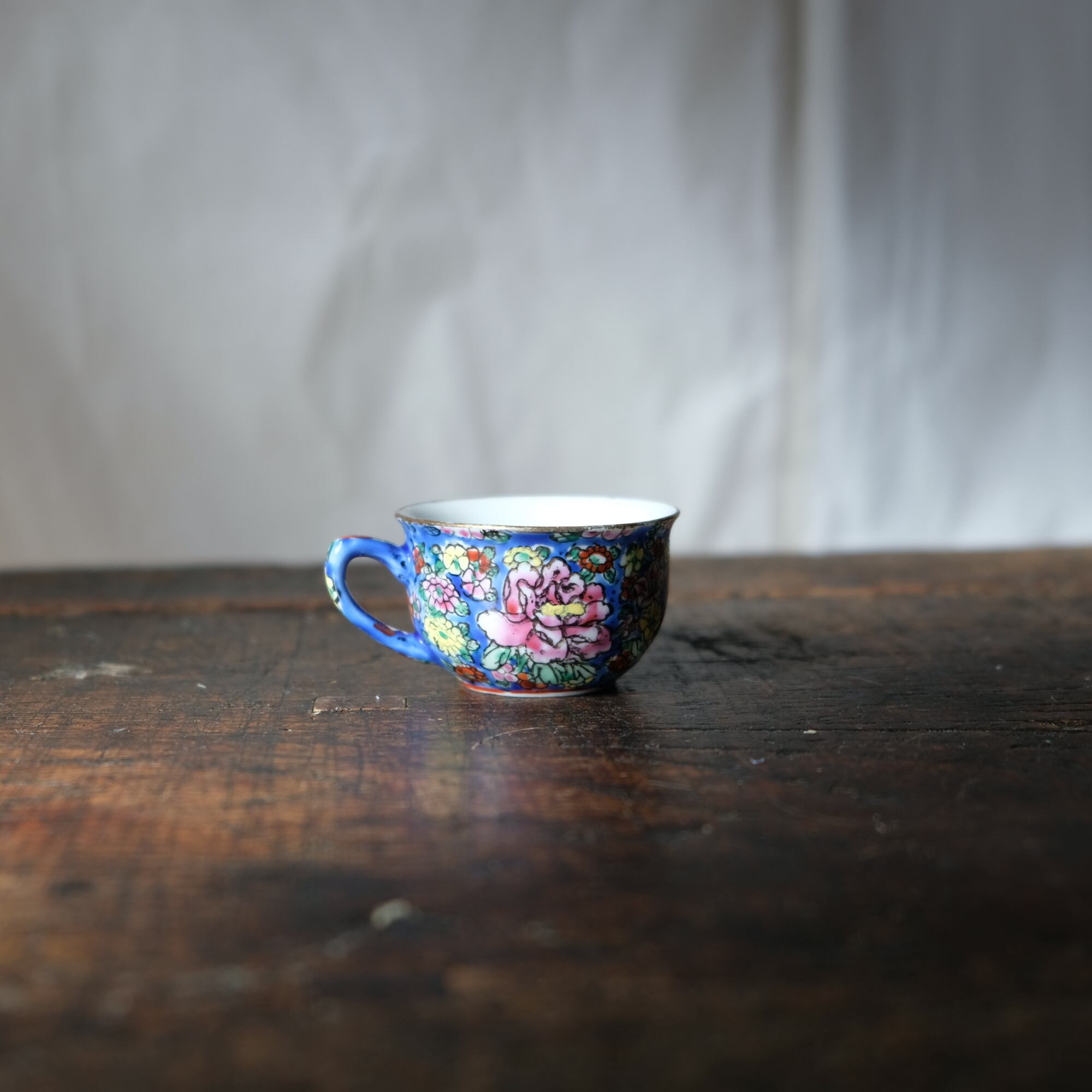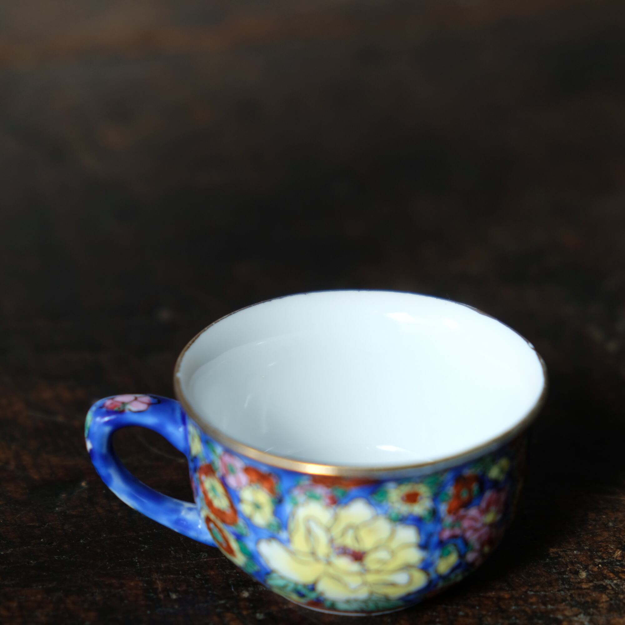 鮮やかな青にカラフルな花尽くし◆中国産 色絵金彩小ぶりカップ 茶器 チャイナレトロ シノワズリ